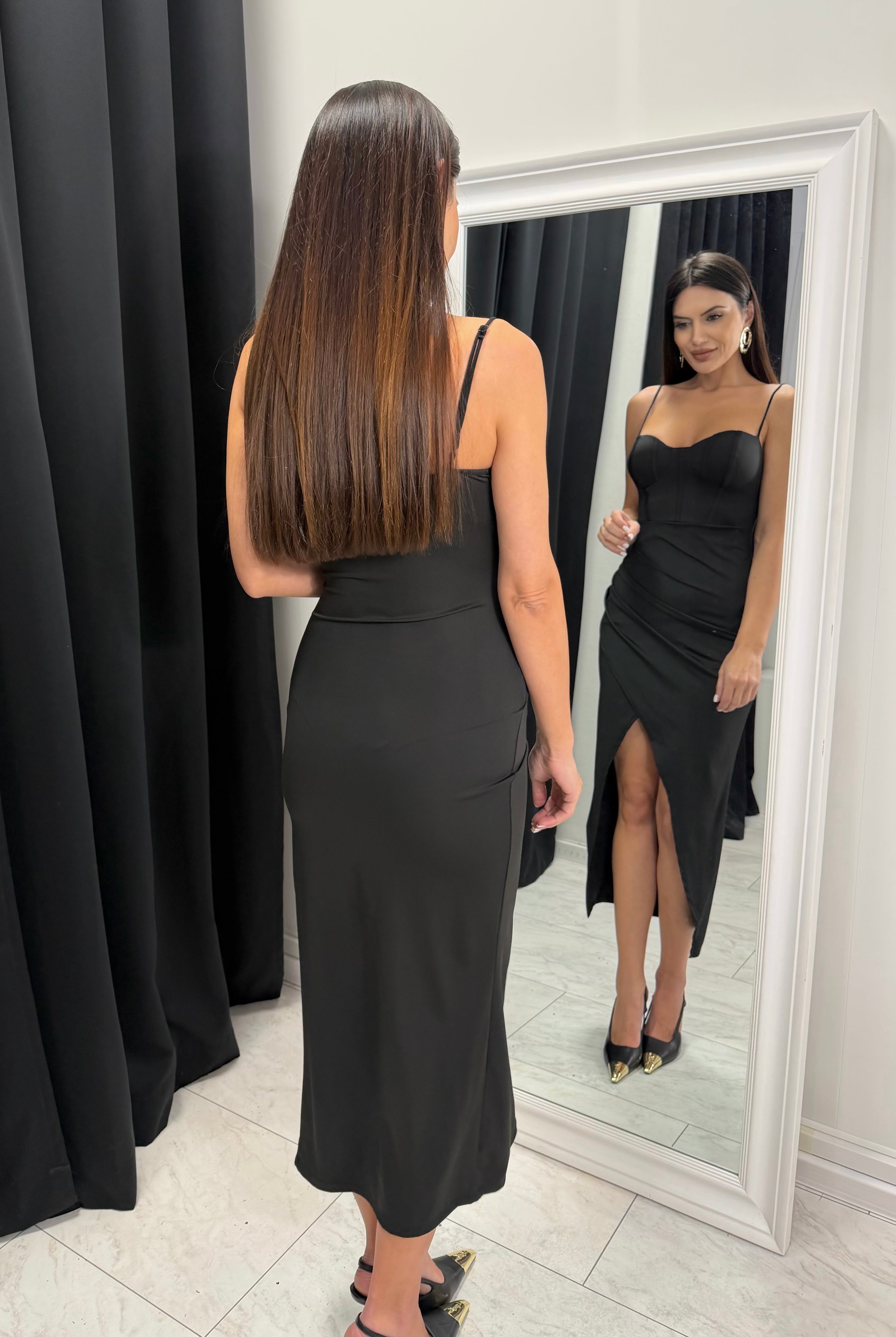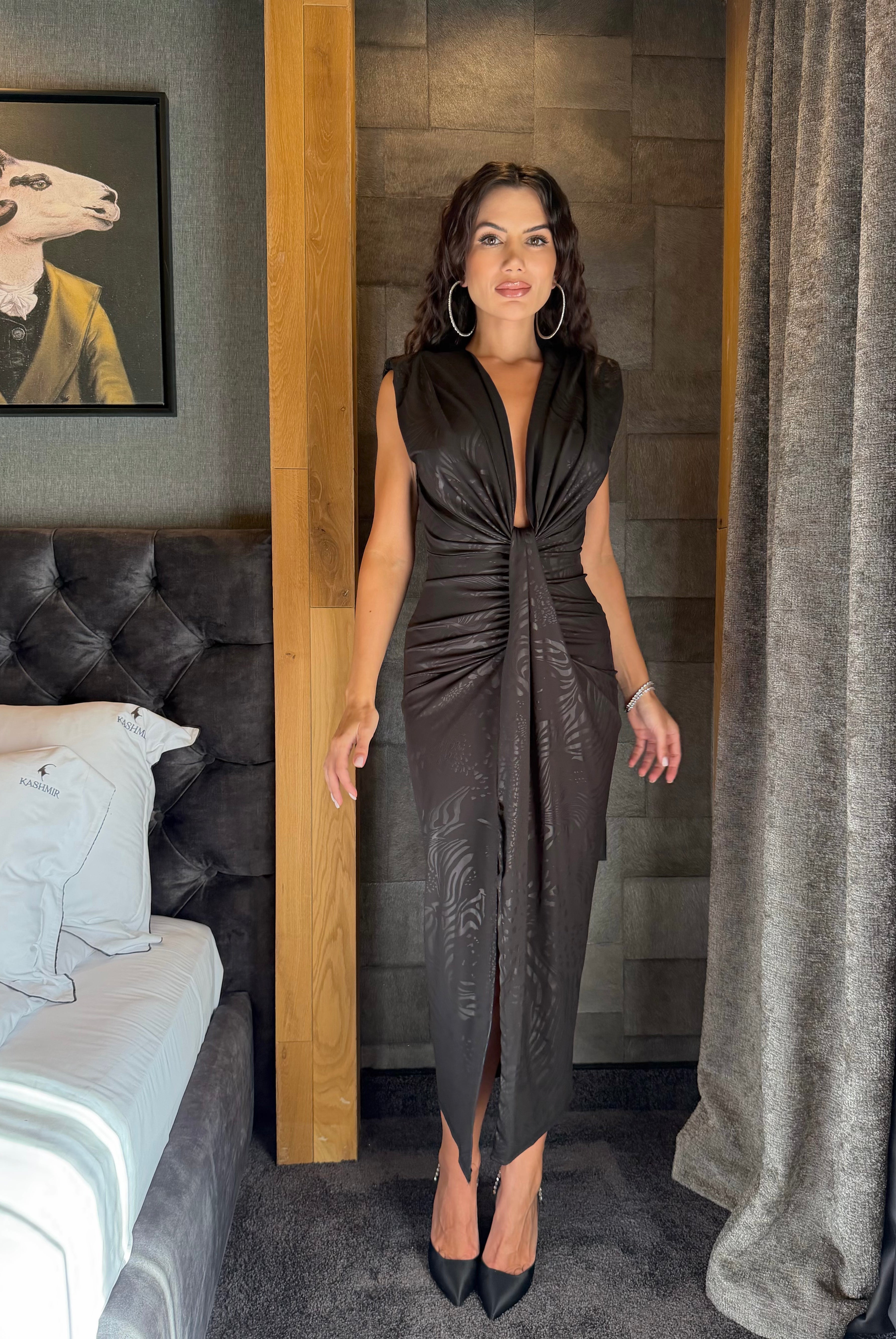 РОКЛЯ BLACK VELVET - драпирана рокля със златен акцент