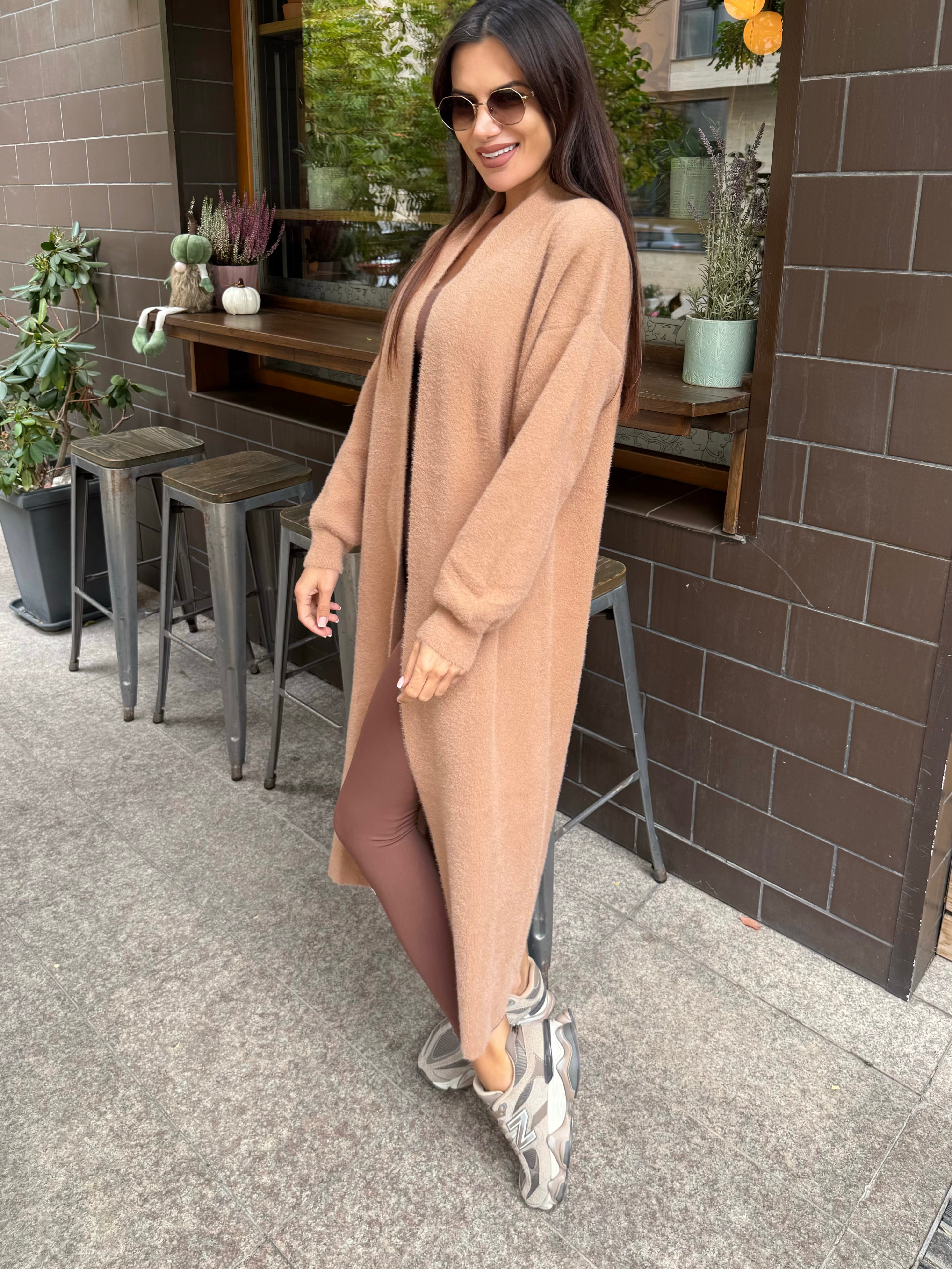 Дълга жилетка в модерен камел нюанс, вдъхновен от есенните класики. Подходяща за градски стил, придава премиум излъчване и топлина.