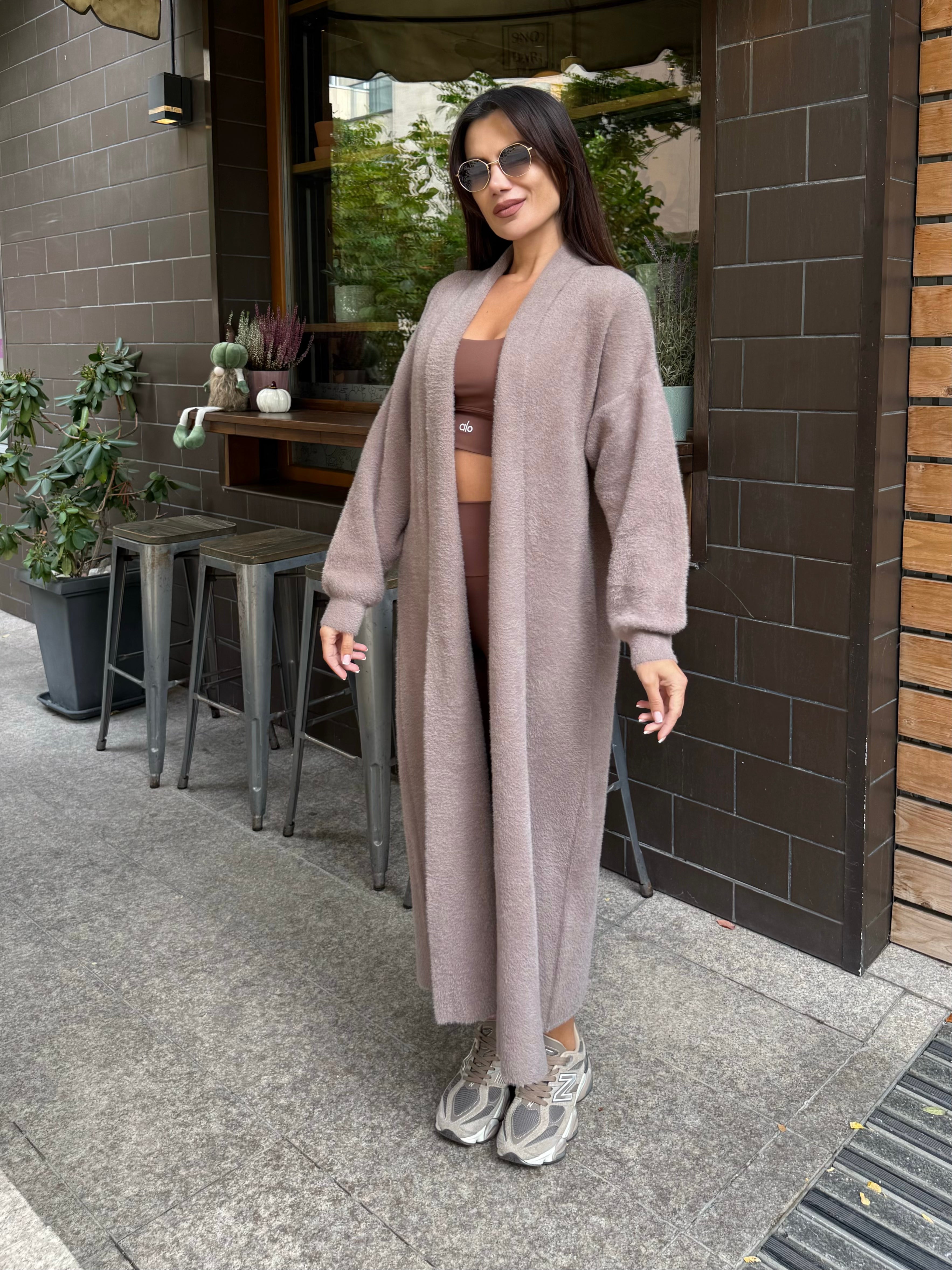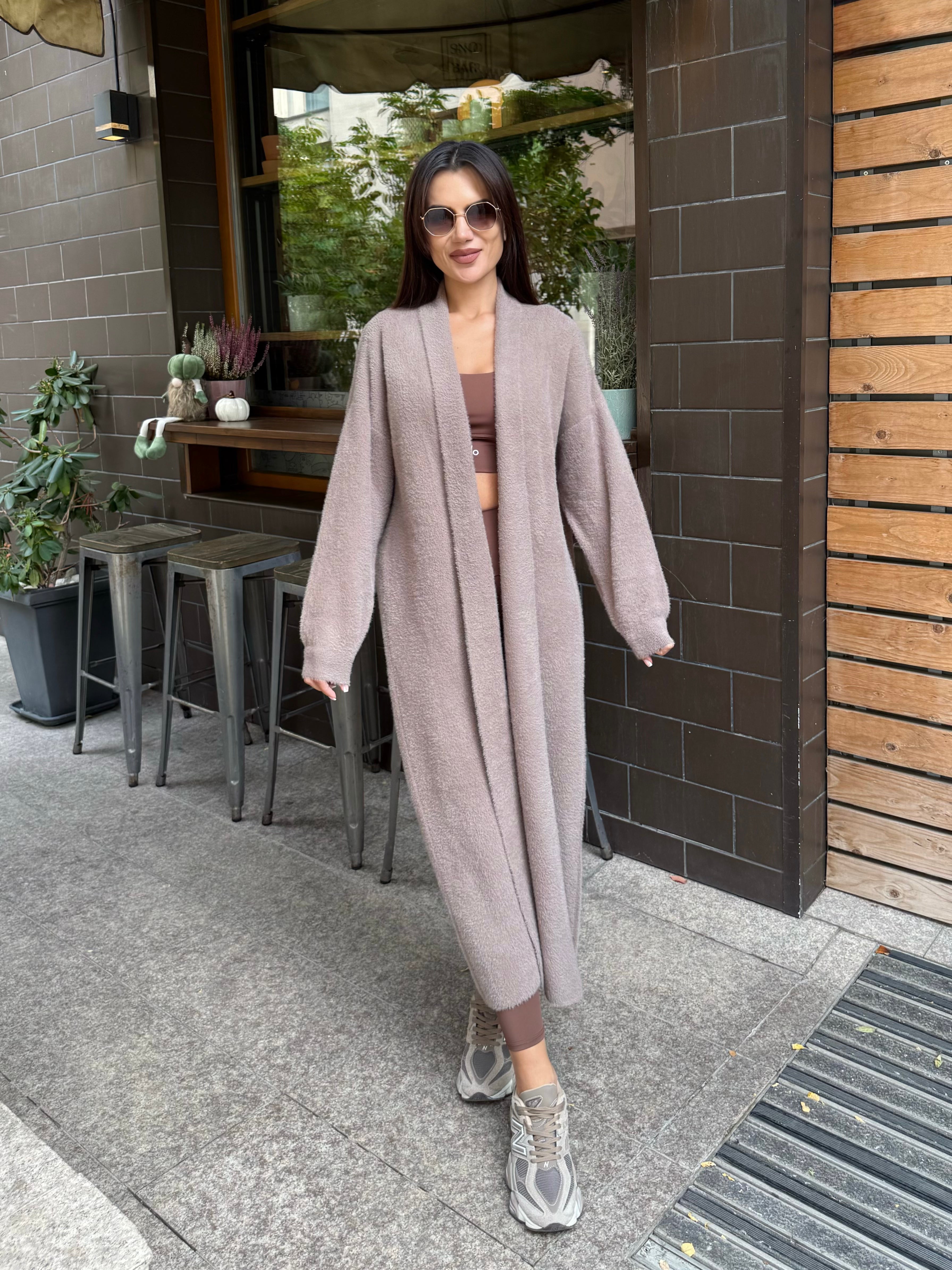 Елегантна дълга жилетка в изискан нюанс мока. Добавя топлина и стил към всекидневието, като лесно се комбинира с неутрални или по-ярки тонове.