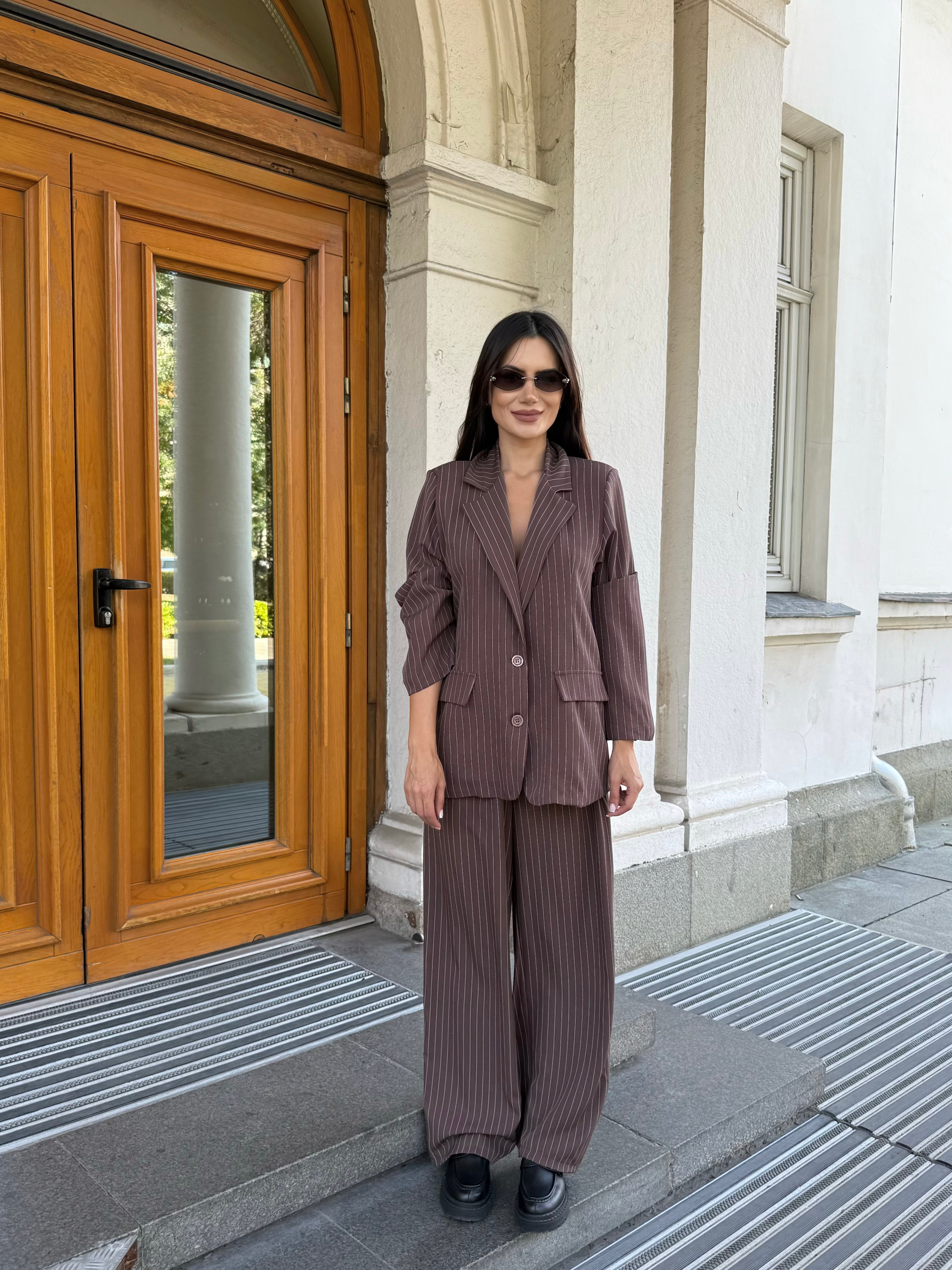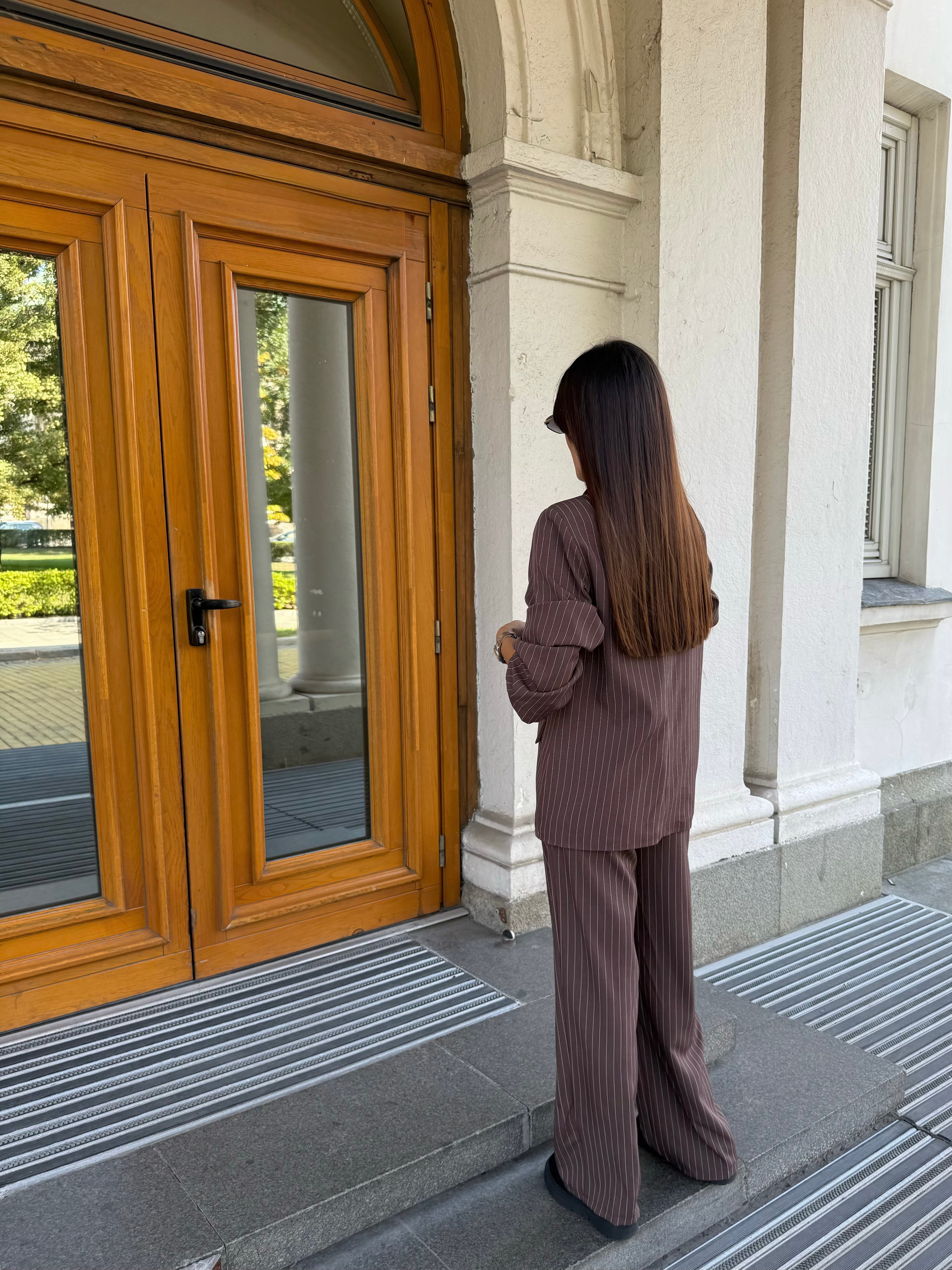 Стилен дамски костюм в кафяво райе – сако със свободна кройка и колан за подчертаване на талията, комбиниран с прав панталон с висока талия и ластик в задната част за комфорт. Изчистена линия, която съчетава елегантност и удобство – перфектен избор за бизнес визии, официални поводи или модерно ежедневно носене.