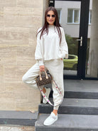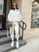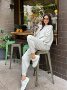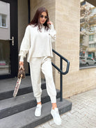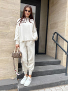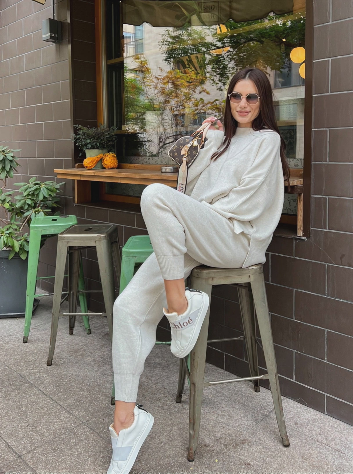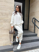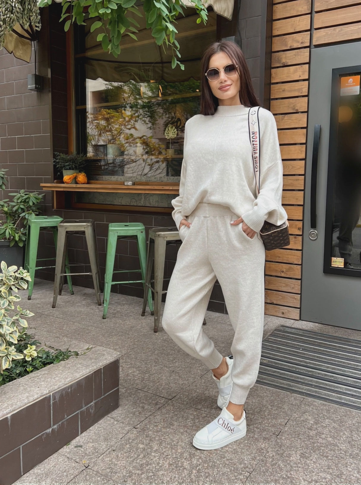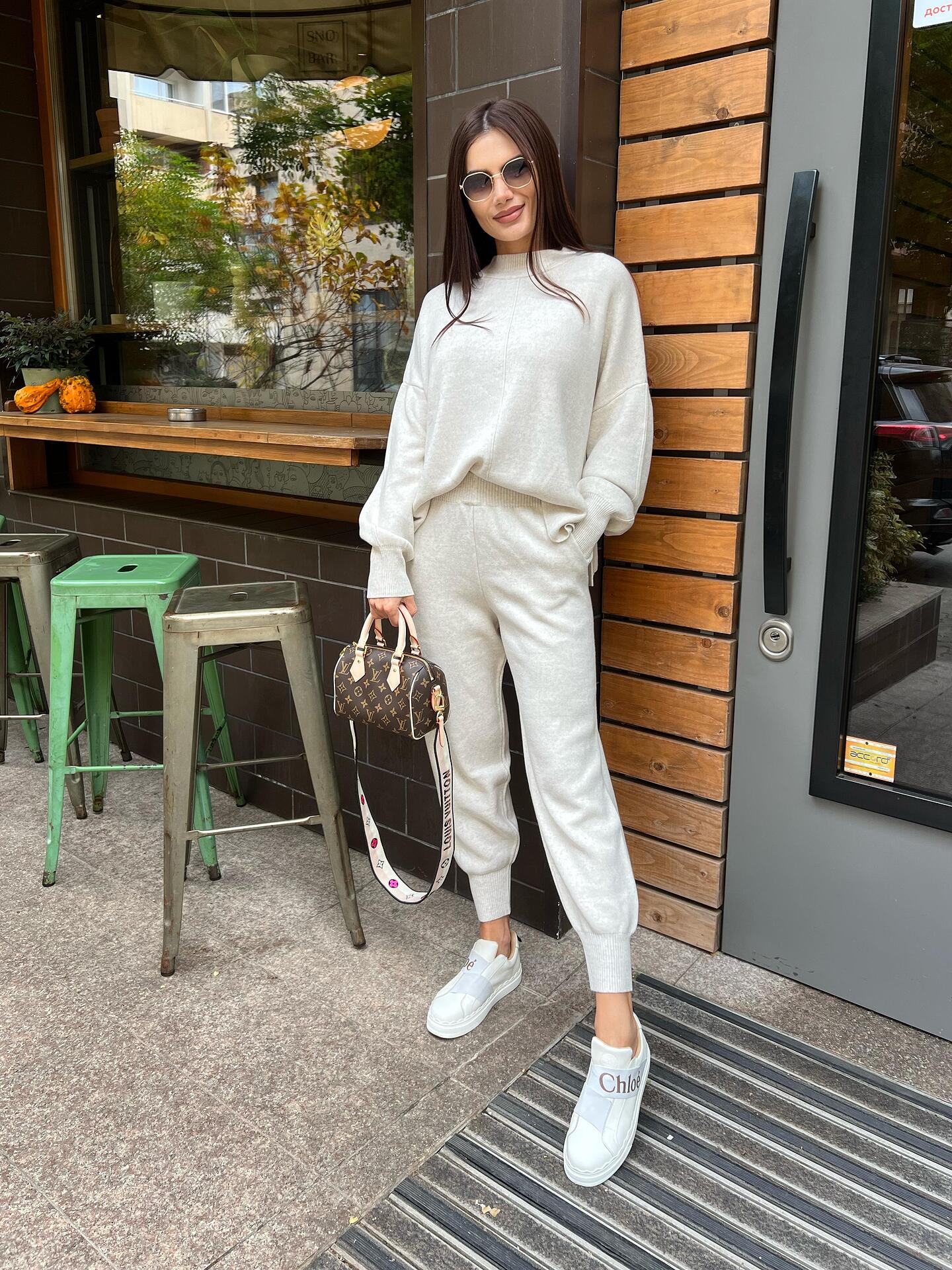 Комплект от две части – блуза с обло деколте и панталон с висока талия, изработени от фино стегнато машинно плетиво с високо качество и мек допир.