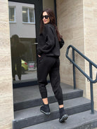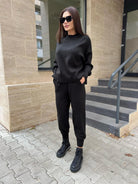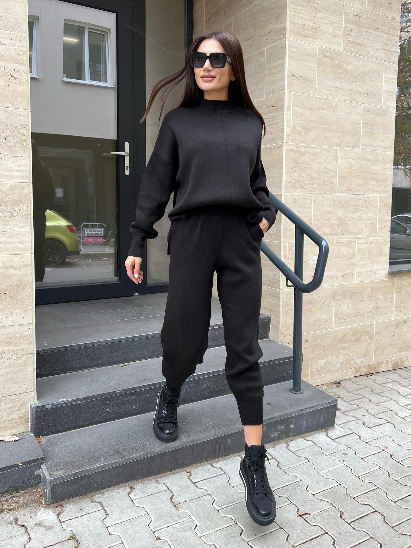 Комплект от две части – блуза с обло деколте и панталон с висока талия, изработени от фино стегнато машинно плетиво с високо качество и мек допир.
