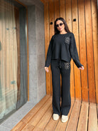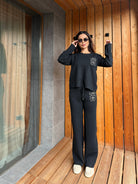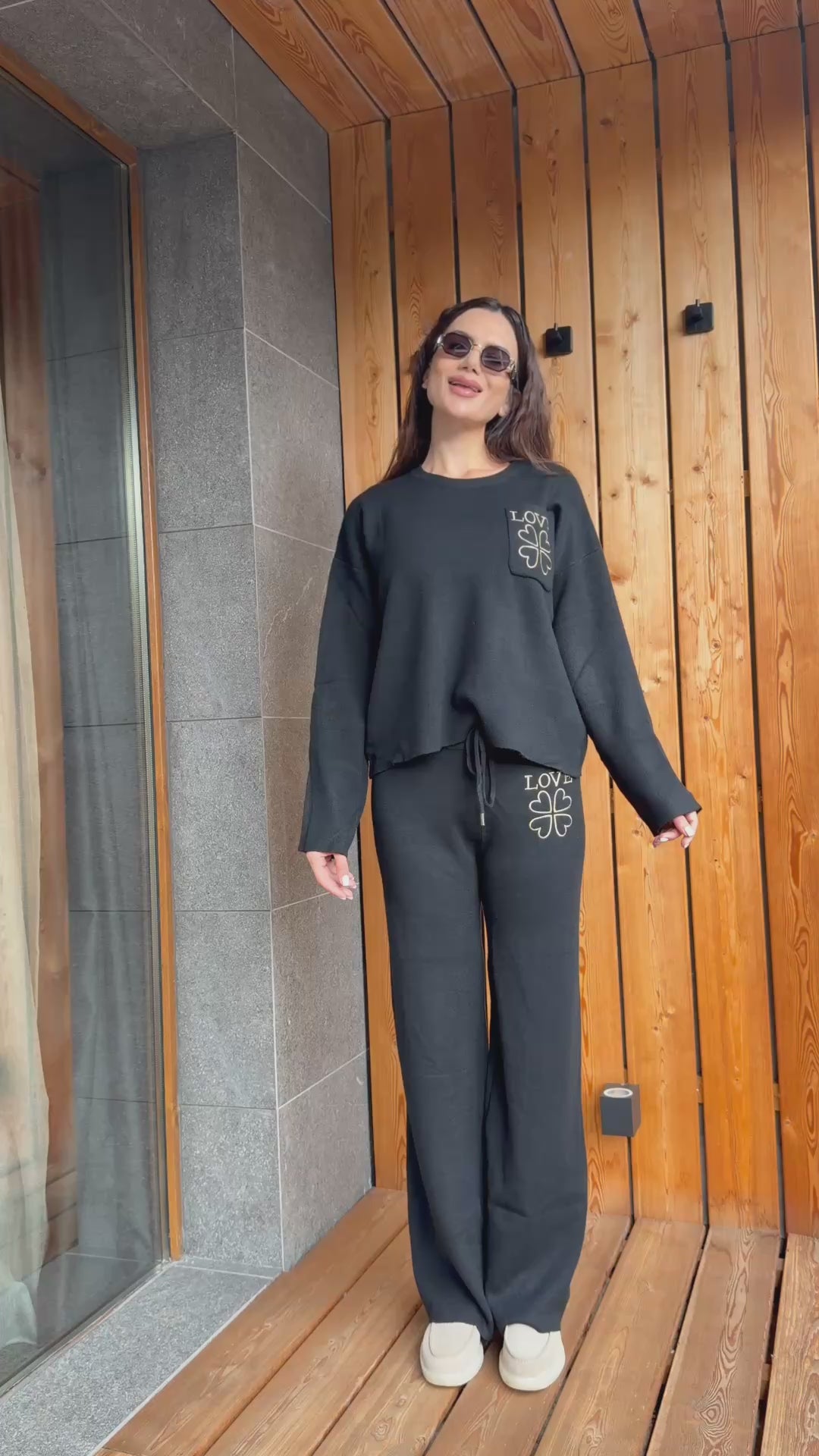 Елегантен и комфортен комплект от мека плетена материя, състоящ се от горна част с връзки на талията и избродиран надпис LOVE с детайл във формата на четирилистна детелина. Панталонът е с висока талия, връзки за регулиране и изчистена линия, която издължава силуета.
