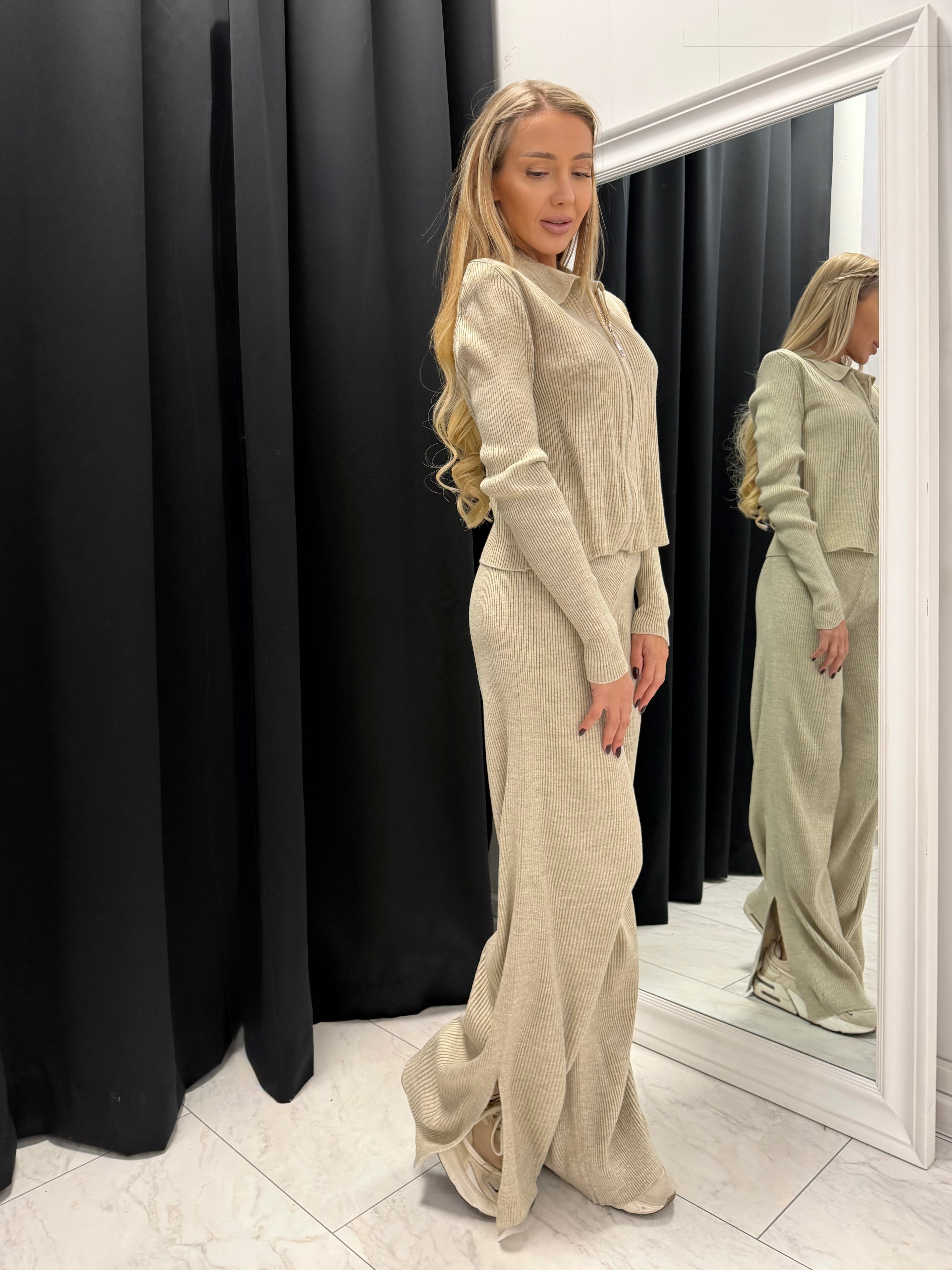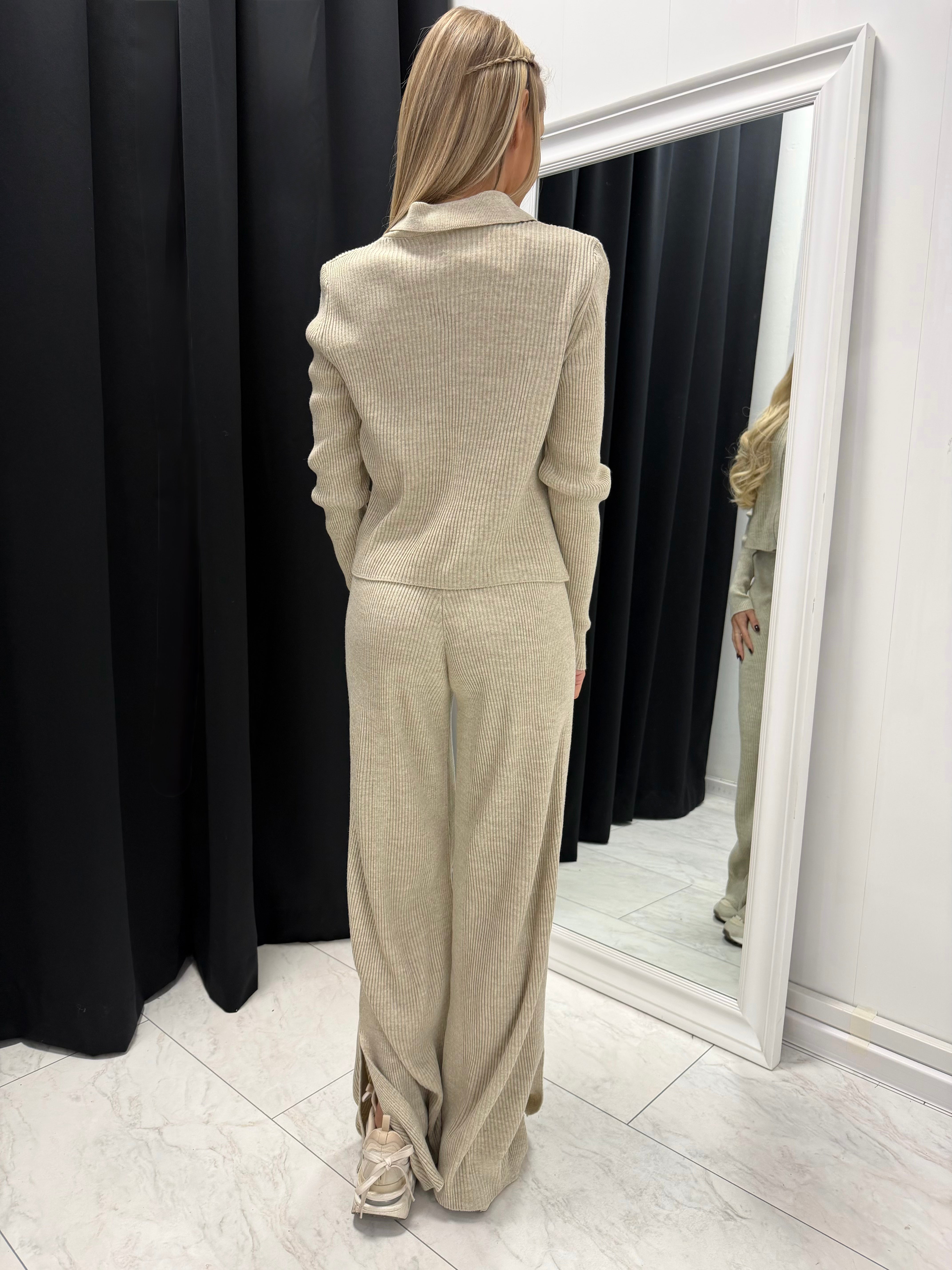 Стилен, минималистичен и изключително удобен комплект от мека рипсена материя. Горната част е с изчистен силует, яка и цип, което придава модерна линия и позволява лесно стилизиране. Панталонът е с прав крачол и елегантни цепки в долната част, които издължават визуално крака и създават ефектен завършек при движение.