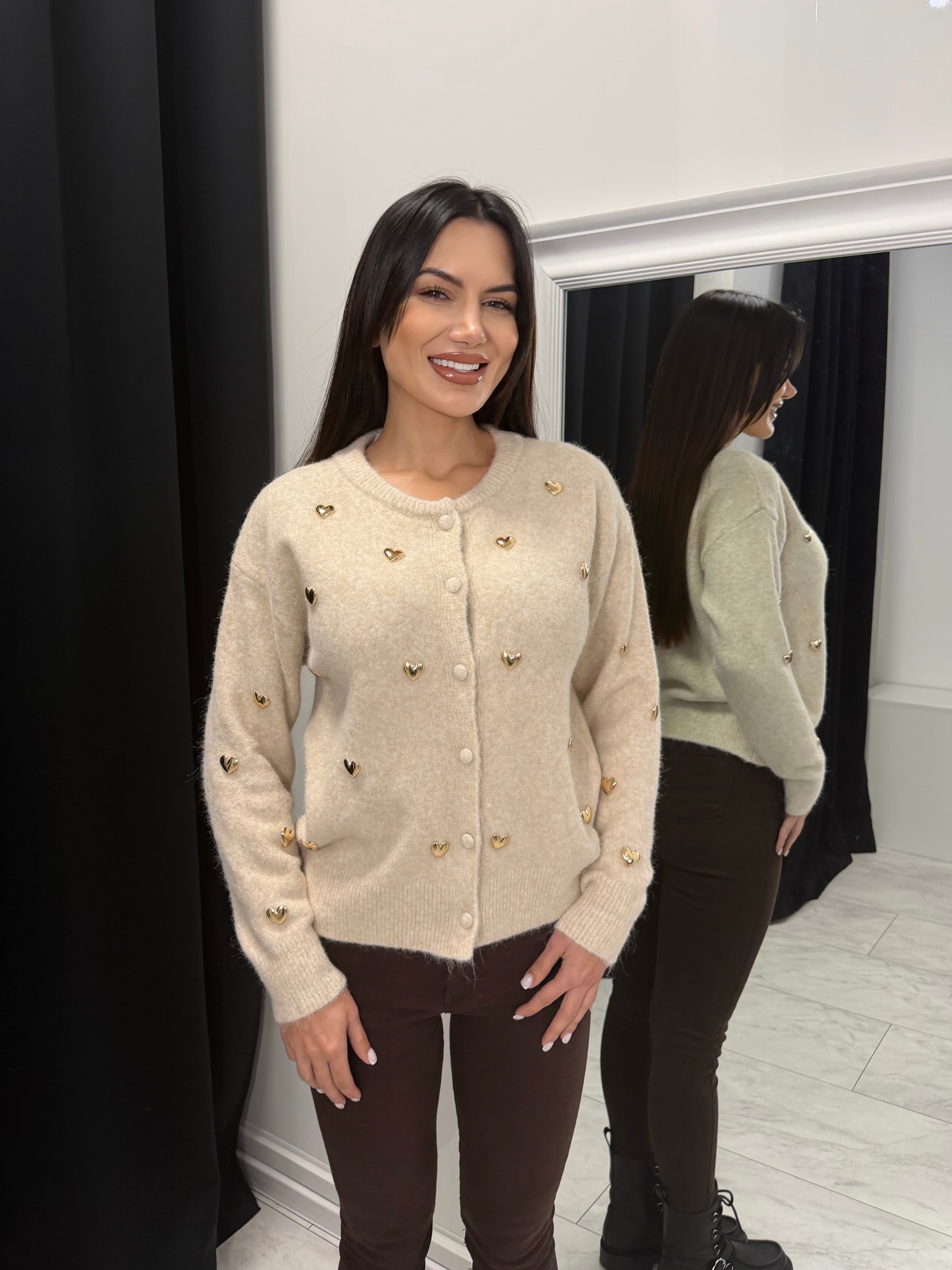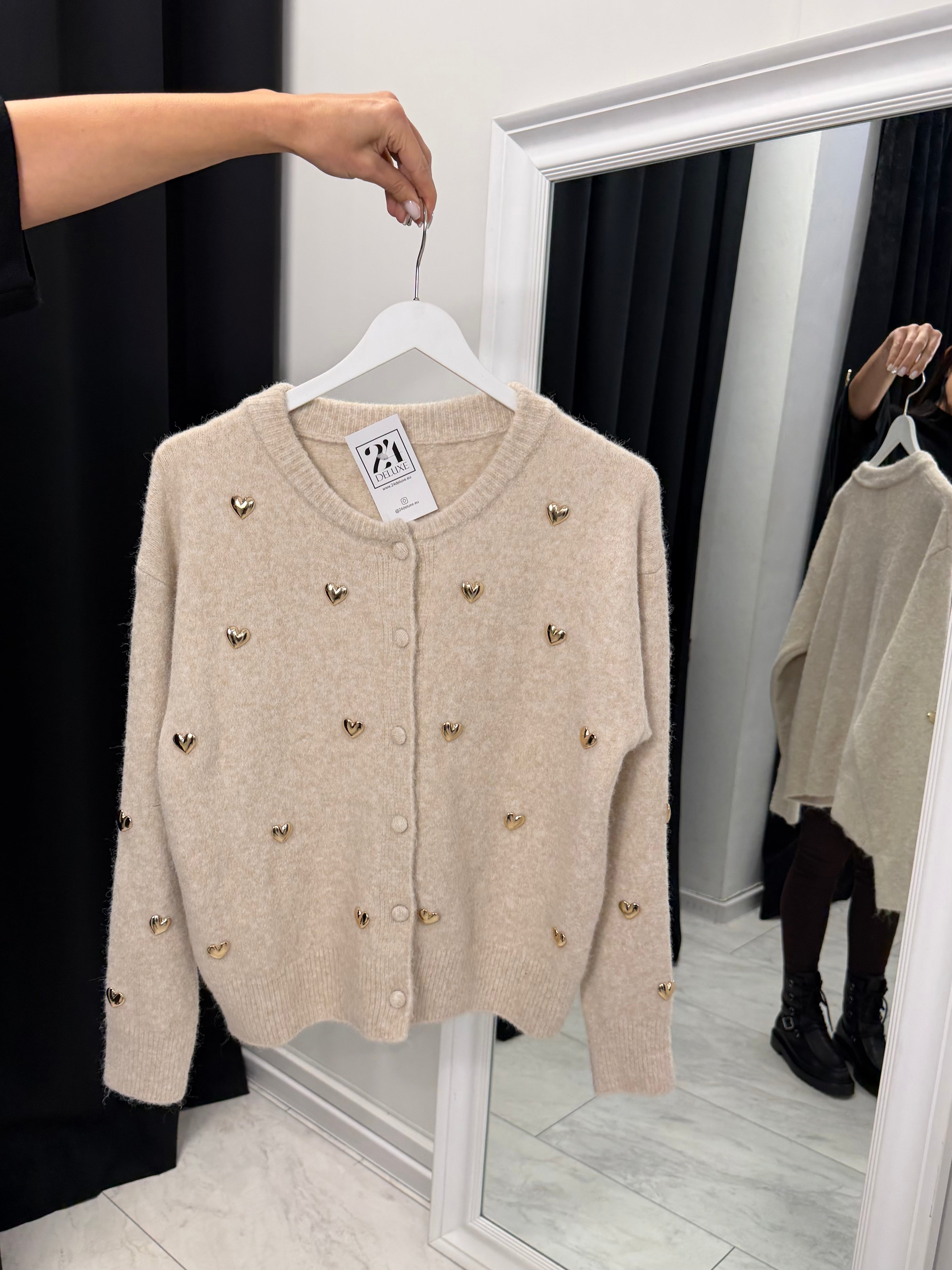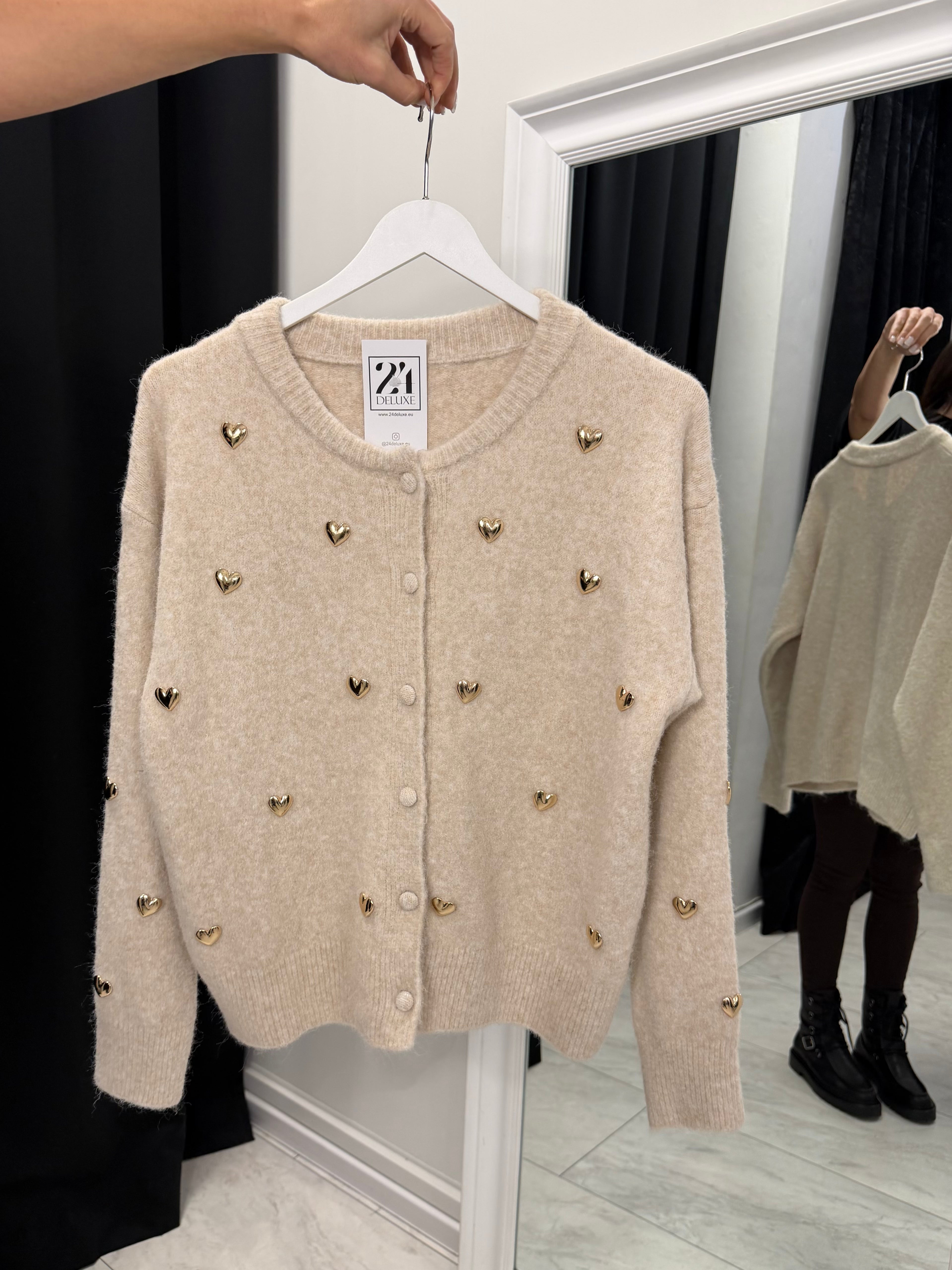 Дамската фина жилетка със златни сърца е стилен и женствен акцент за всеки гардероб. Изработена от мека и еластична плетка с вискоза, полиамид и вълна, тя осигурява комфорт и приятно усещане при носене. Декоративните златисти сърца придават деликатен луксозен ефект, а класическото закопчаване с копчета я прави лесна за комбиниране – както самостоятелно, така и върху топ или риза.