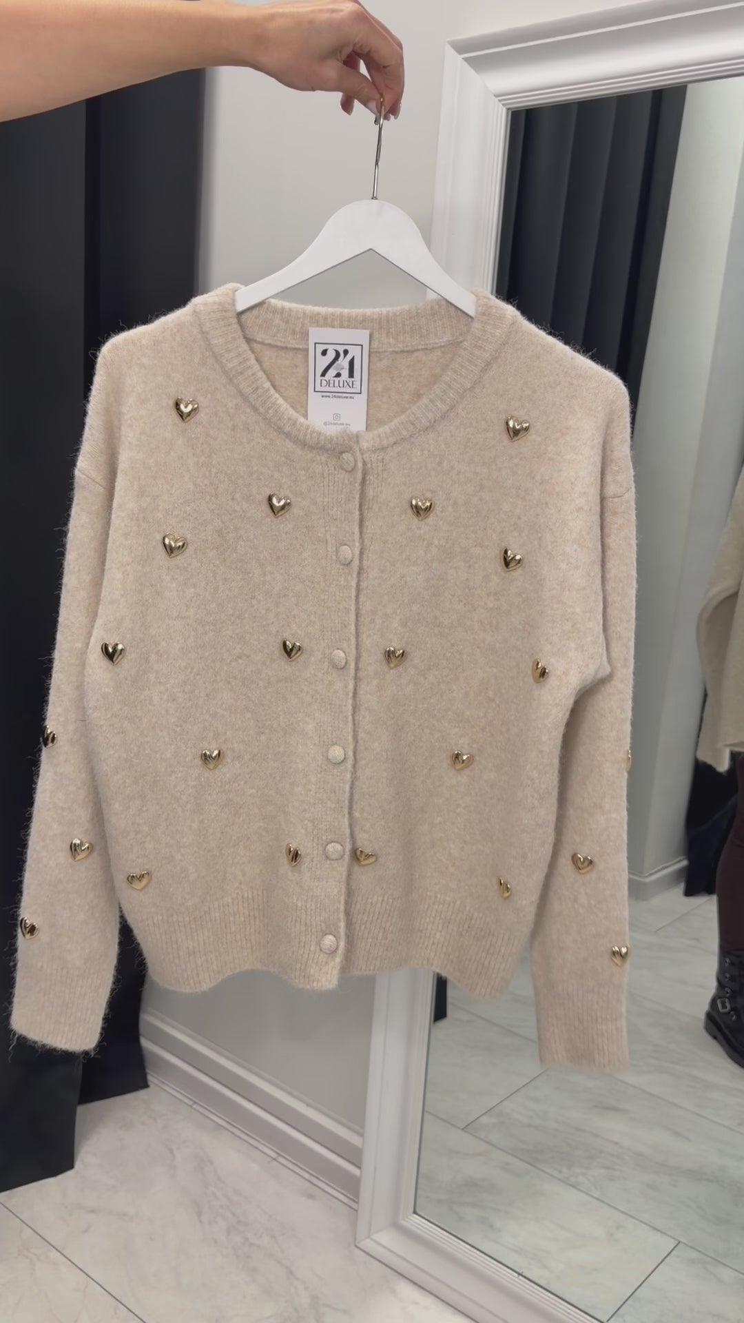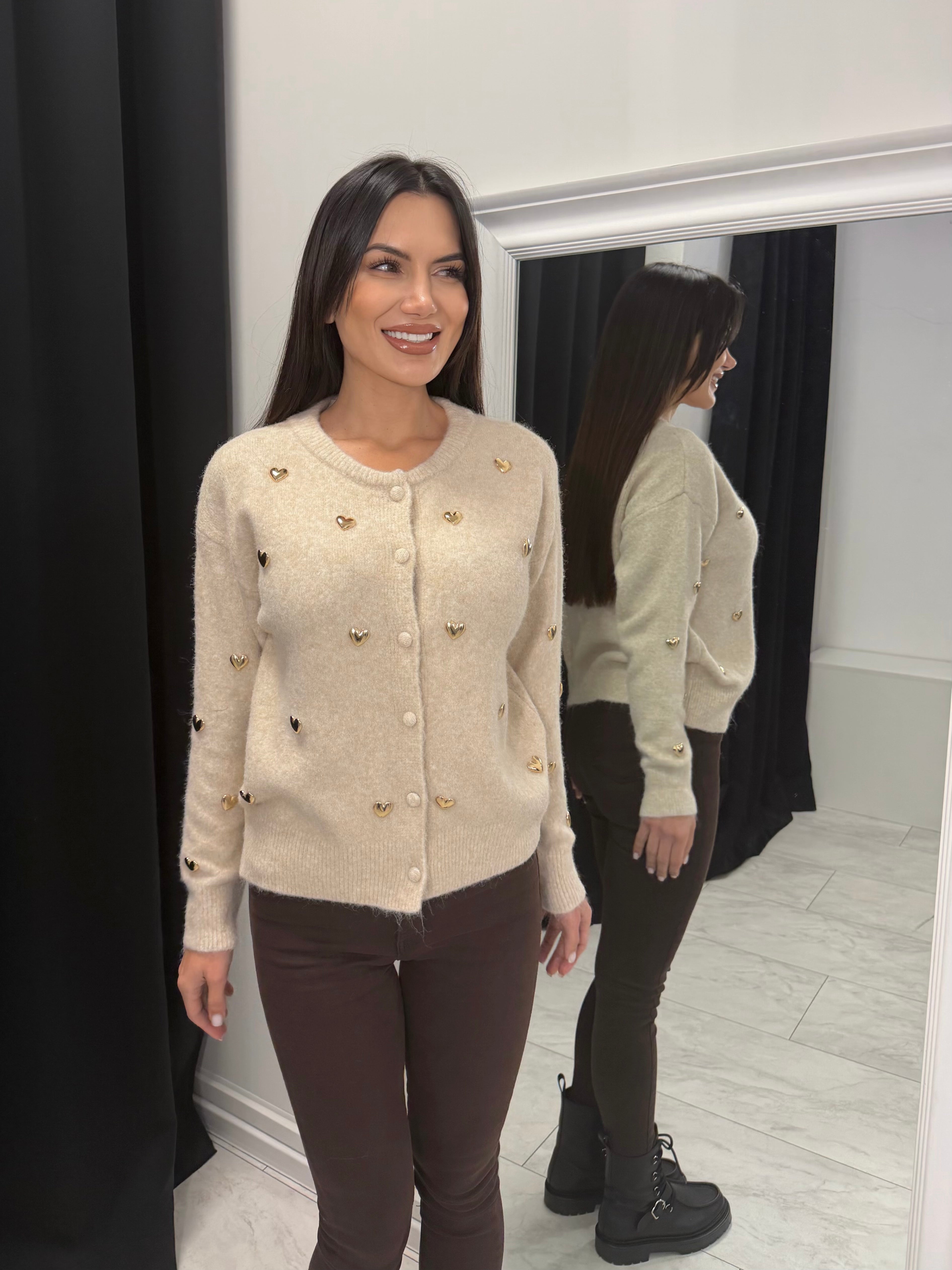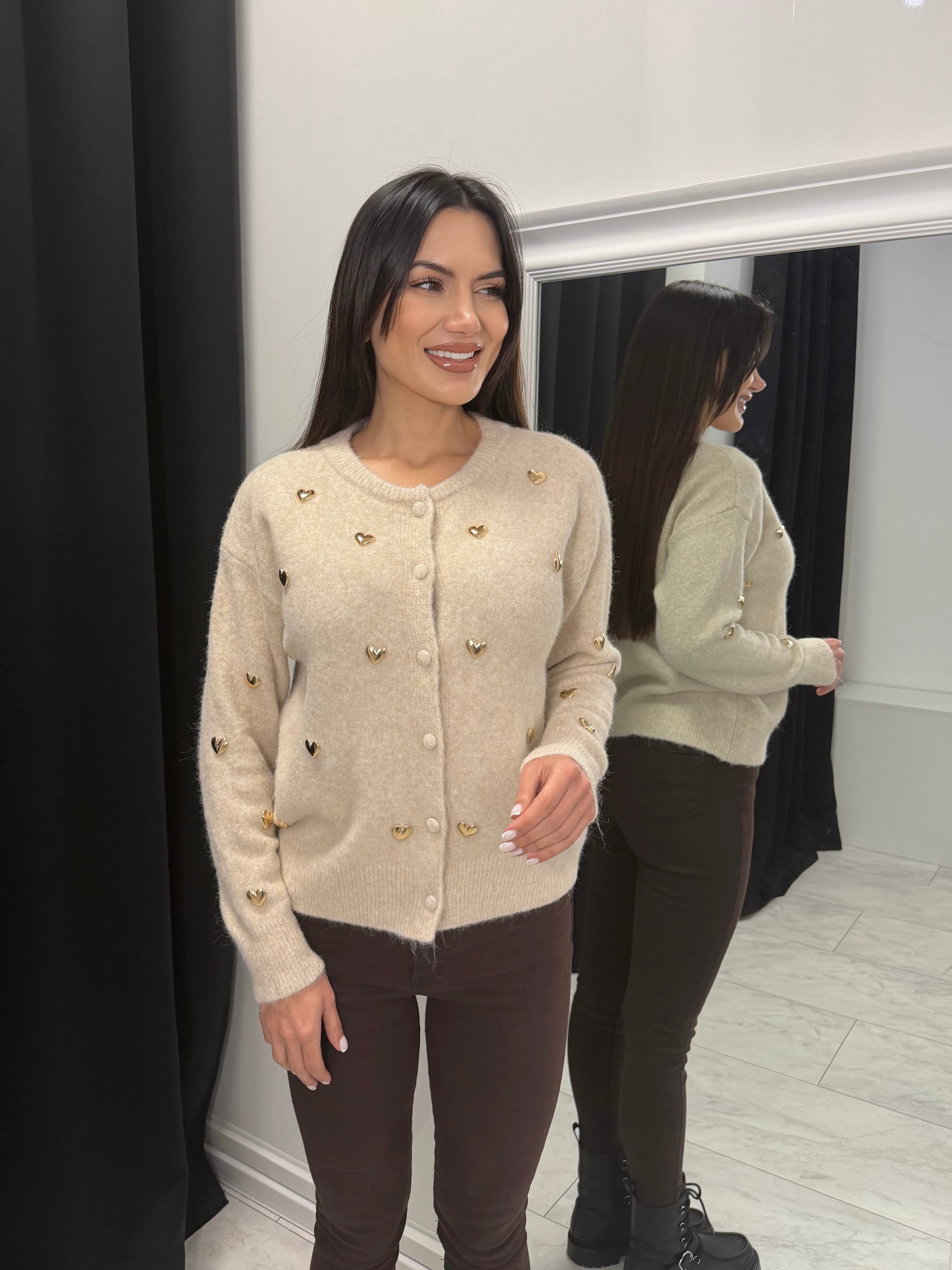 Дамската фина жилетка със златни сърца е стилен и женствен акцент за всеки гардероб. Изработена от мека и еластична плетка с вискоза, полиамид и вълна, тя осигурява комфорт и приятно усещане при носене. Декоративните златисти сърца придават деликатен луксозен ефект, а класическото закопчаване с копчета я прави лесна за комбиниране – както самостоятелно, така и върху топ или риза.