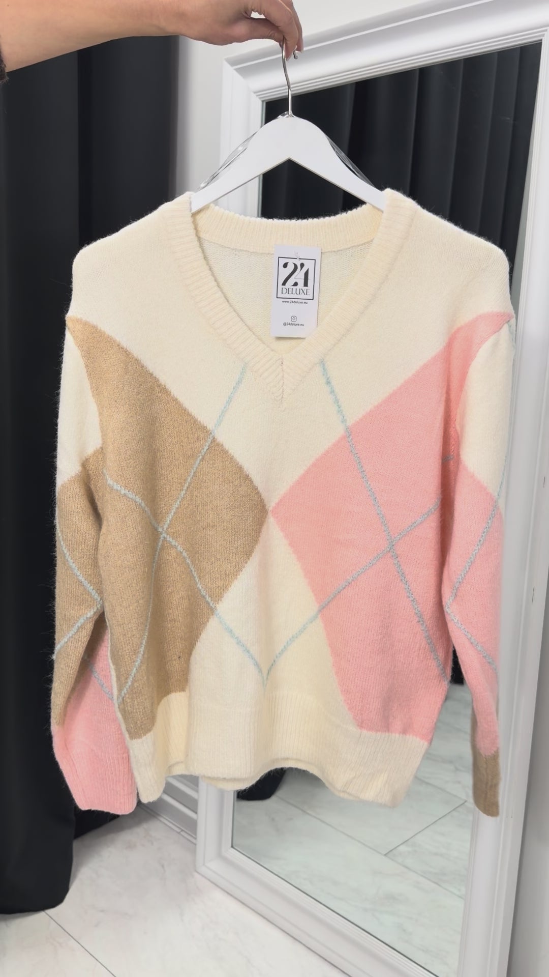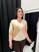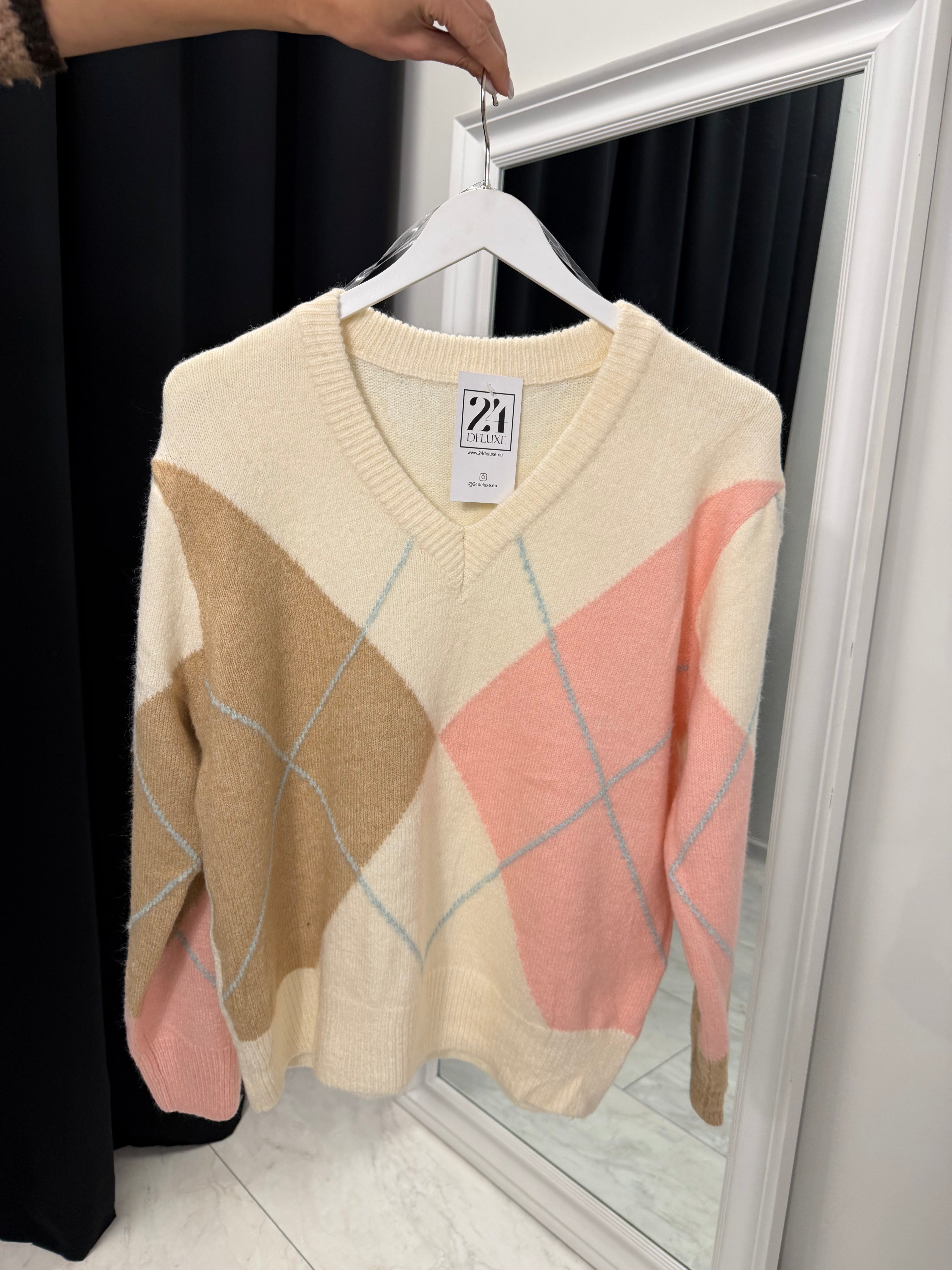 Елегантен плетен пуловер с класически геометричен (argyle) мотив в нежна комбинация от кремаво, бежово и пудра розово. Изработен от мека и еластична прежда, която осигурява комфорт, свобода на движение и приятно усещане върху кожата. V-образното деколте придава женственост и визуално издължава силуета. Универсален модел, подходящ както за ежедневни визии, така и за стилни smart casual комбинации през есенно-зимния сезон.