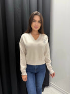 Мек и елегантен пуловер с V-образно деколте и дискретна щампа LOVE отпред.