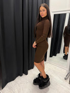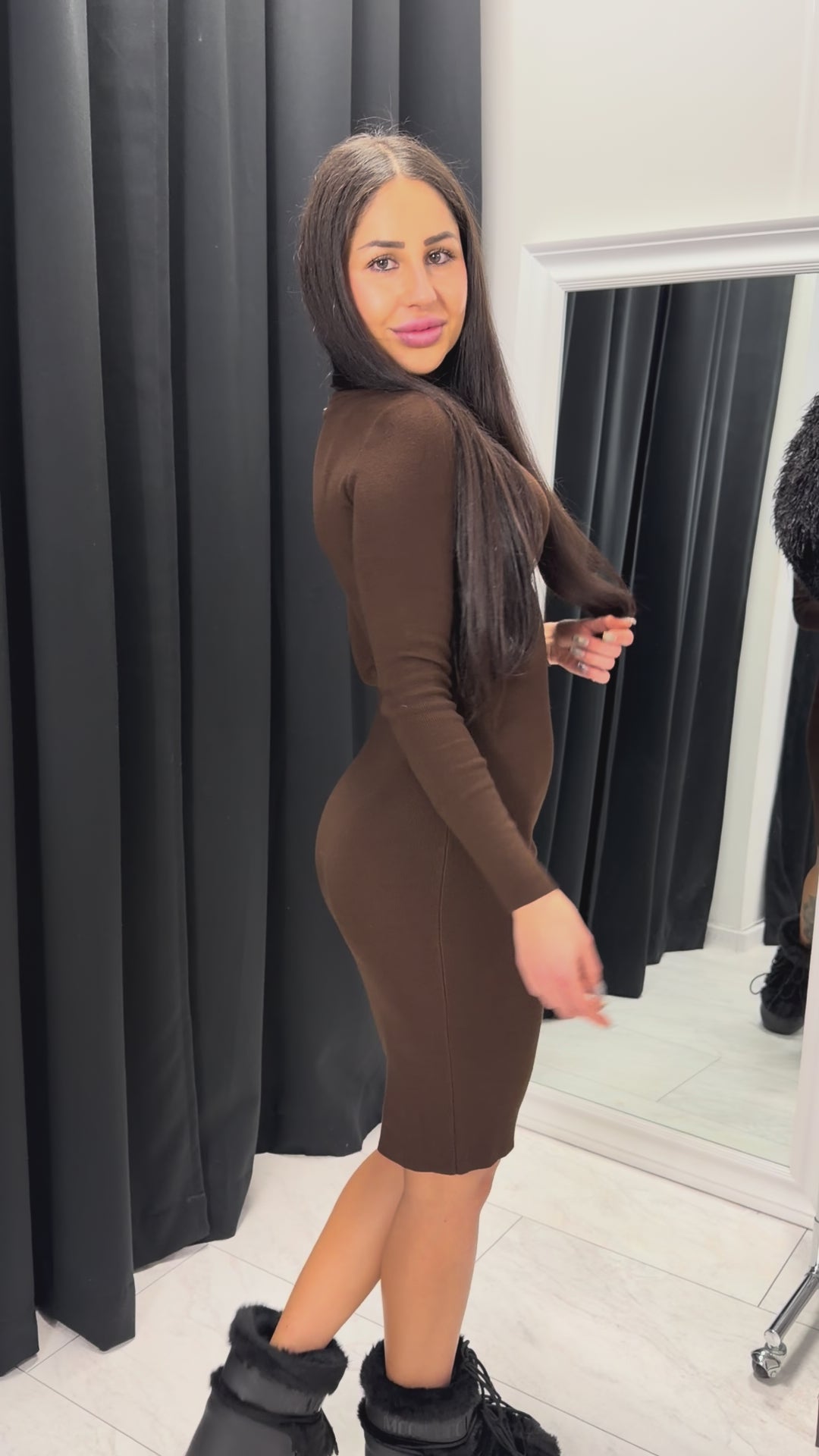 Класическа черна рокля с поло яка и дълъг ръкав, изработена от плътно машинно плетиво. Стилен и изчистен модел, който подчертава фигурата и е подходящ както за ежедневни визии, така и за вечерни излизания.