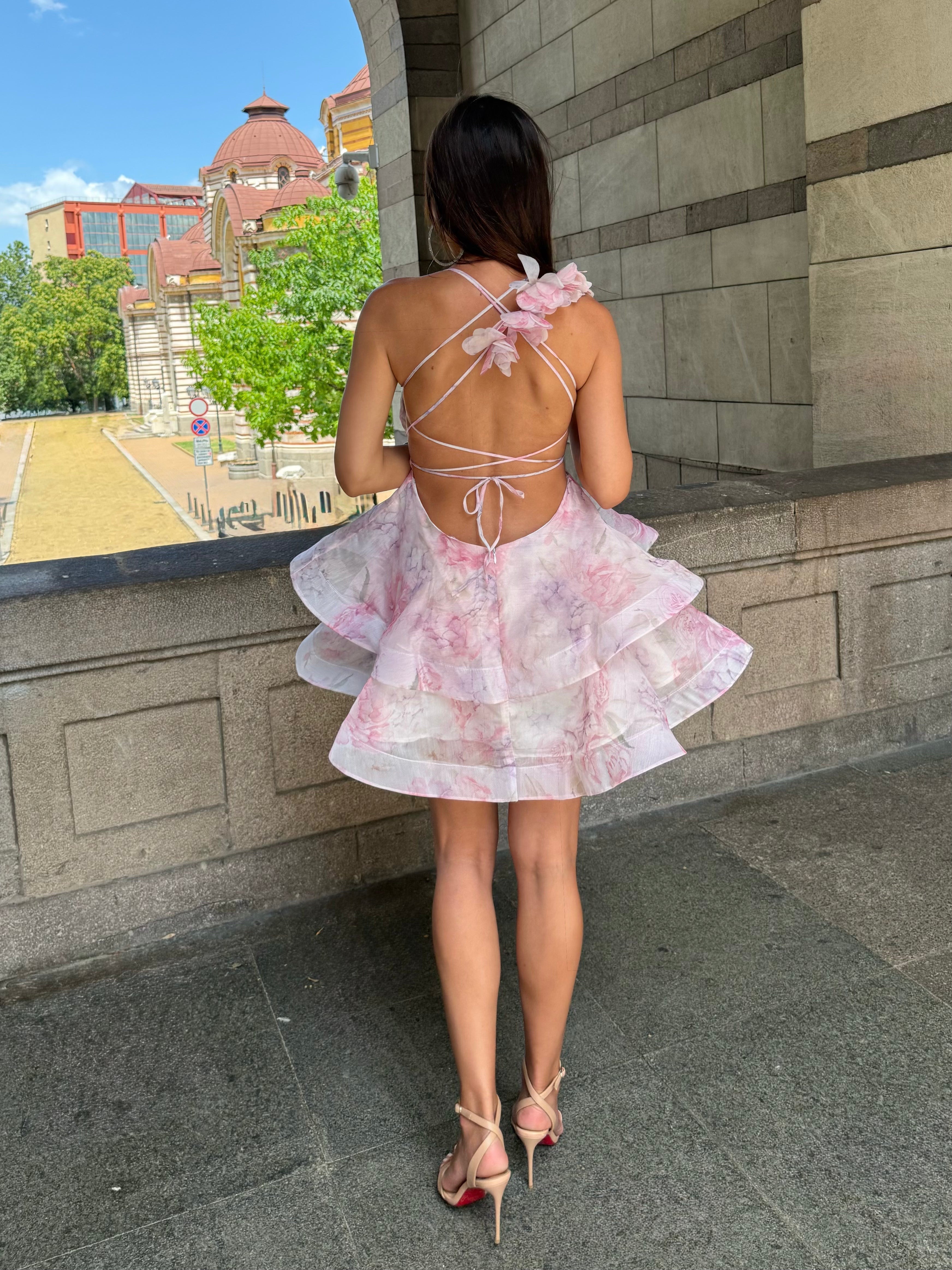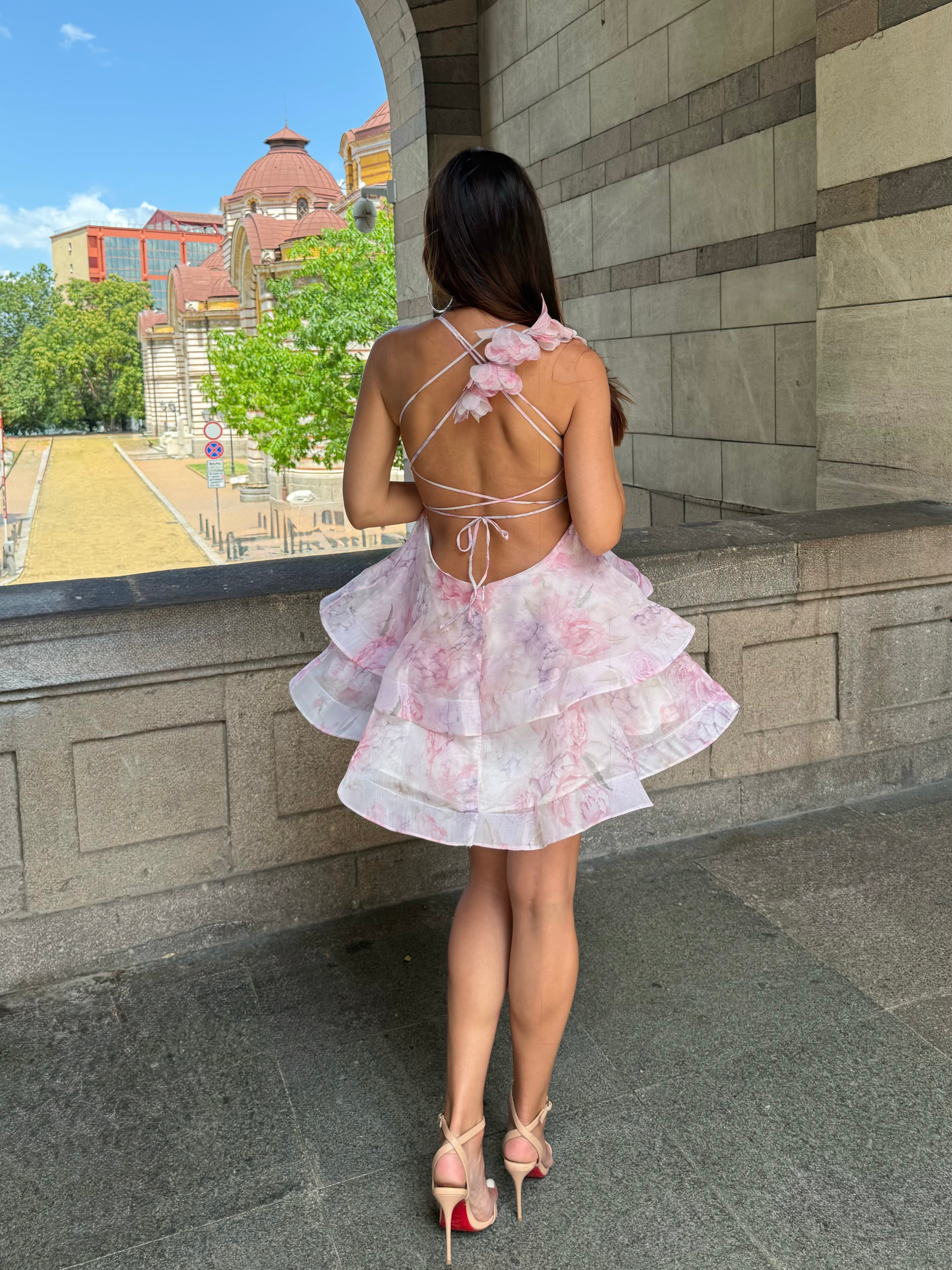 „KISS ME ROSÉ“ е ефирна мини рокля, изработена от лека материя с флорален принт в нежни розови тонове. Асиметричното рамо, украсено с 3D цветя, и отвореният гръб с преплетени връзки я превръщат в уникално бижу за специални поводи.