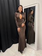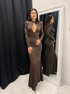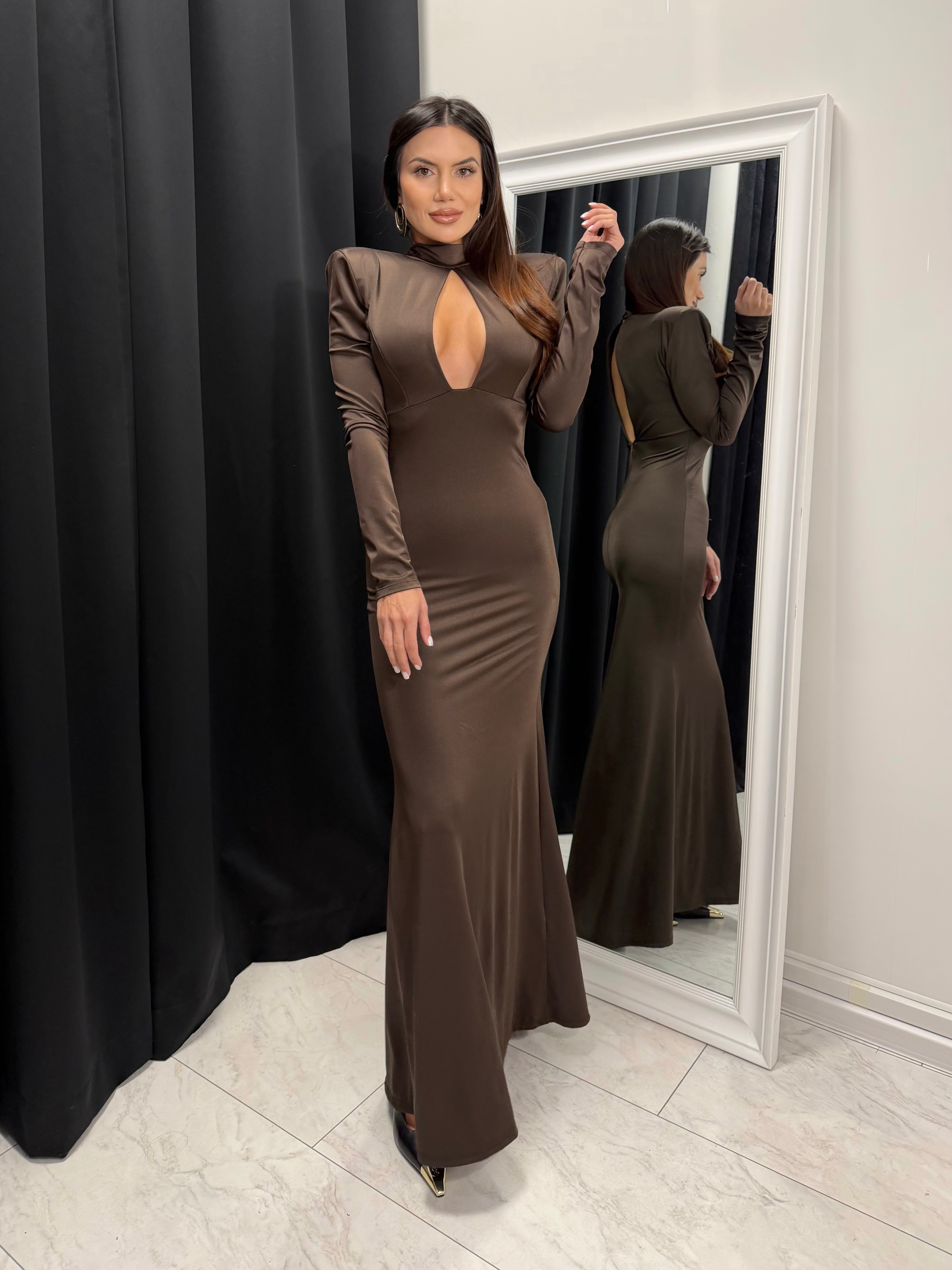 Моделът е с дълъг ръкав и фино оформено деколте с елегантно изрязване отпред, балансирано с открит гръб – детайл, който придава характер и завършеност. Линията следва тялото и се разлива плавно към подгъва, създавайки издължен и изключително женствен силует.
