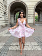 „KISS ME ROSÉ“ е ефирна мини рокля, изработена от лека материя с флорален принт в нежни розови тонове. Асиметричното рамо, украсено с 3D цветя, и отвореният гръб с преплетени връзки я превръщат в уникално бижу за специални поводи.