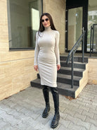 Елегантна рокля с поло яка и дълъг ръкав, изработена от плътно и стегнато машинно плетиво. Универсален модел, подходящ за ежедневие и специални поводи.