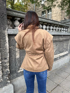 Елегантно сако от мек велур в топъл нюанс камел. Моделът има скрити вътрешни връзки, които позволяват дискретно пристягане и подчертават талията, запазвайки изчистената линия на кройката. Закопчава се с едно копче отпред и разполага с практични джобове.