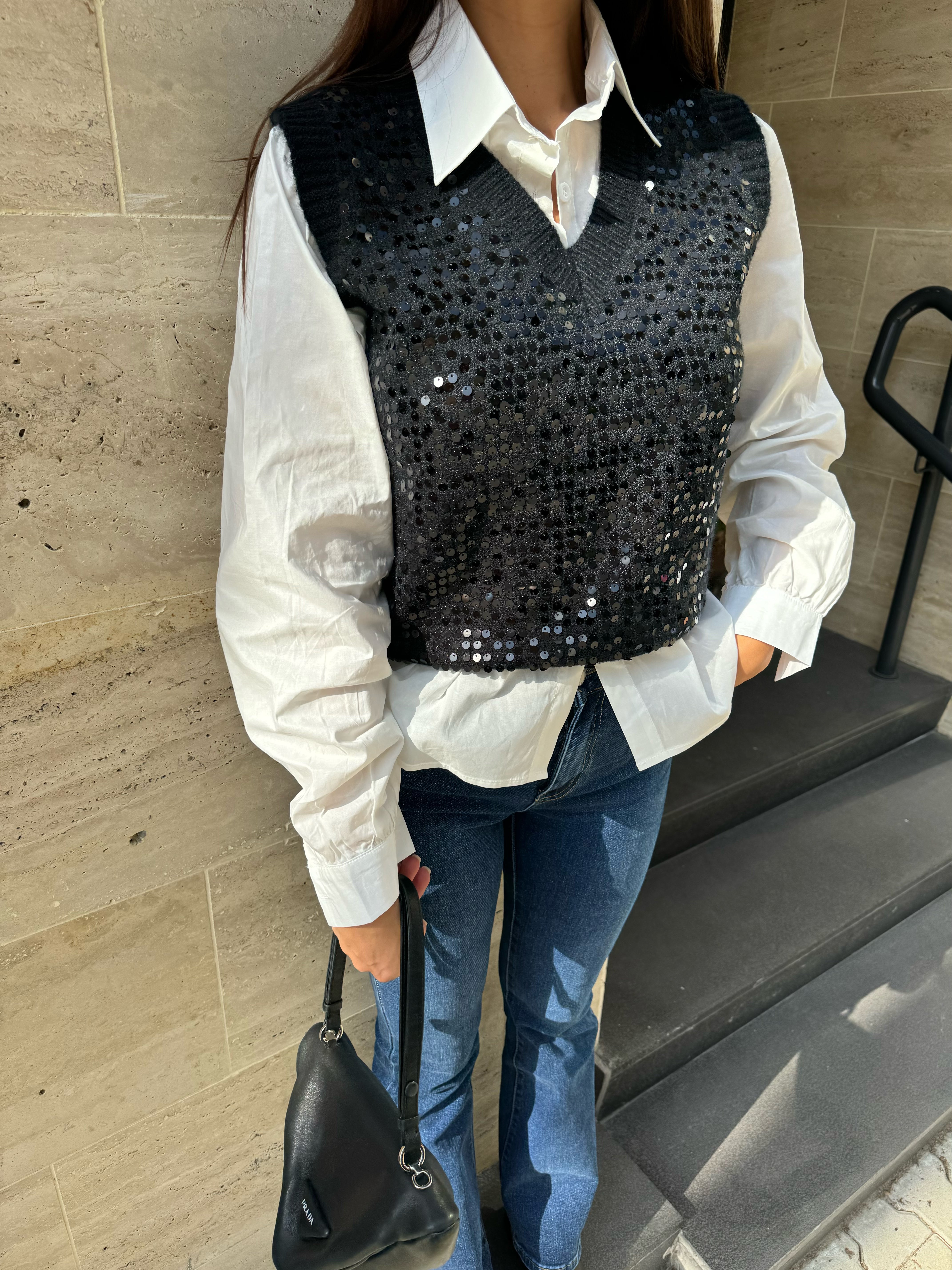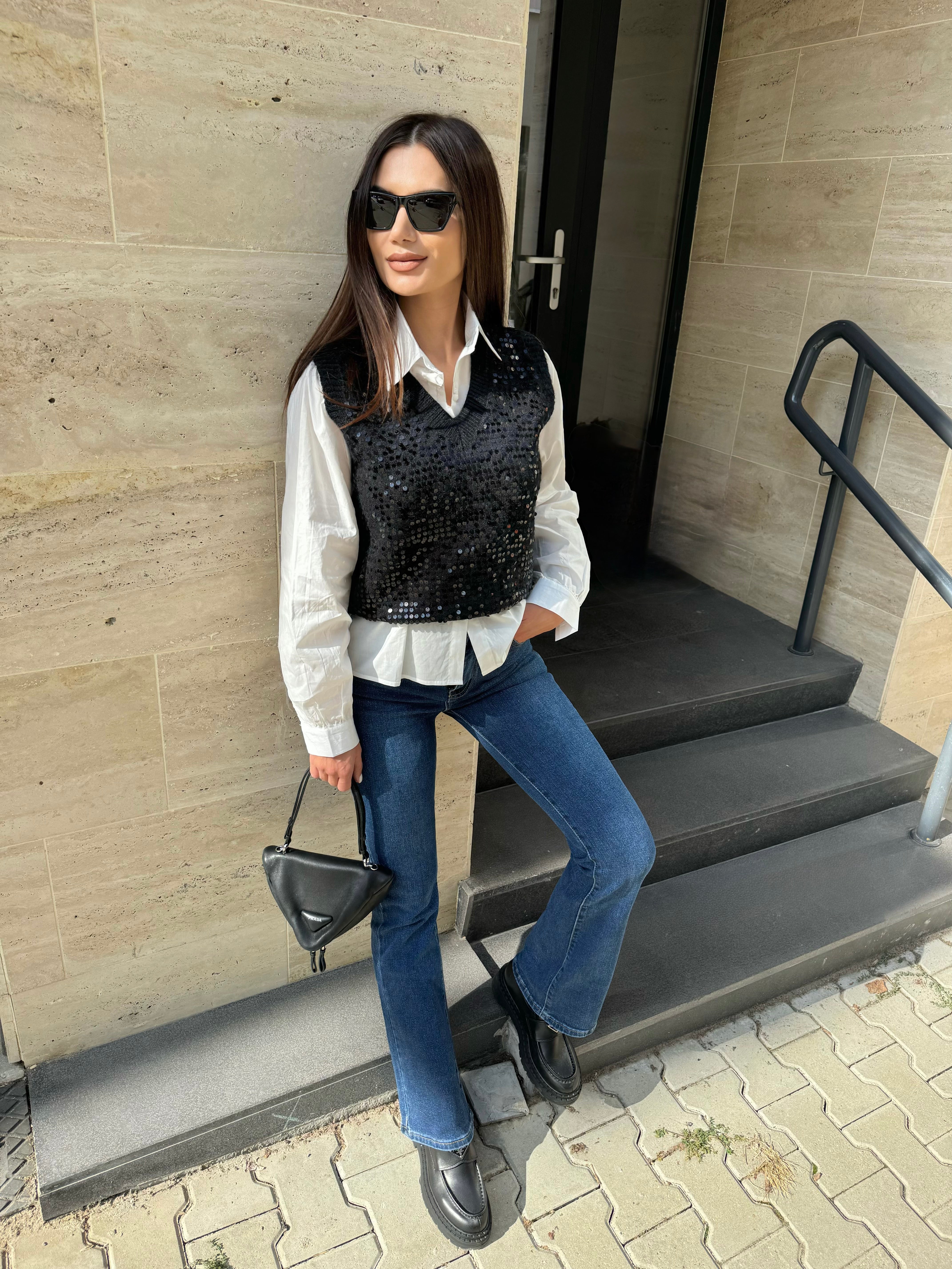 Черният елек с пайети добавя акцент и съвременен шик — идеален за градски, офис или вечерен аутфит.