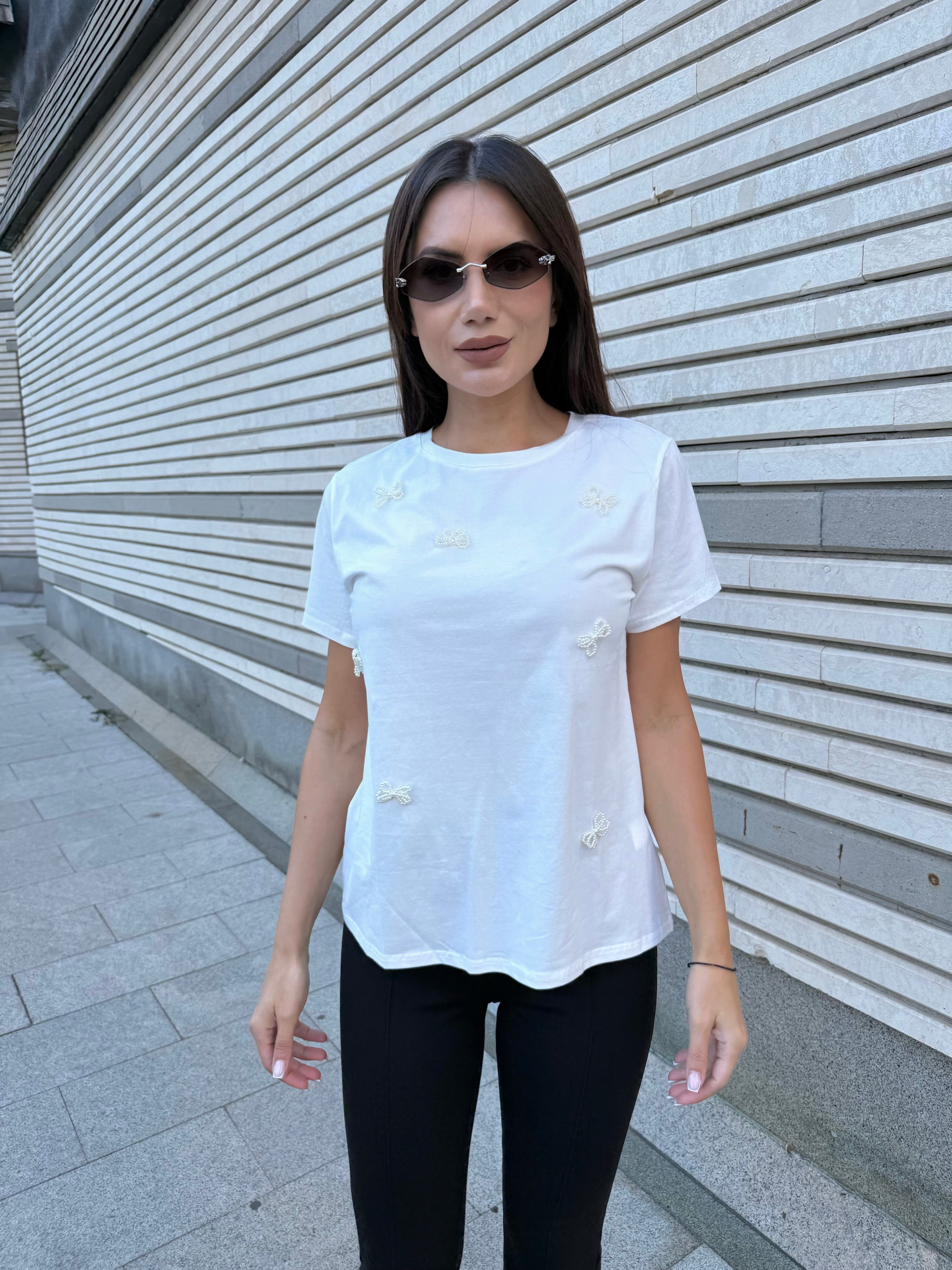 RIBBON LOVE – Бяла тениска с перлени панделки