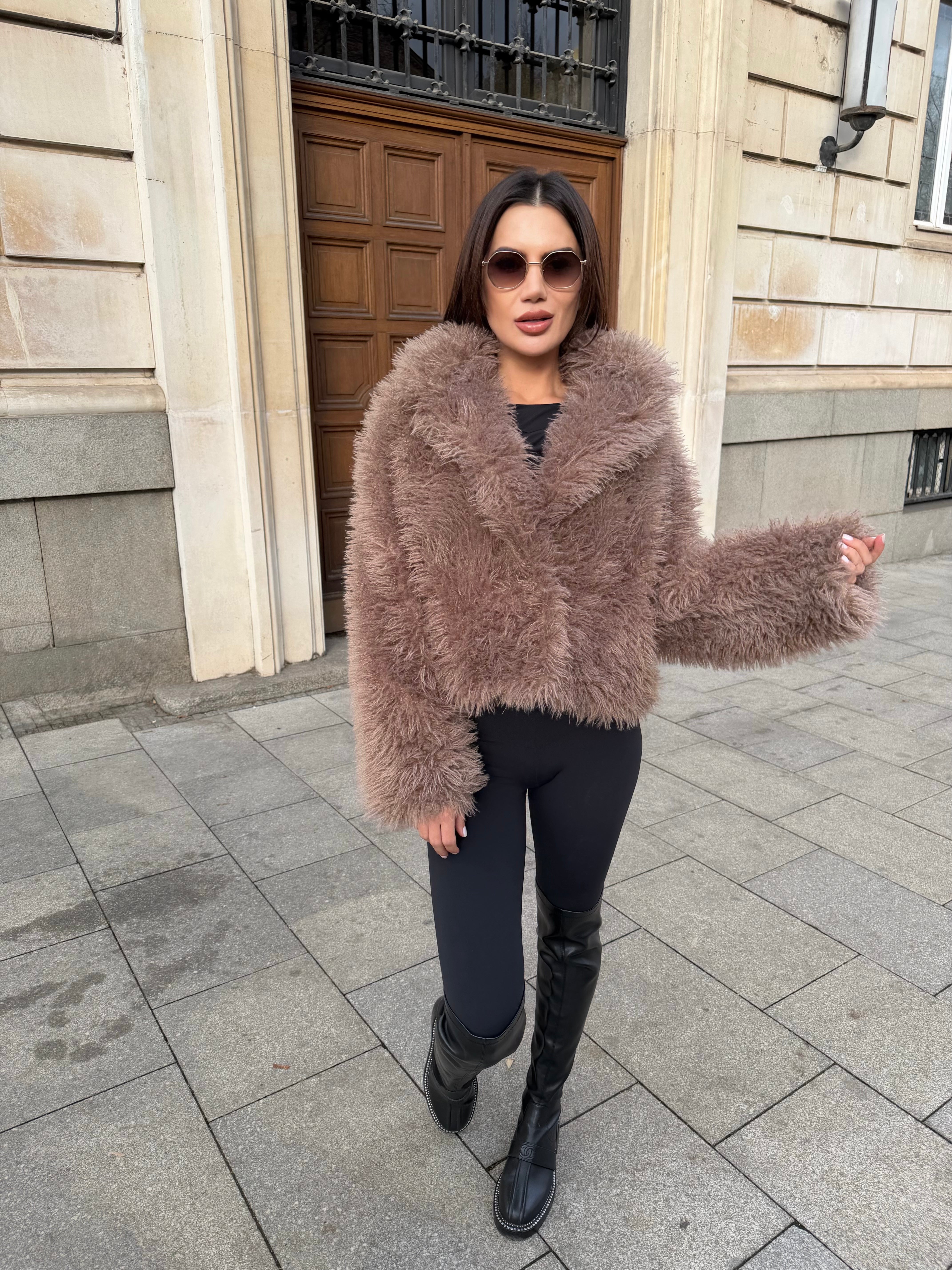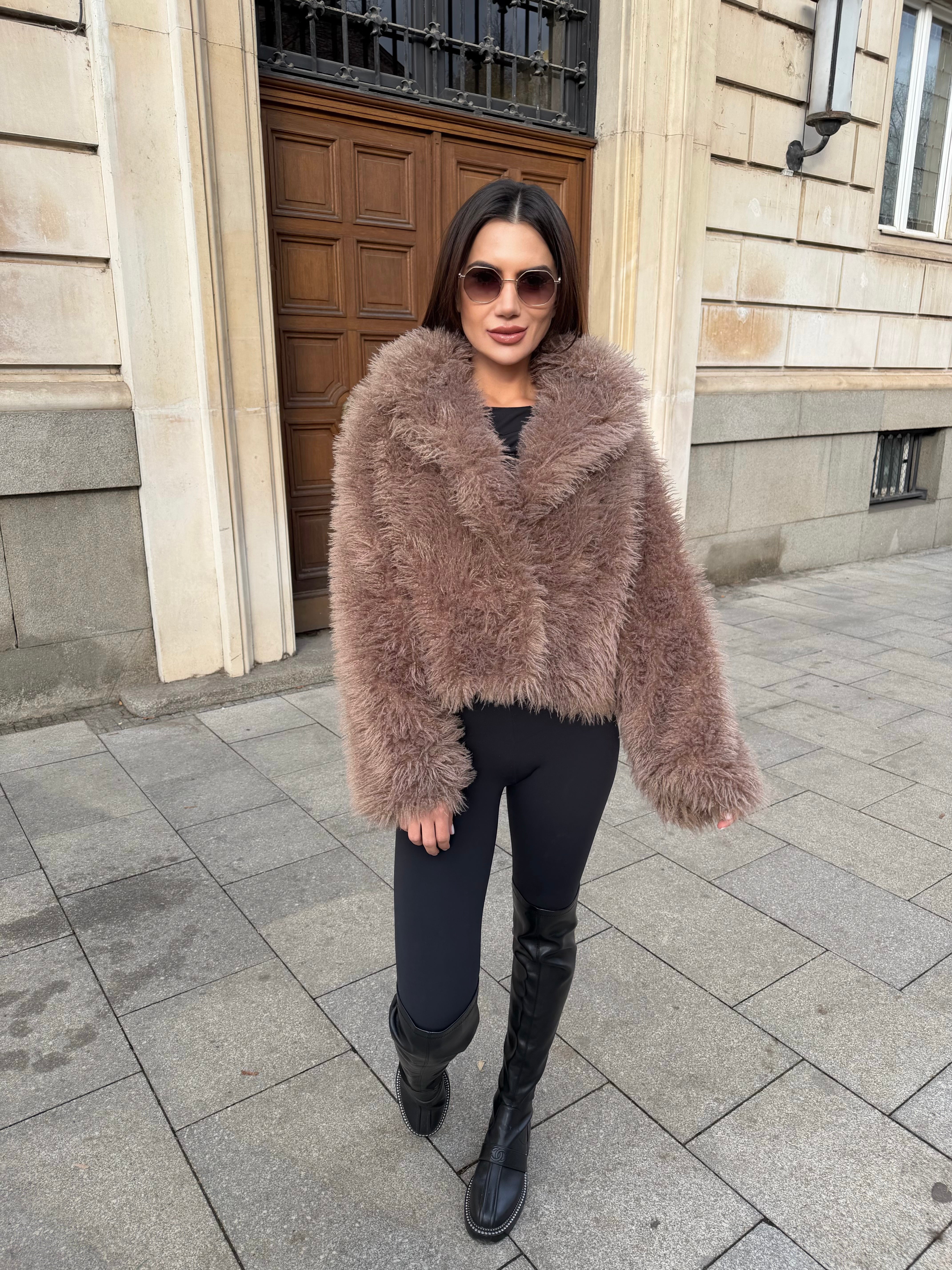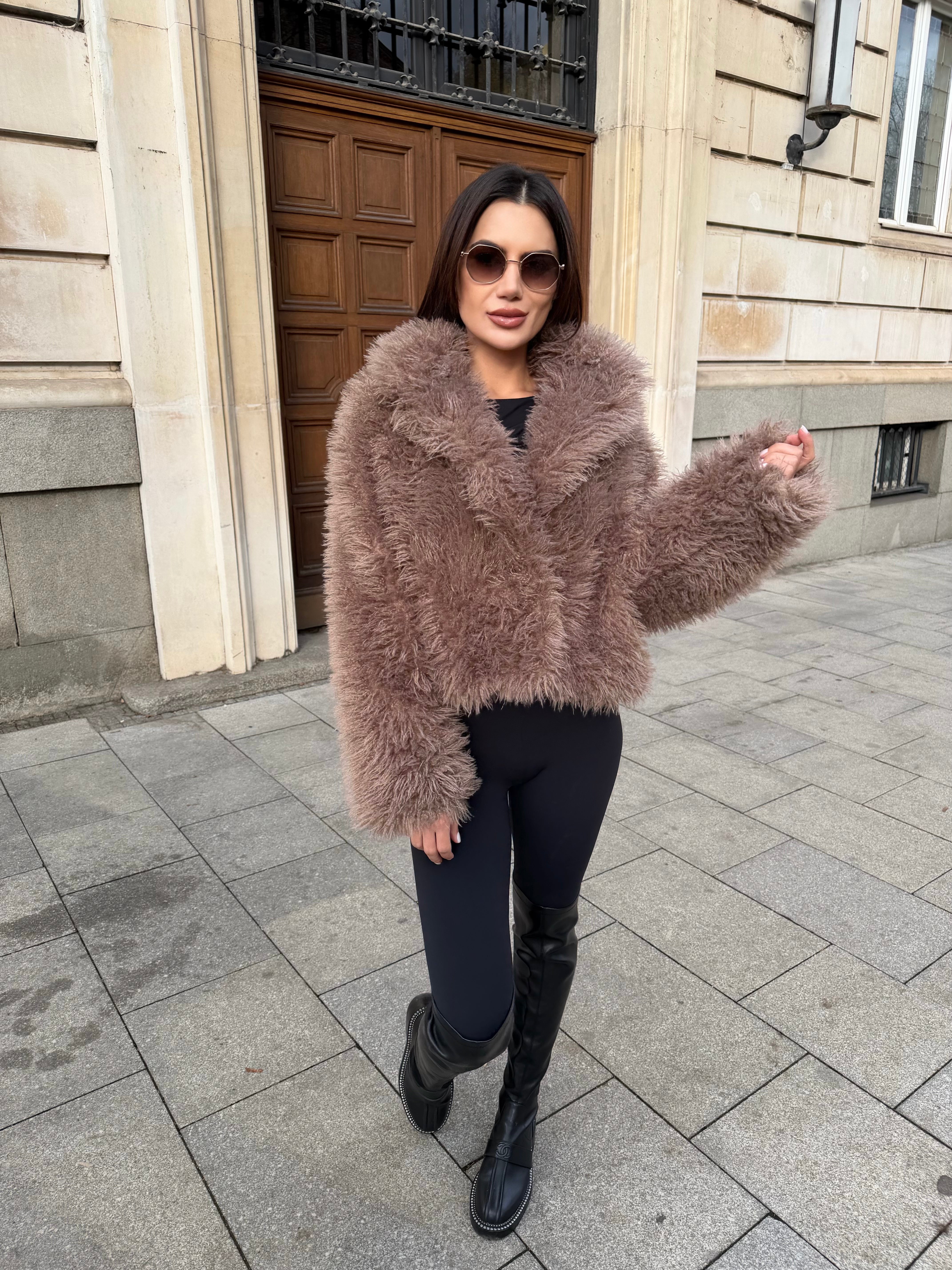 Това е късо пухкаво яке от мека материя, която е лека, нежна и приятно пухкава на допир, без тежест и без косъм ефект. Стои обемно, но не е дебело – идеално за модерна градска визия през преходните сезони и по-меките зимни дни.