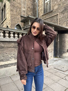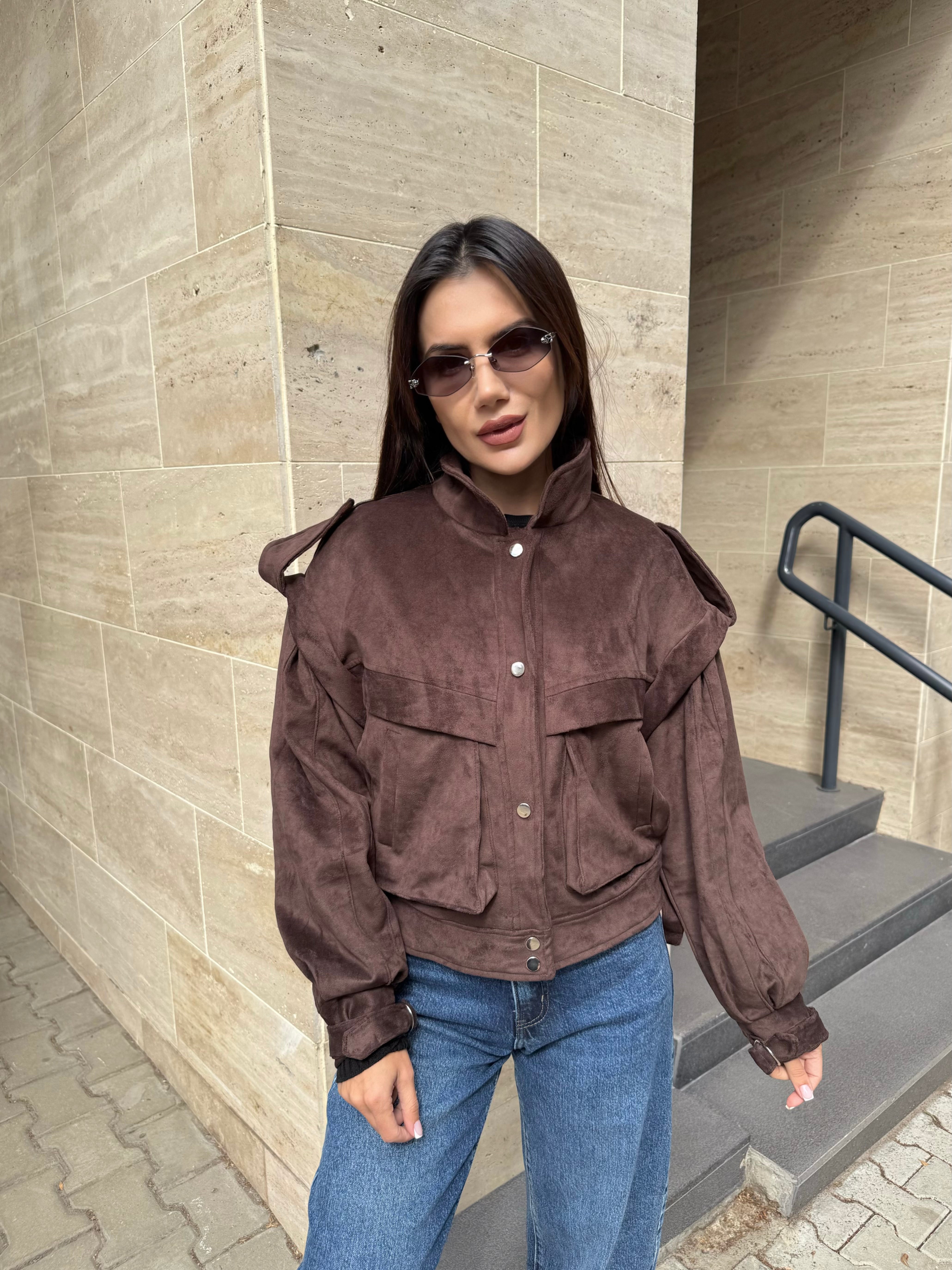 Луксозно късо яке от мек еко велур в наситен кафяв цвят. Моделът е с модерна обемна кройка, висока яка и акцентирани копчета в сребрист тон. Идеално допълнение към ежедневни и градски визии — комбинирай с дънки или пола за effortlessly chic стил.