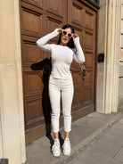 Моделът е с висока талия и леко стеснен крачол, който оформя силуета и стои изключително елегантно както със спортни обувки, така и с ток. Нежният екрю цвят придава луксозно излъчване и лесно се комбинира с бяло, бежово, кафяво или черно.