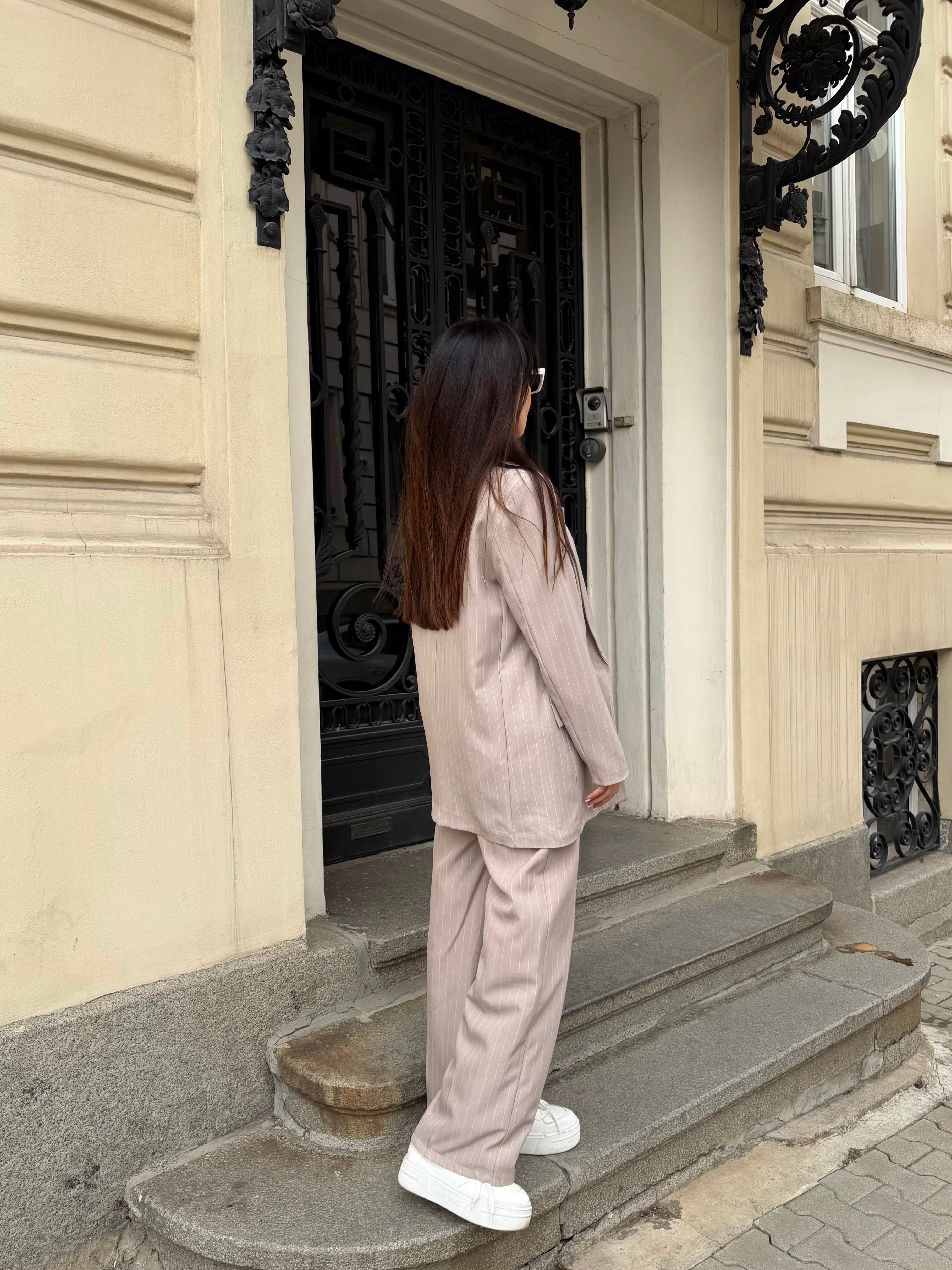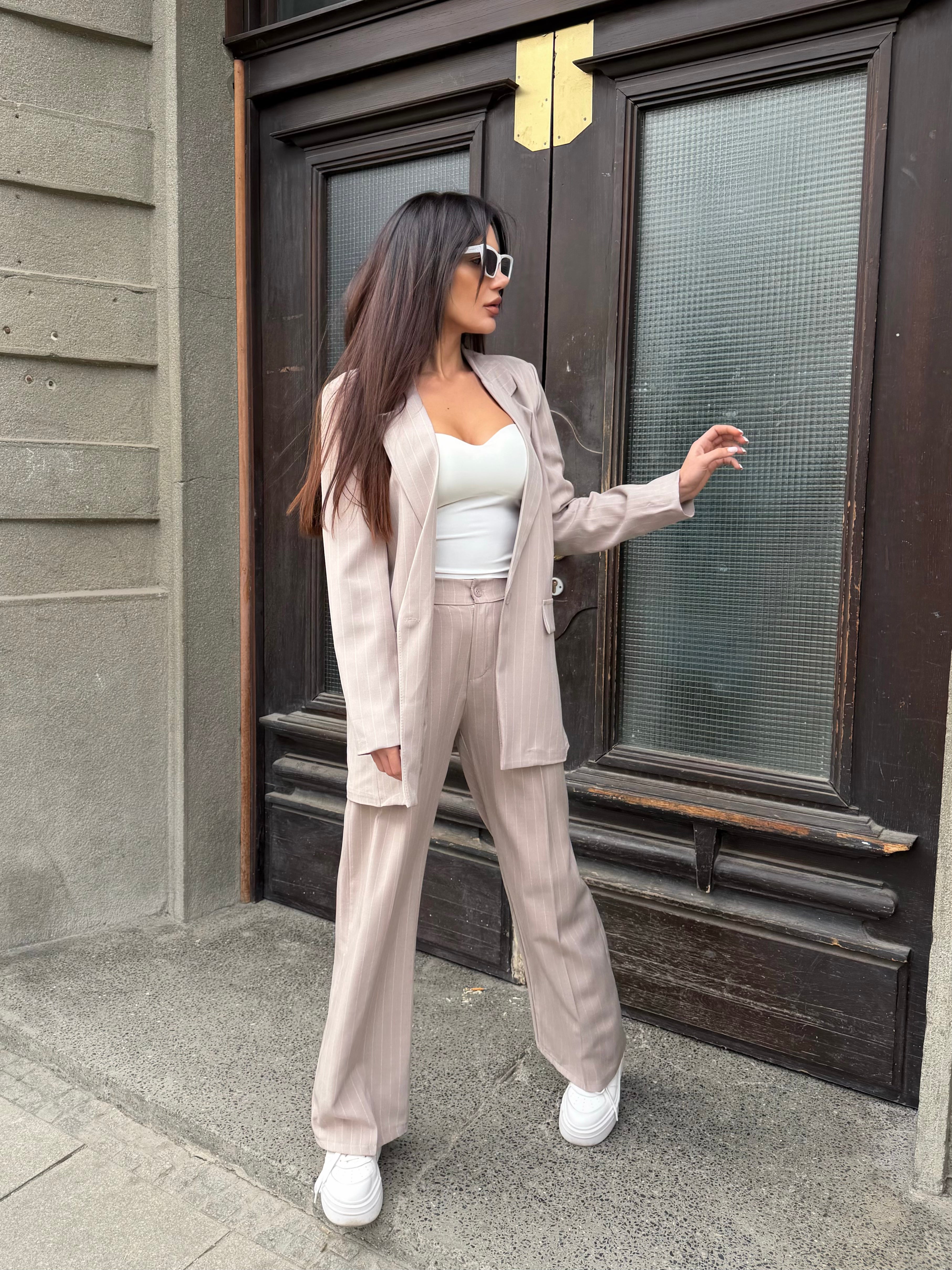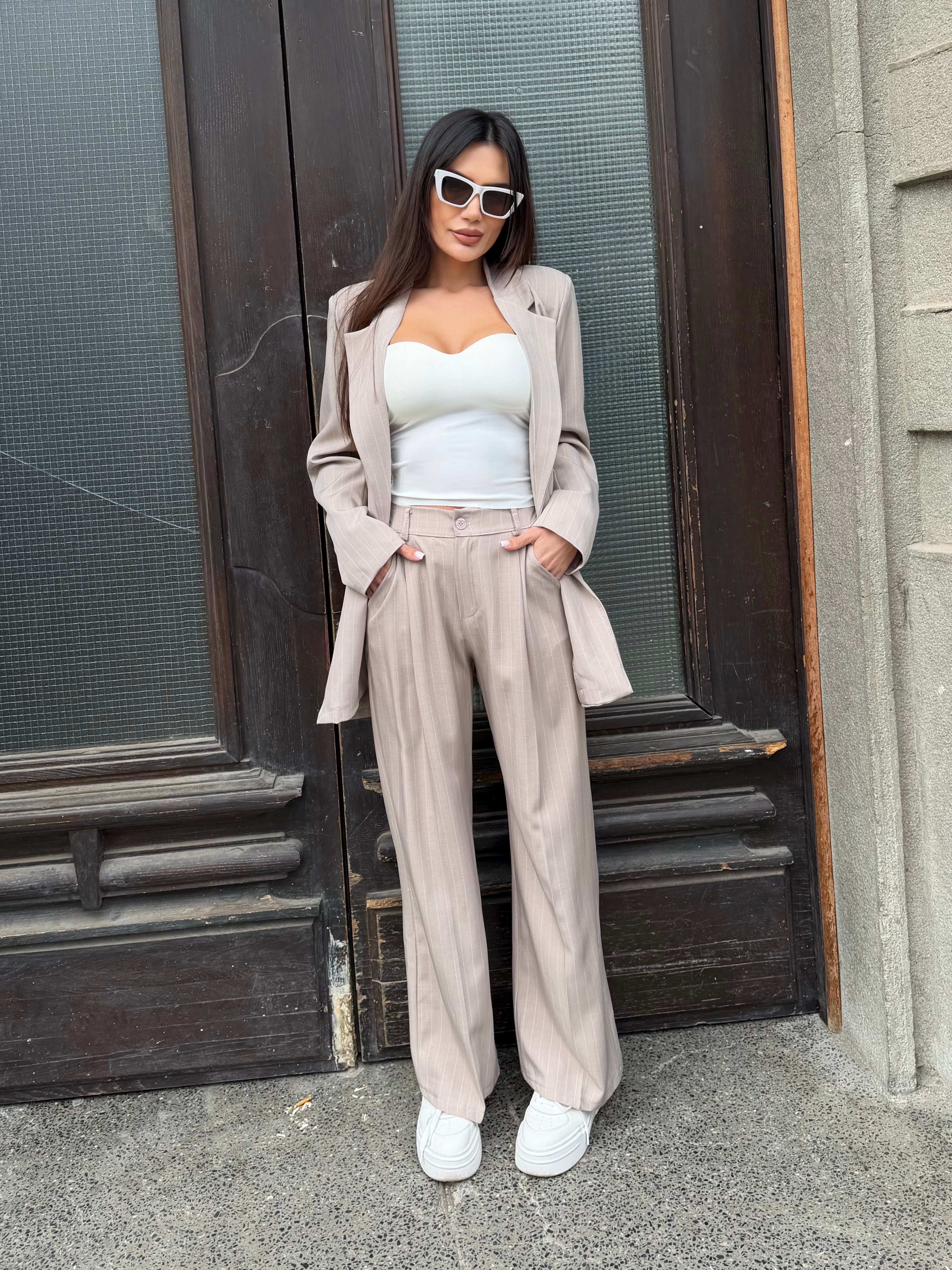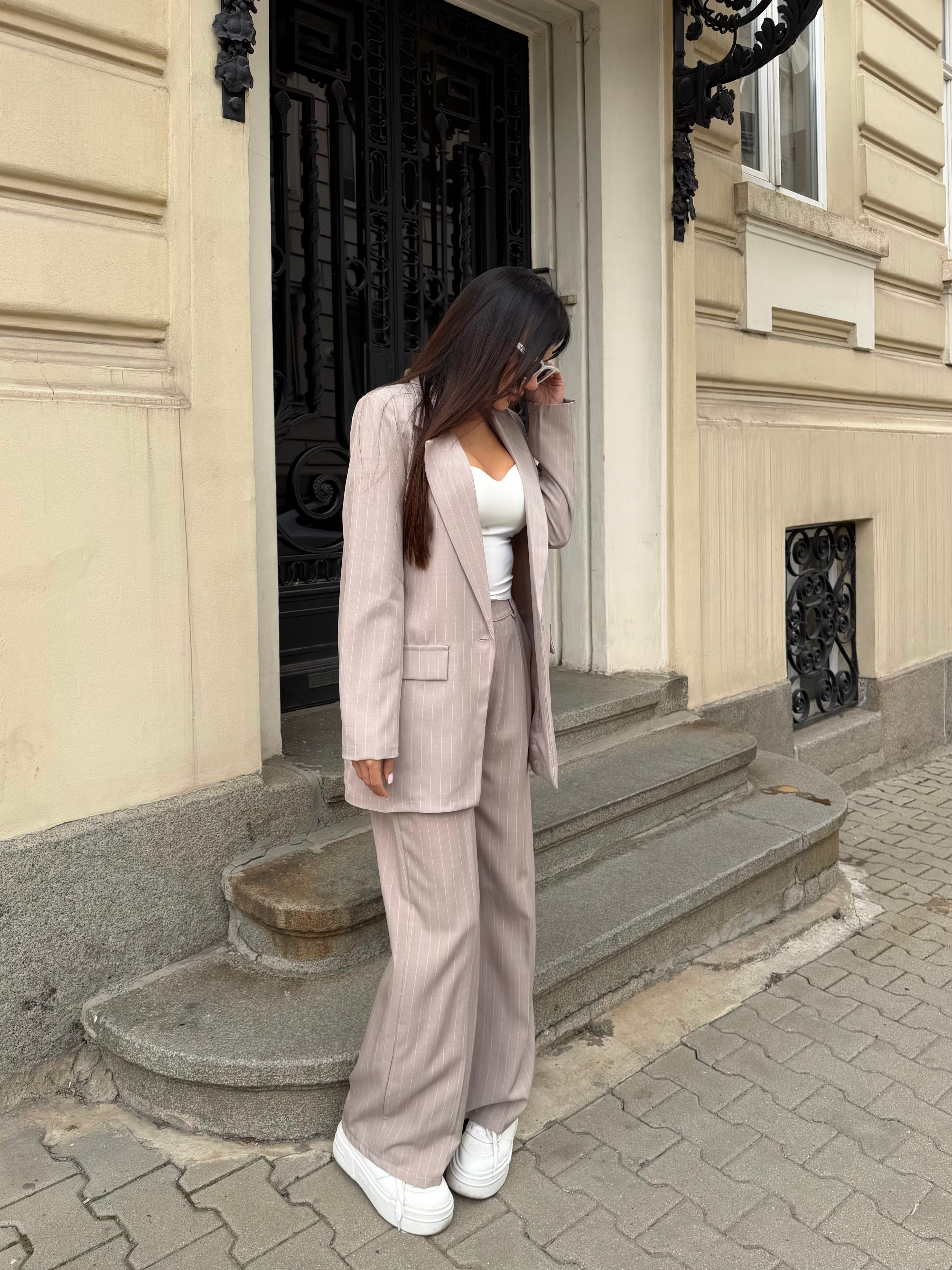 Елегантен дамски костюм от две части, състоящ се от сако и панталон с модерна свободна кройка. Фините вертикални райета придават изтънчен и стилен вид, който издължава силуета.
