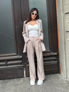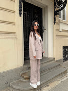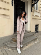 Сакото е със свободна линия и класически ревер, което го прави идеално както за елегантна визия, така и за модерни градски комбинации. Панталонът е с висока талия и ластик в задната част за допълнителен комфорт.