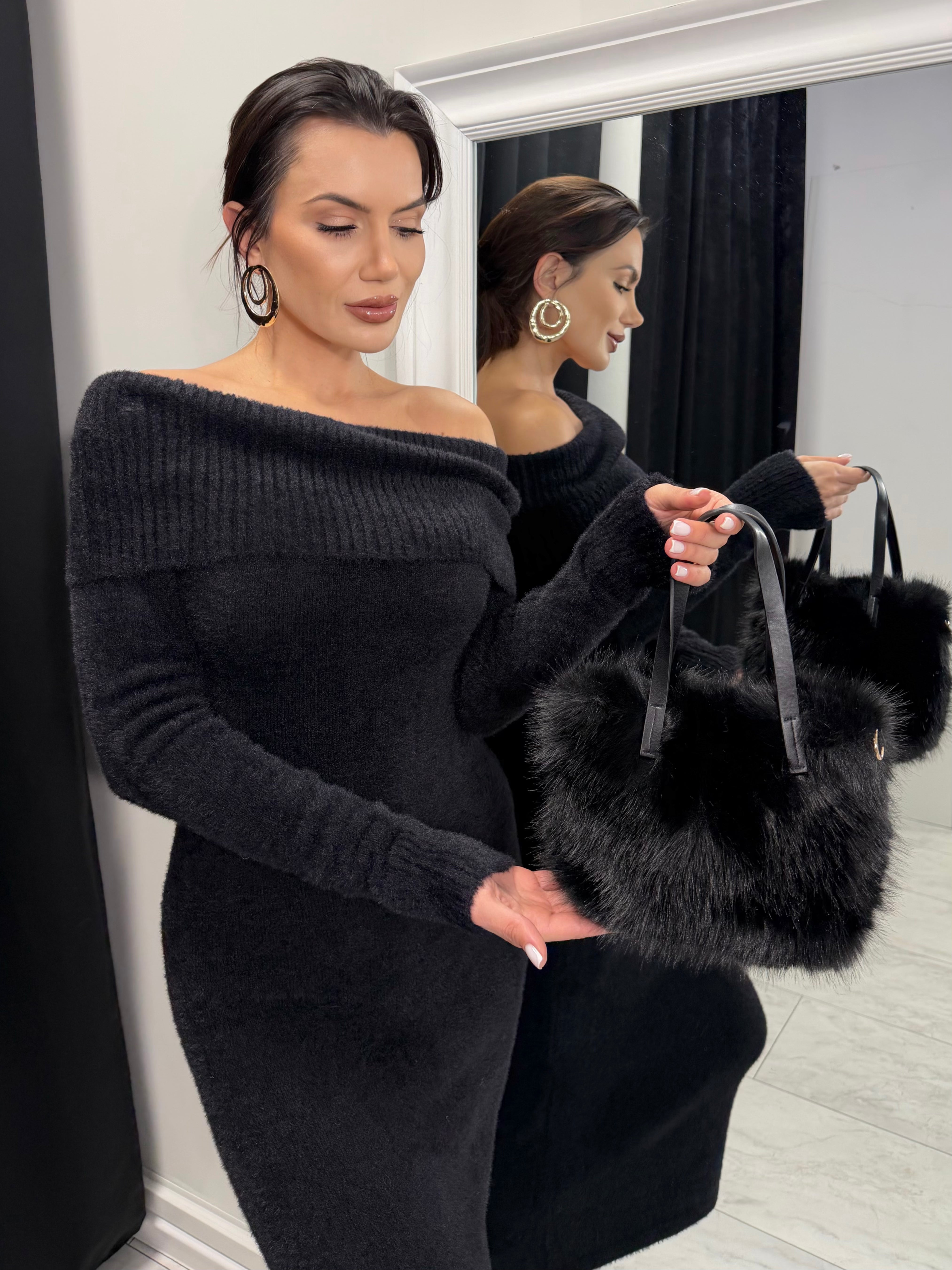 Меката пухкава текстура придава усещане за уют и стил, а дългата дръжка позволява носене както в ръка, така и през рамо. Черният цвят я прави универсална и лесна за комбиниране с палта, рокли и плетива.