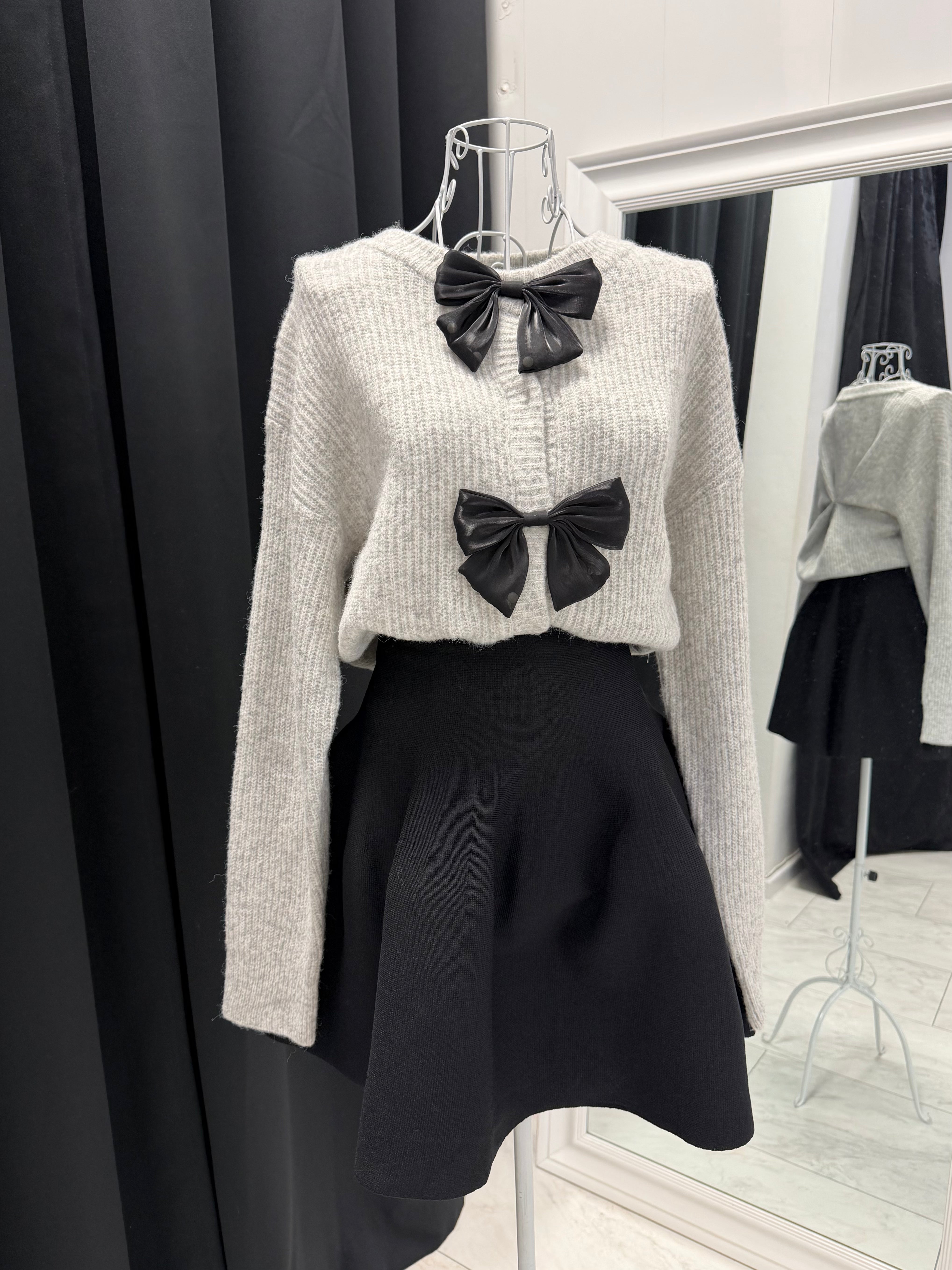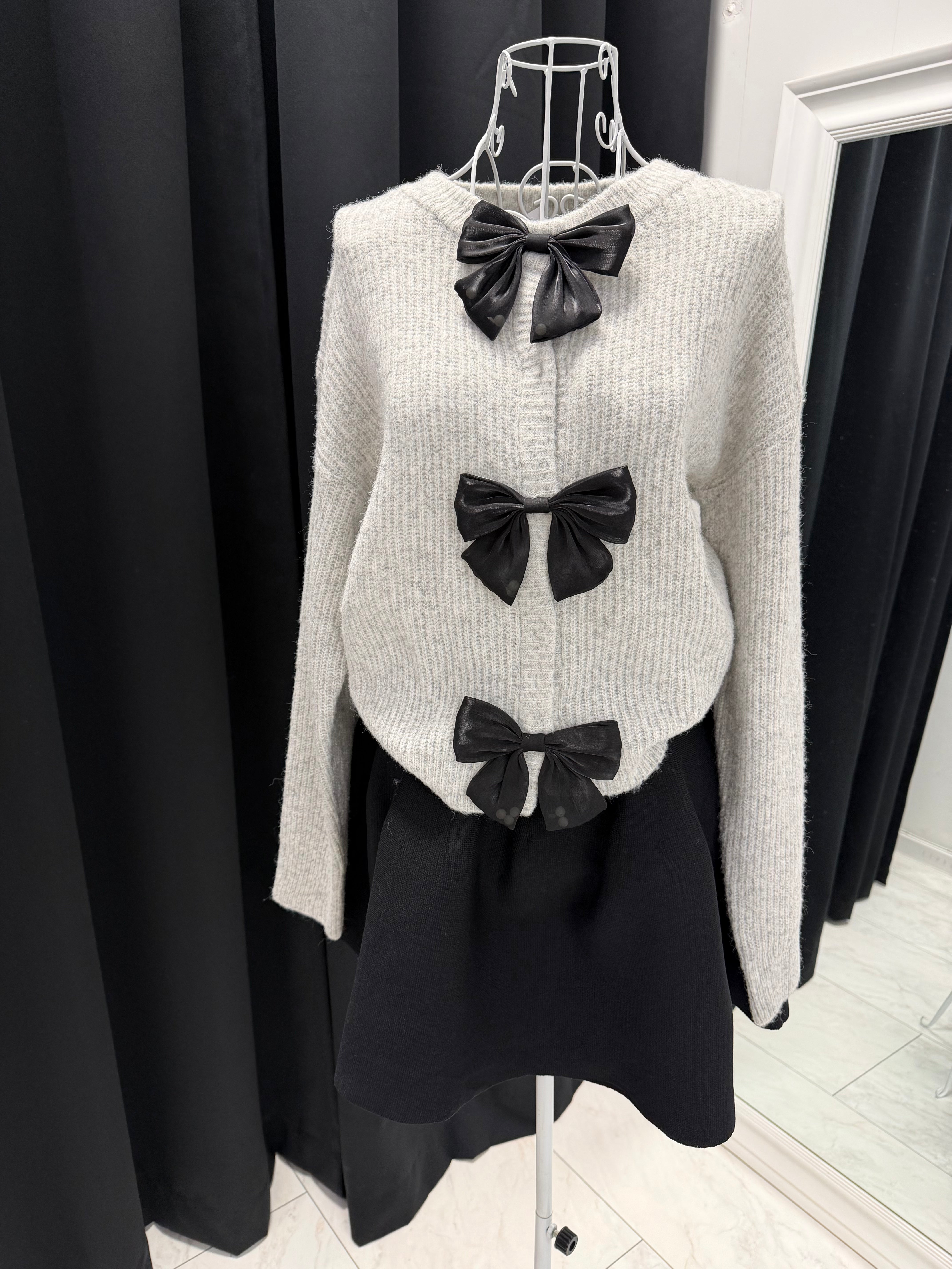 Акцентът са двата големи черни панделки от еко кожа, разположени по закопчаването – детайл, който съчетава сладка нежност и edgy излъчване. Силуетът е леко свободен, топъл и удобен, идеален за комбинация с поли, панталони или дънки.