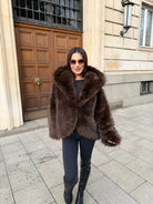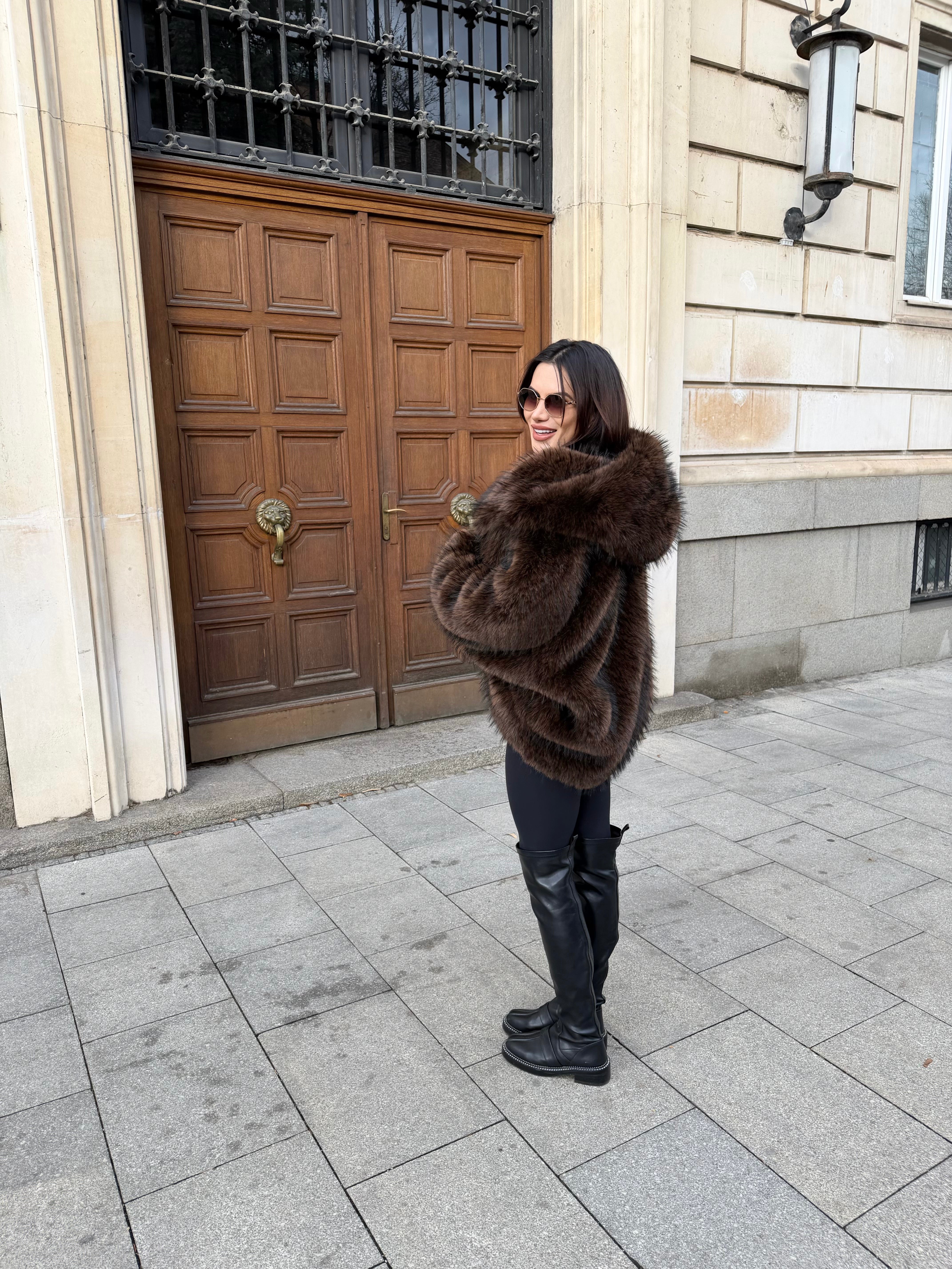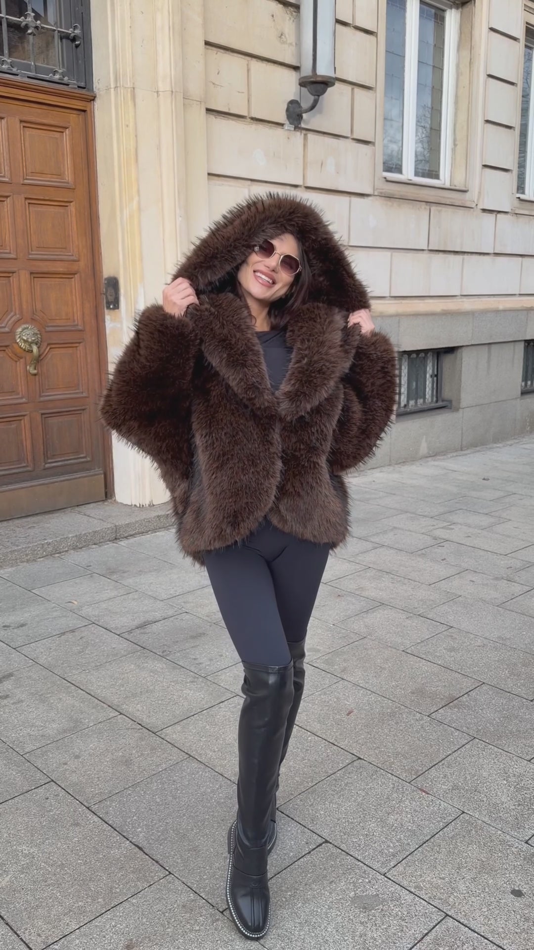 Луксозно oversize пухено яке от премиум еко-козина в дълбок шоколадов нюанс. Универсален размер, плътна текстура и удължен гръб за елегантен, издължен силует. Създадено за топлина, комфорт и модерен Deluxe вид.
