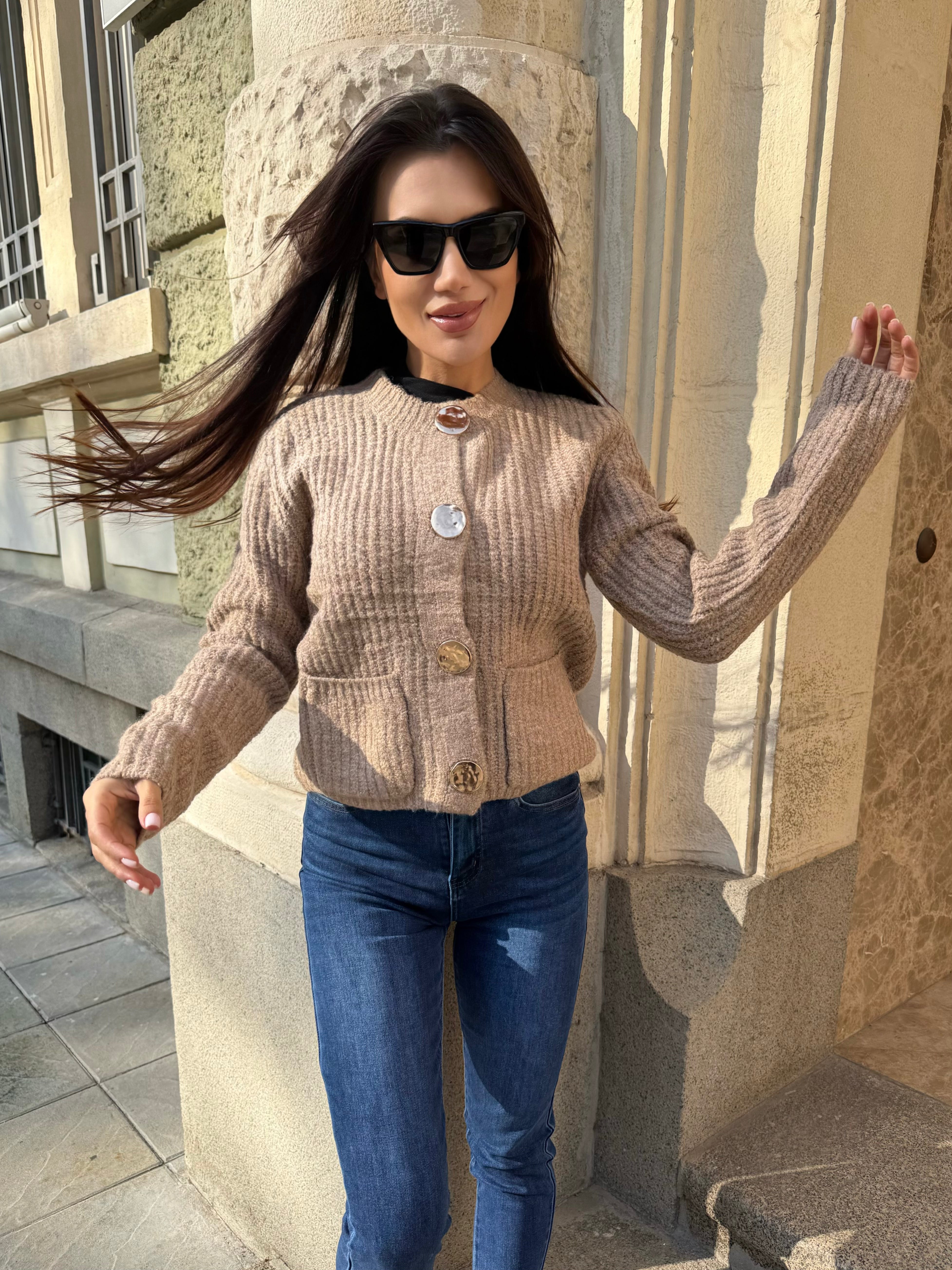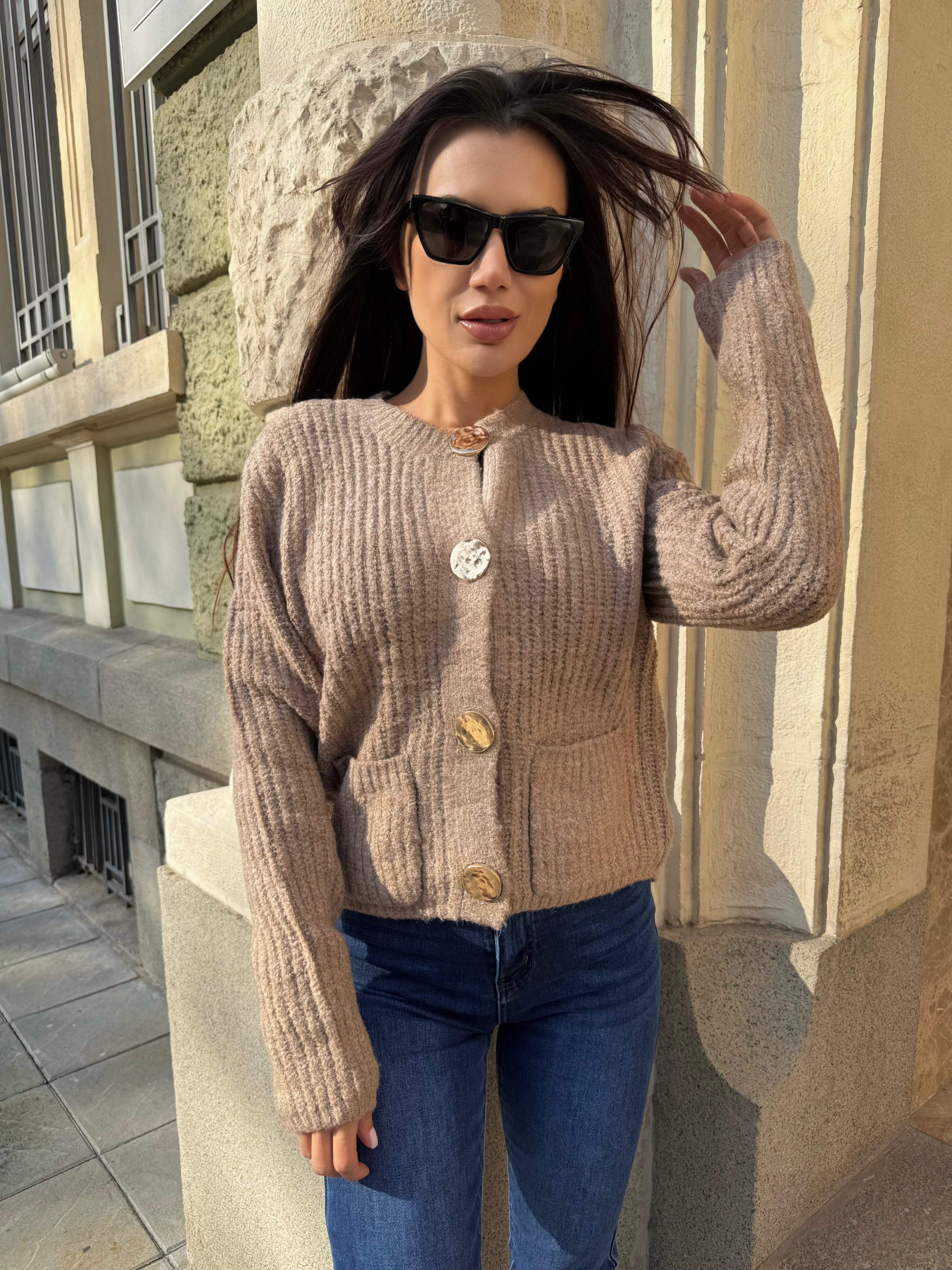 Изработена от топло рипсено плетиво и украсена с луксозни златни копчета, които добавят изтънчен блясък към всяка визия.