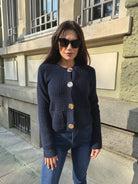 Изработена от топло рипсено плетиво и украсена с луксозни златни копчета, които добавят изтънчен блясък към всяка визия.
