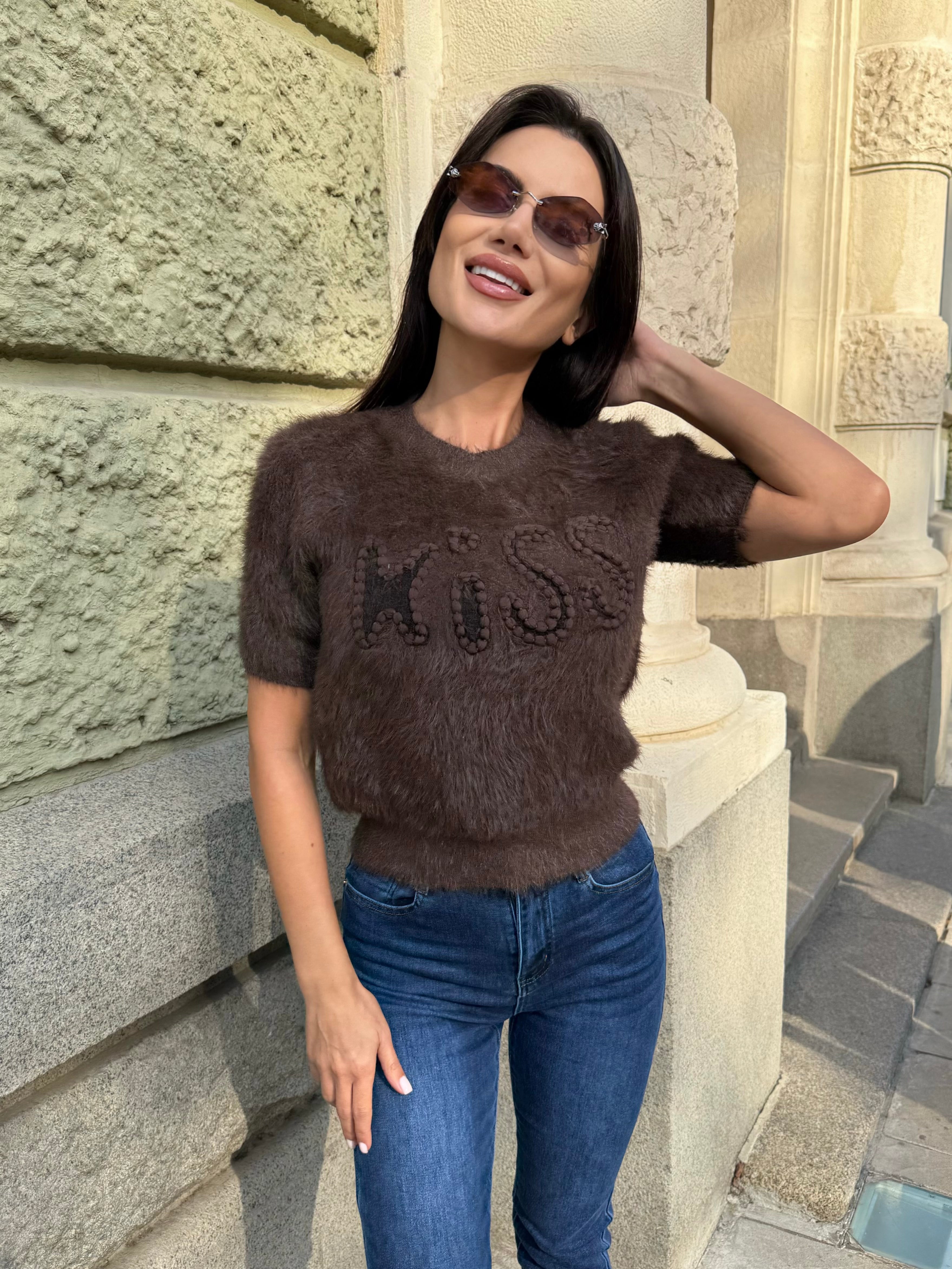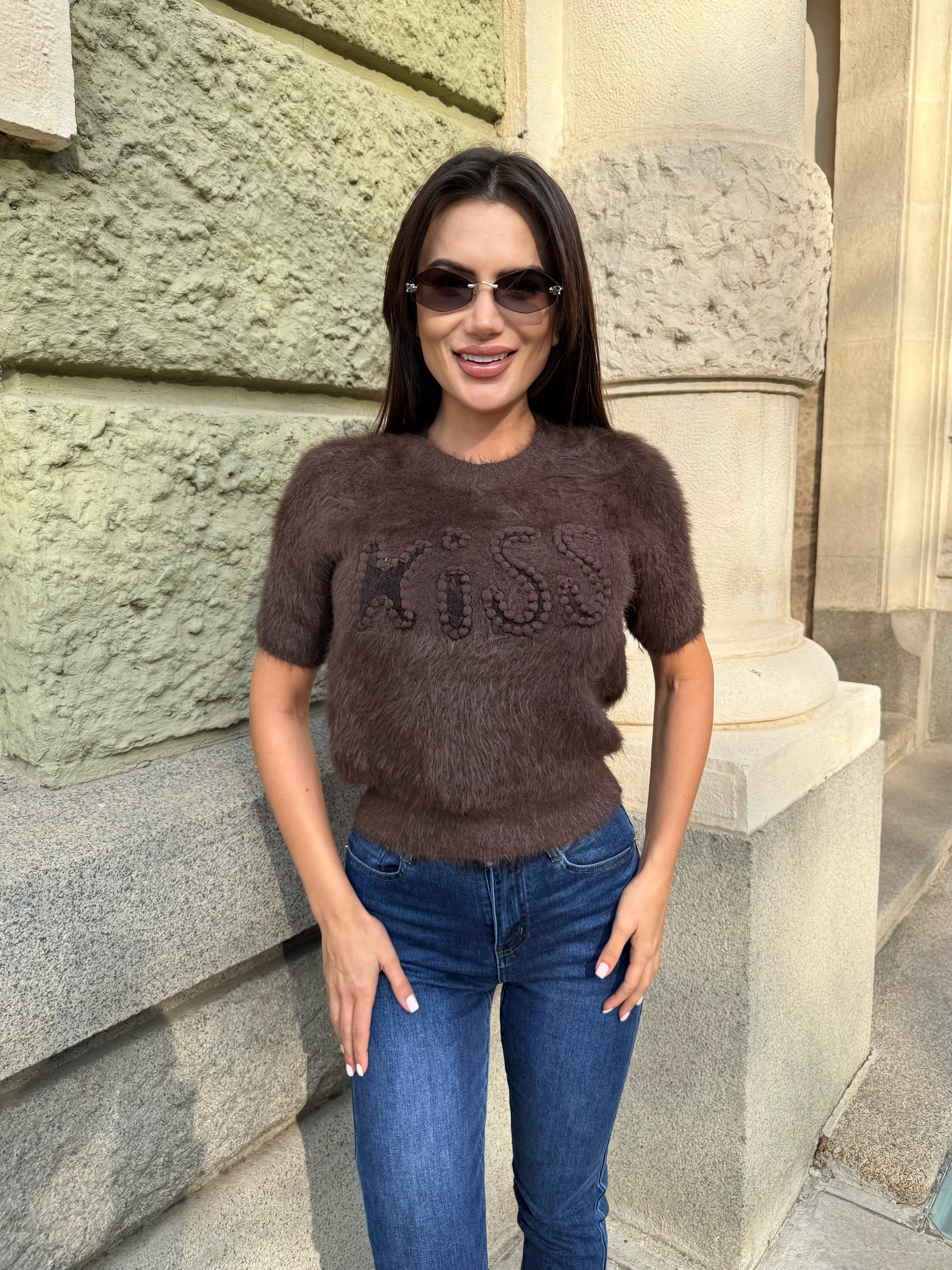 Стилен пуловер с надпис KISS, изработен от мека мъхеста материя, която придава деликатен обем и луксозно усещане. Моделът е с къса дължина и приляга красиво към тялото, подчертавайки талията. Идеален за ежедневен шик или за небрежно елегантна визия с дънки и ботуши.