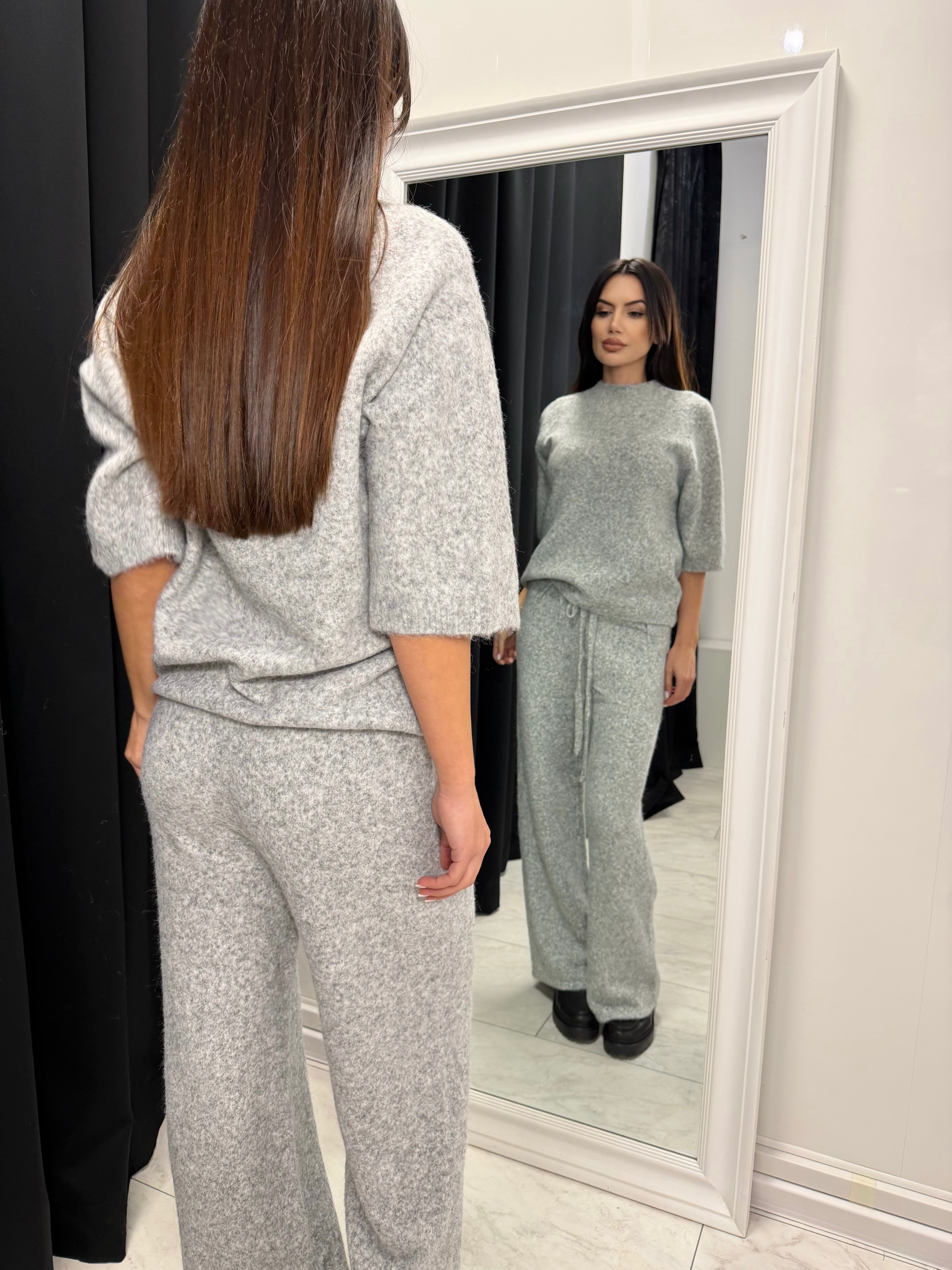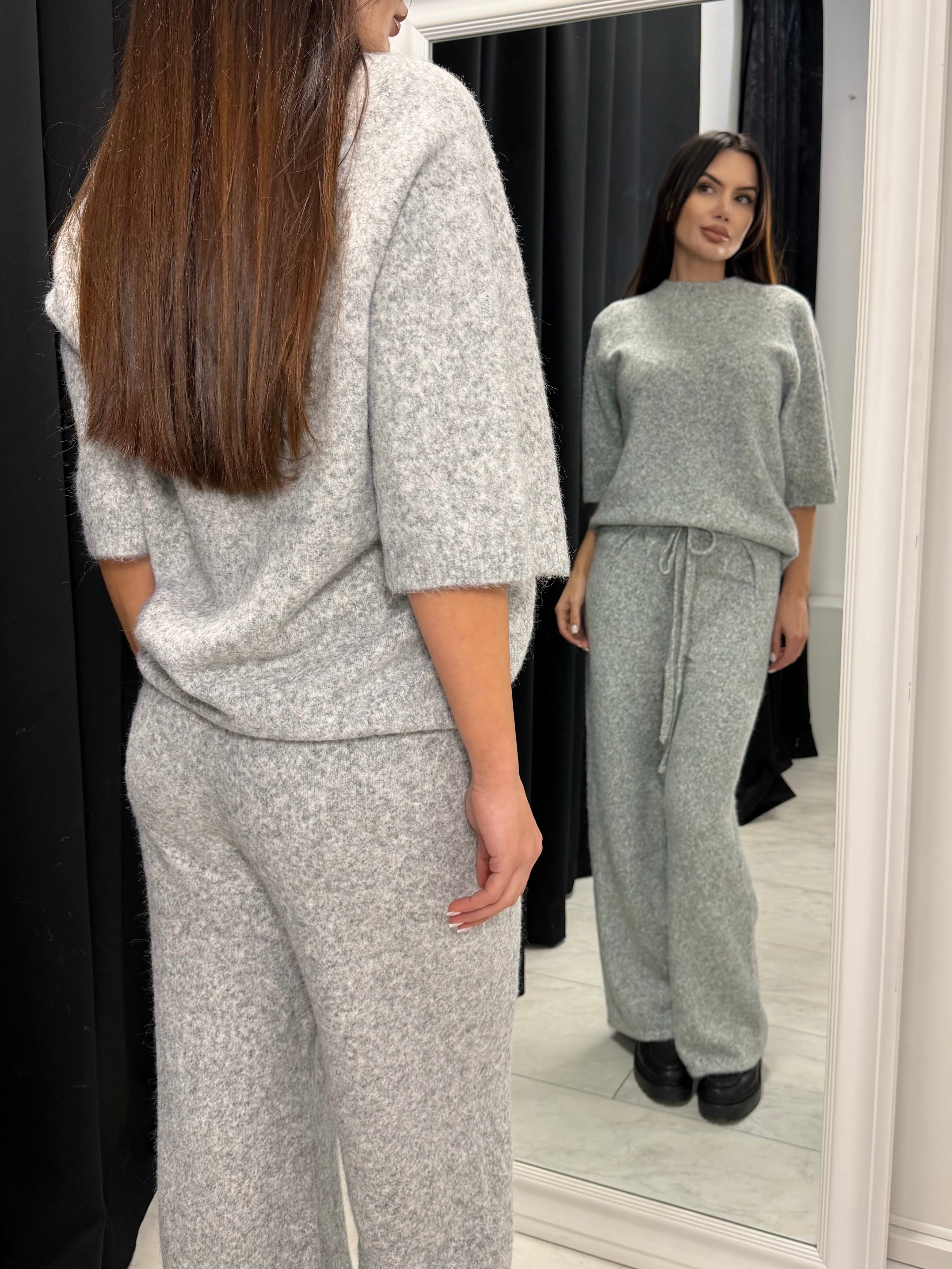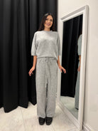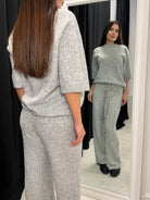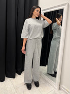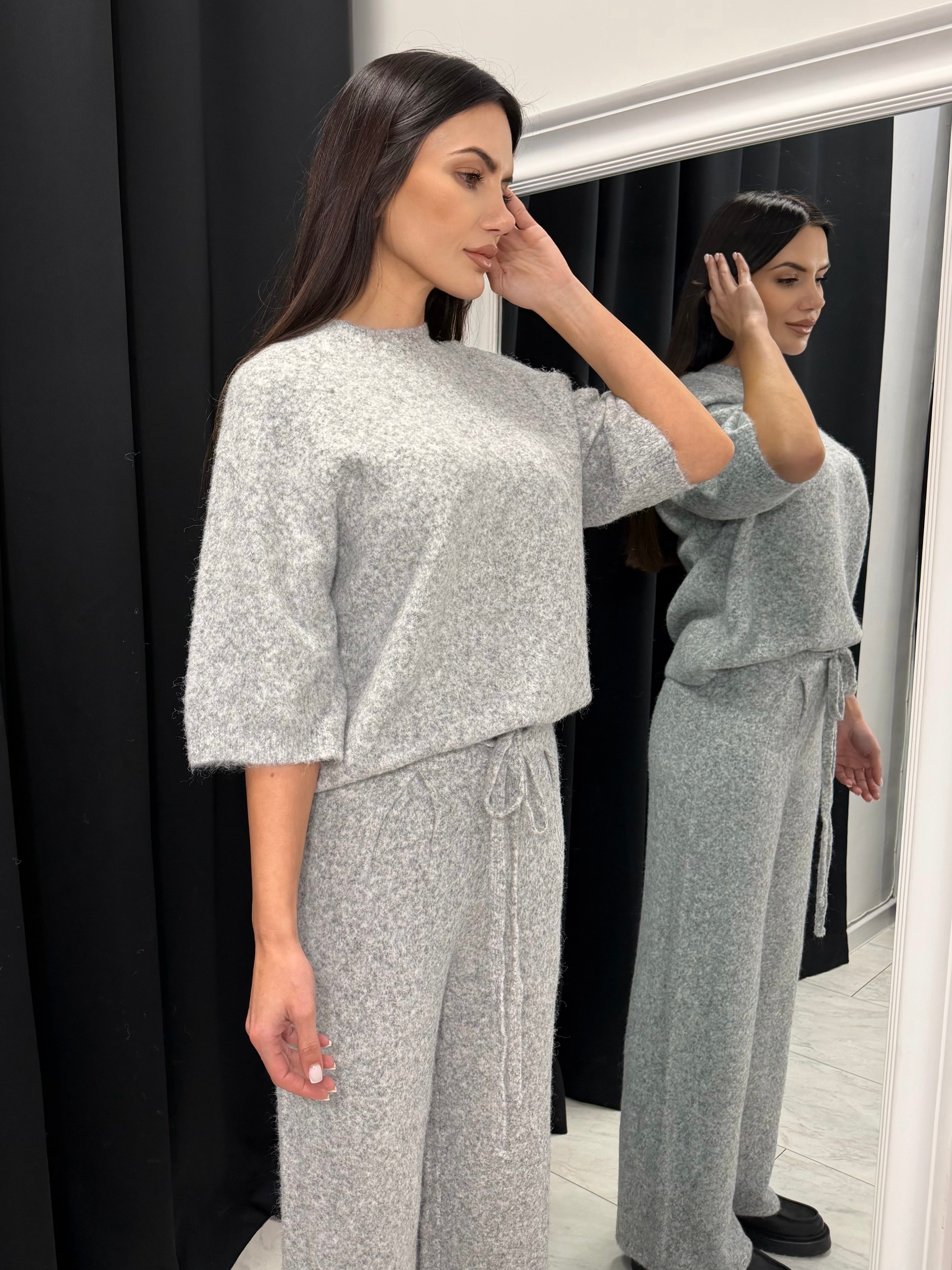 Горната част е със свободен силует и паднал ръкав, което създава модерна линия и изчистена визия. Панталонът е с висока талия, широк крачол и ластик с връзки за перфектно адаптиране към фигурата. Дизайнът е вдъхновен от спокойния лукс – effortless, стилен и подходящ за всяко ежедневие.