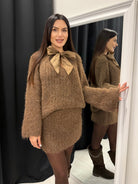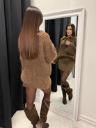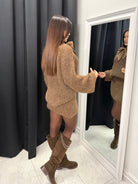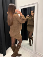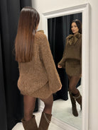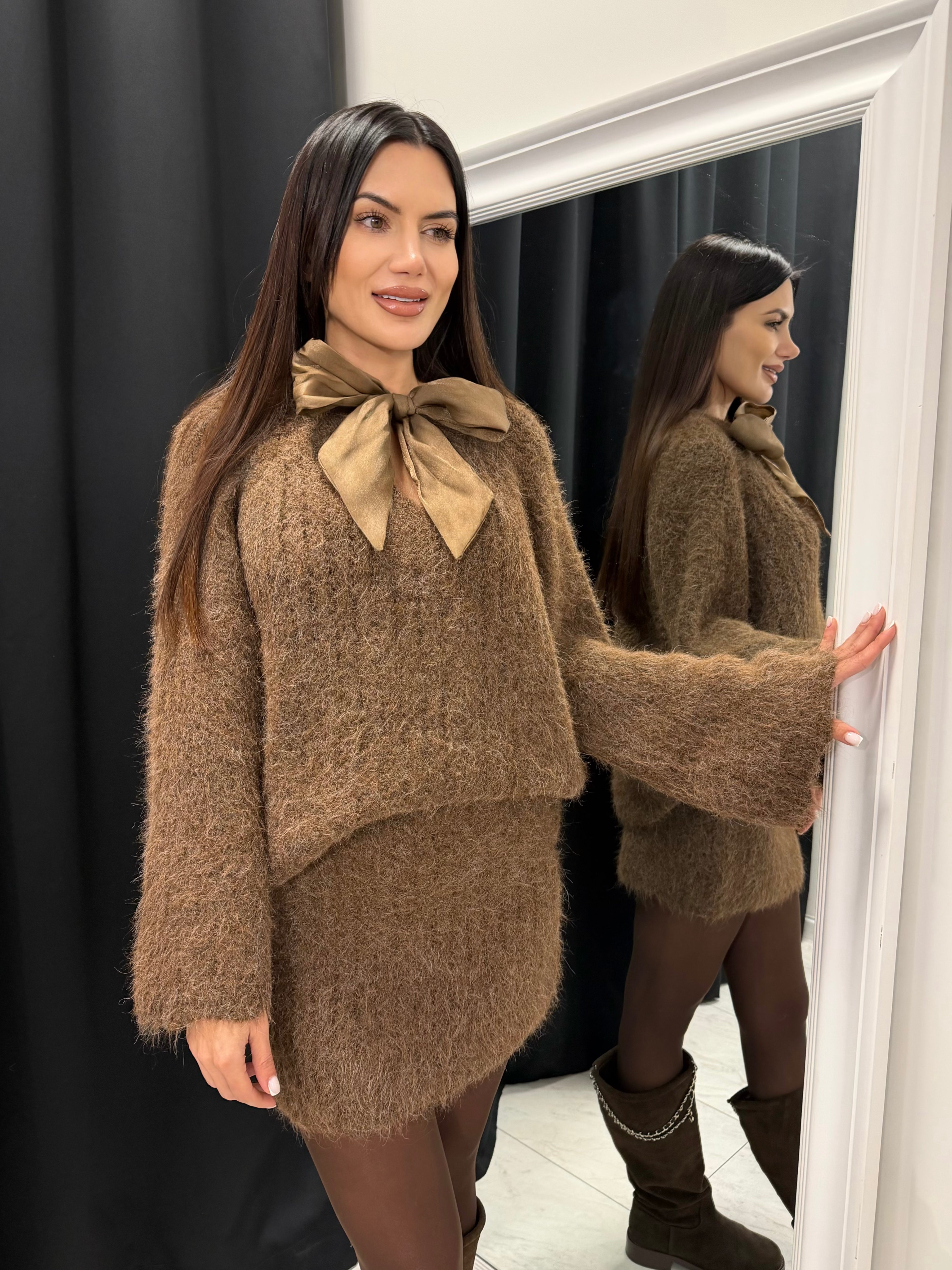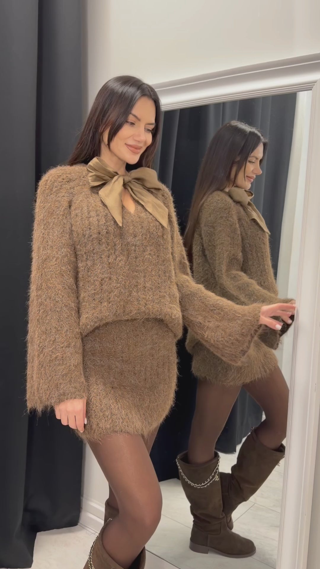 Комплектът включва свободен пуловер и еластична пола, които оформят красив силует и осигуряват удобство през целия ден. Перфектен избор за стилни есенно-зимни визии – от ежедневни до по-елегантни поводи.