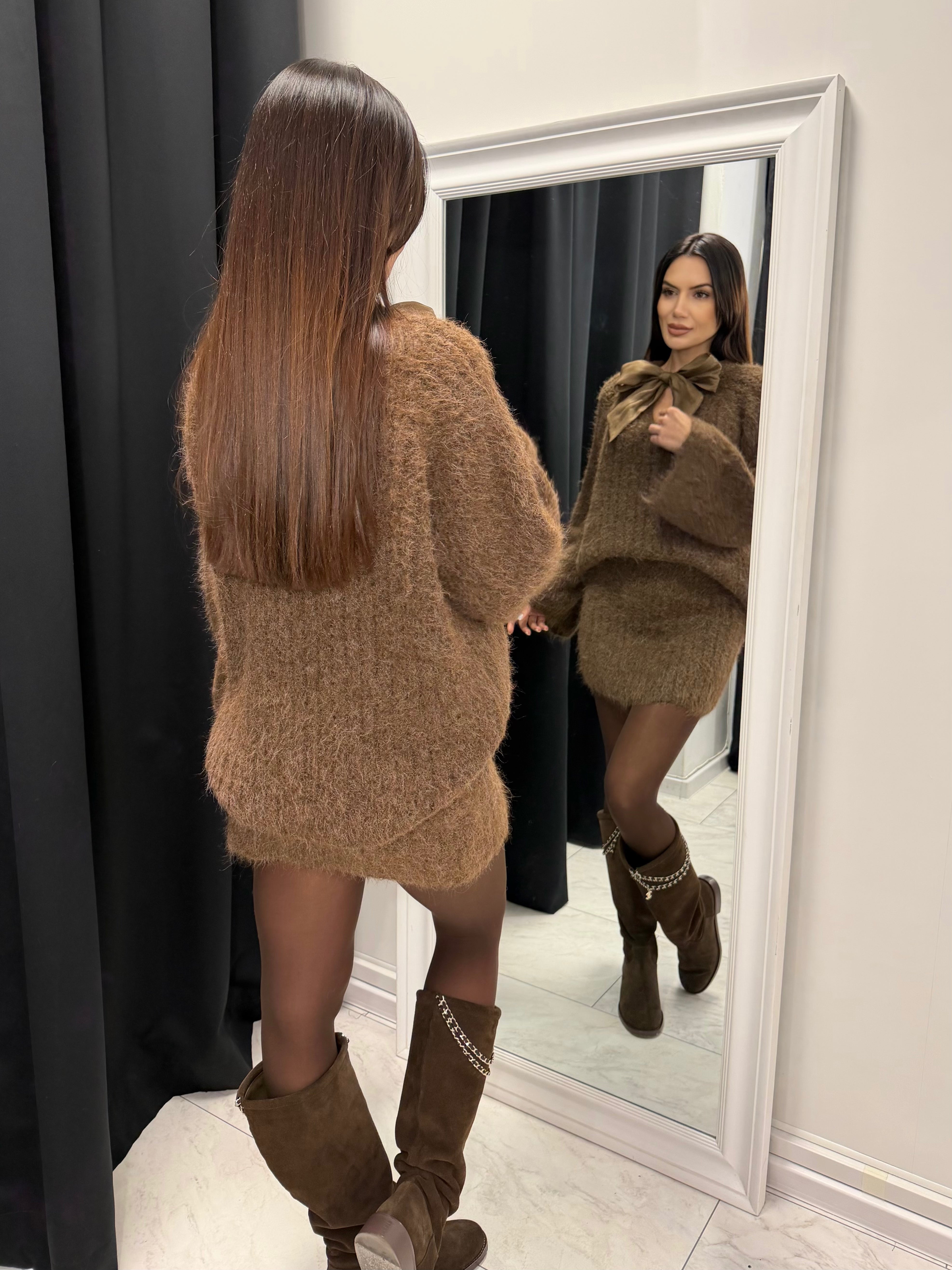 Луксозен плетен комплект, който съчетава мекота, комфорт и изразена женственост. Фината панделка при деколтето придава луксозен и романтичен акцент, а пухкавата плетка създава усещане за топлина и уют.