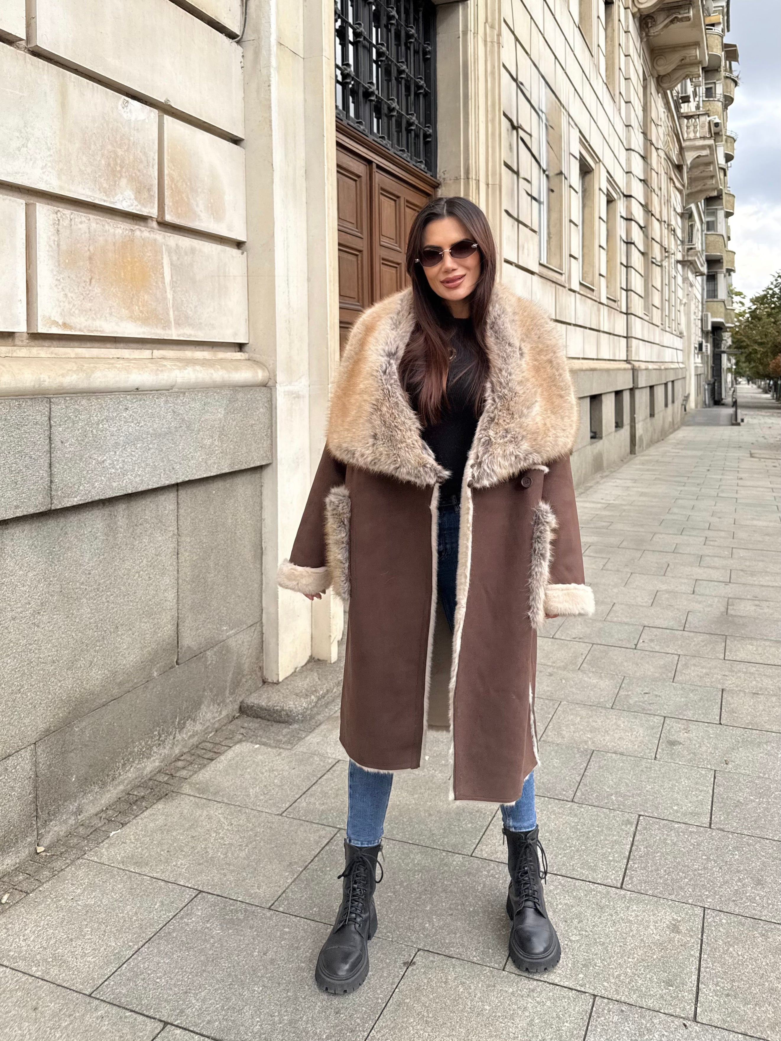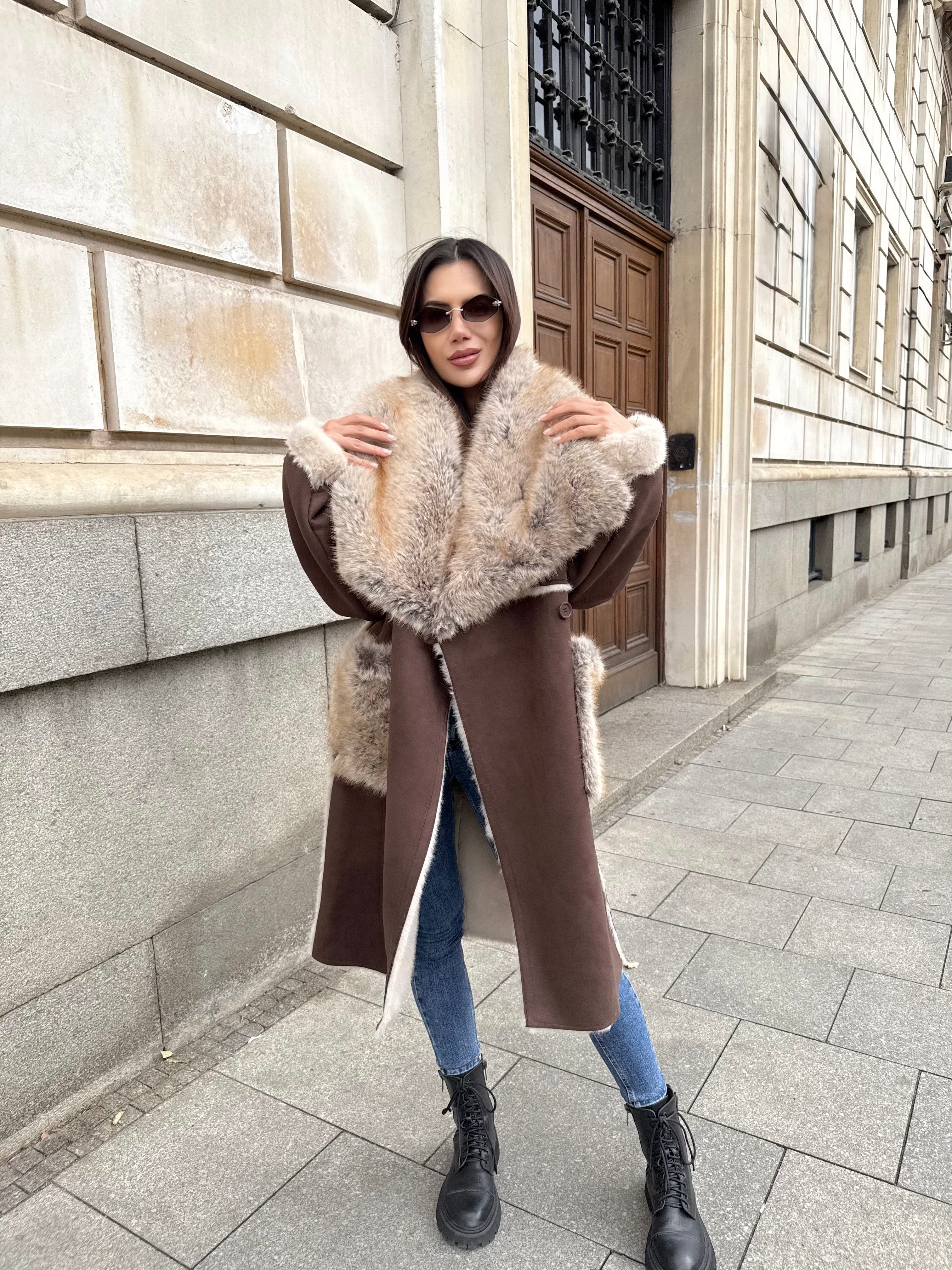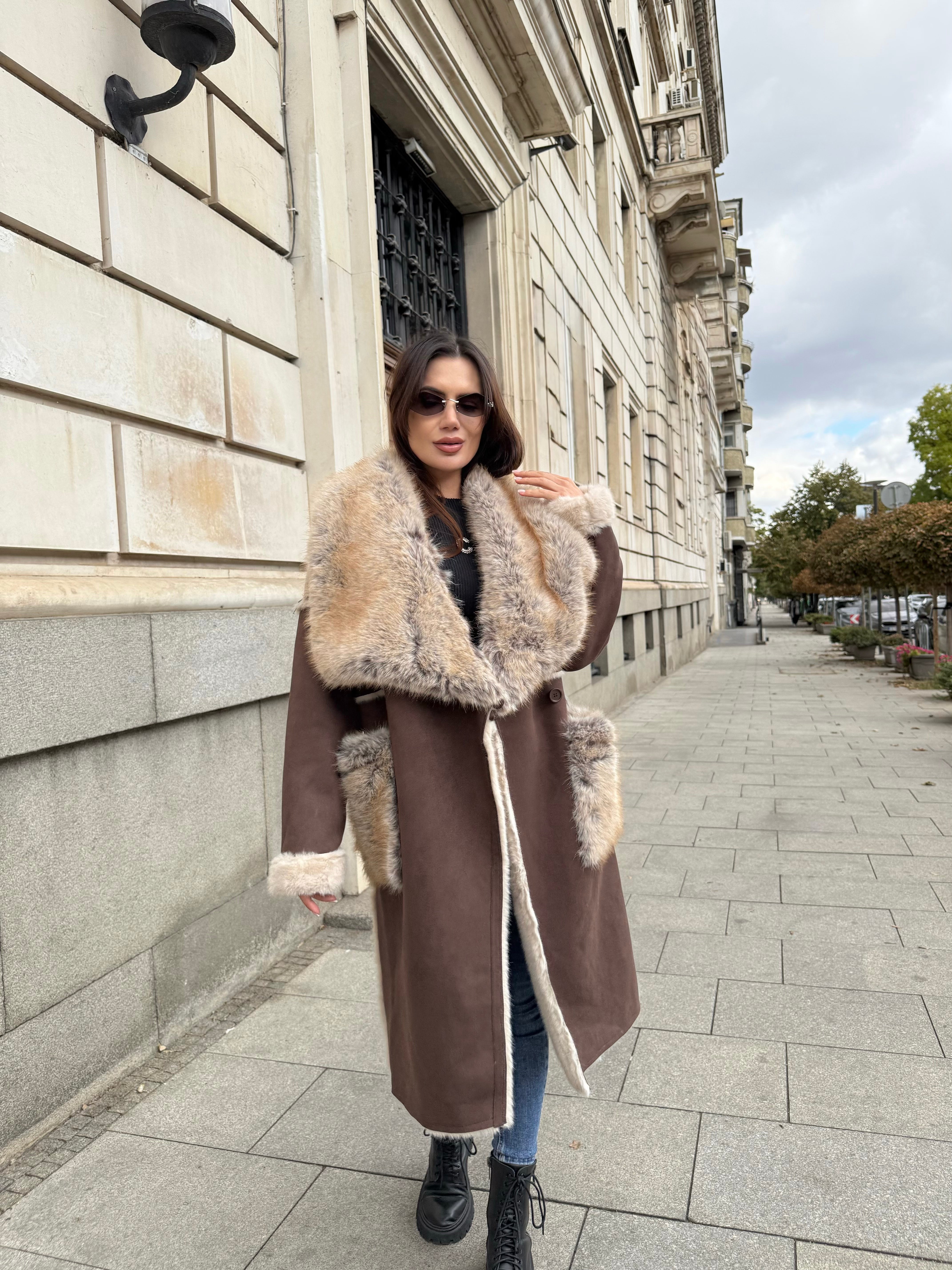 Луксозно зимно палто в топъл шоколадов нюанс с обемна яка и маншети от еко косъм. Изработено от мек велурен плат с плътна силиконова вата отвътре за максимален комфорт и топлина. Елегантният дизайн съчетава модерна визия и класическа линия – перфектен избор за градския зимен стил.