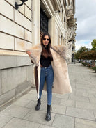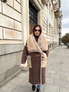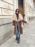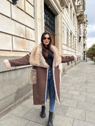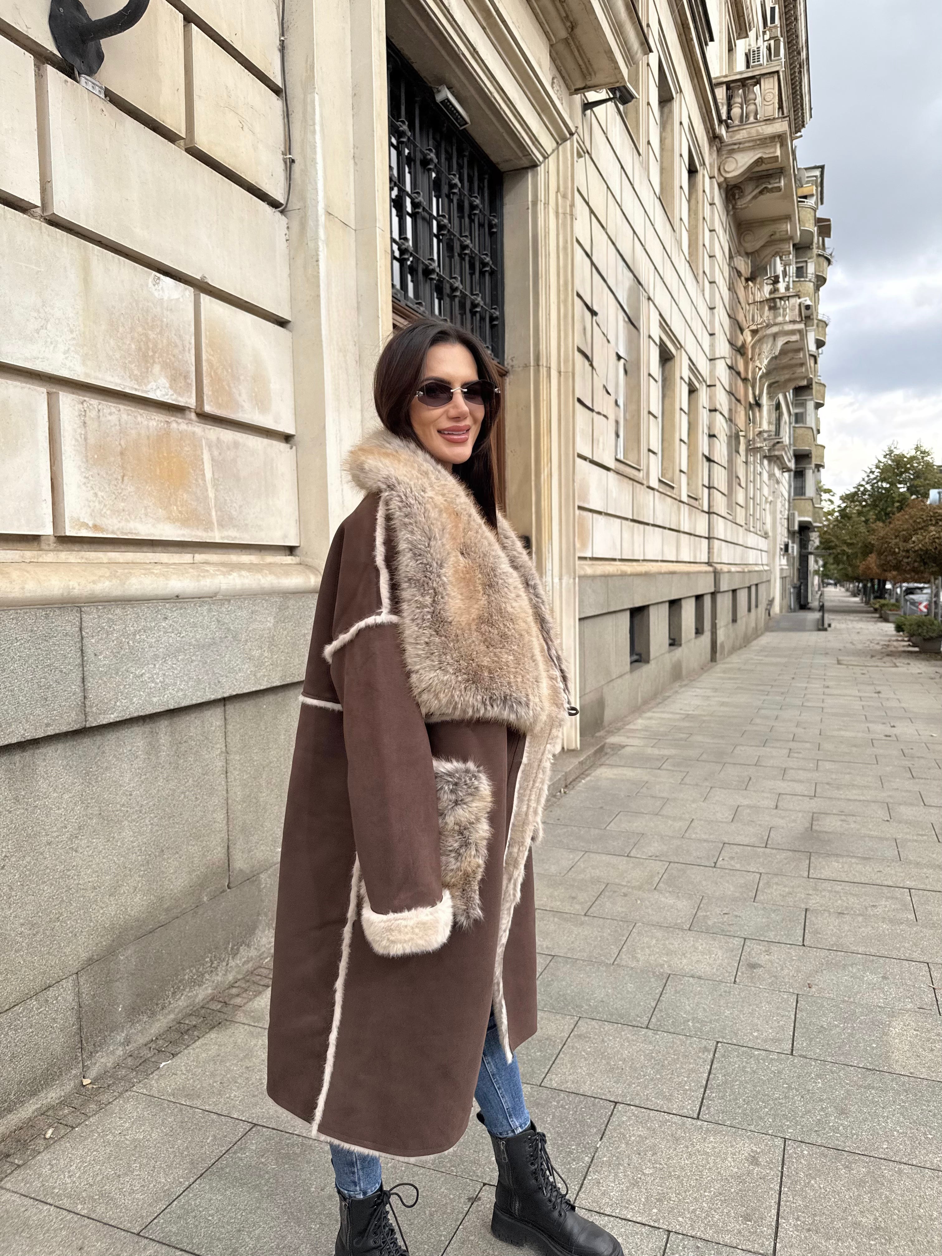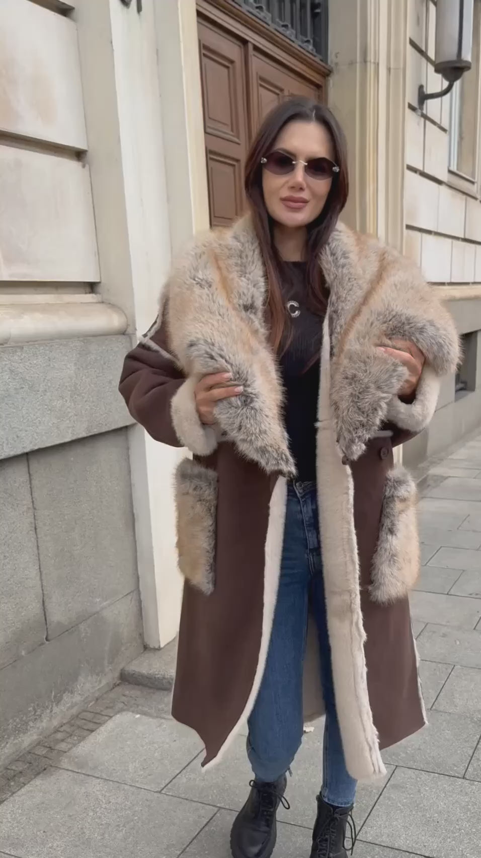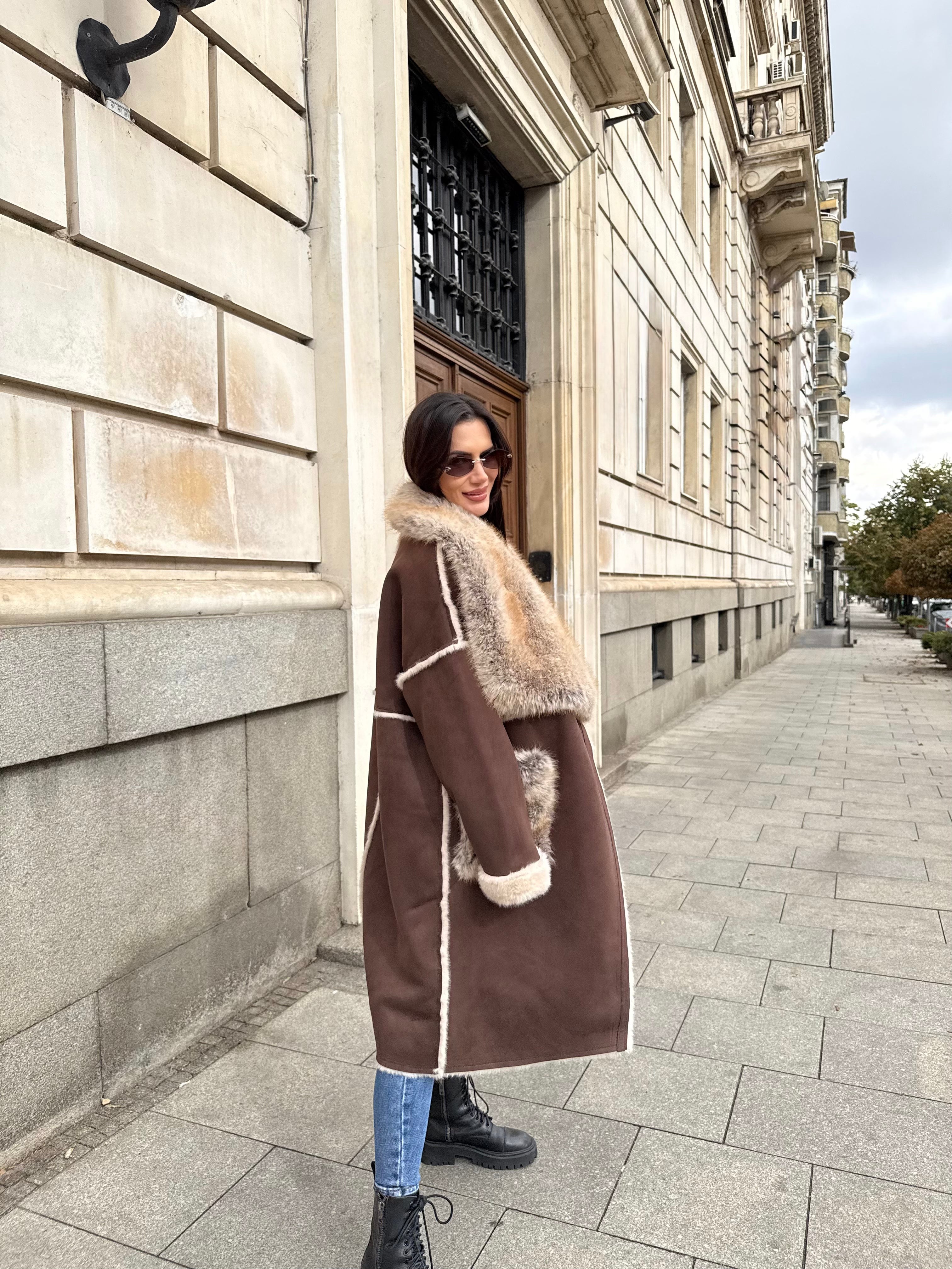 Луксозно зимно палто в топъл шоколадов нюанс с обемна яка и маншети от еко косъм. Изработено от мек велурен плат с плътна силиконова вата отвътре за максимален комфорт и топлина. Елегантният дизайн съчетава модерна визия и класическа линия – перфектен избор за градския зимен стил.