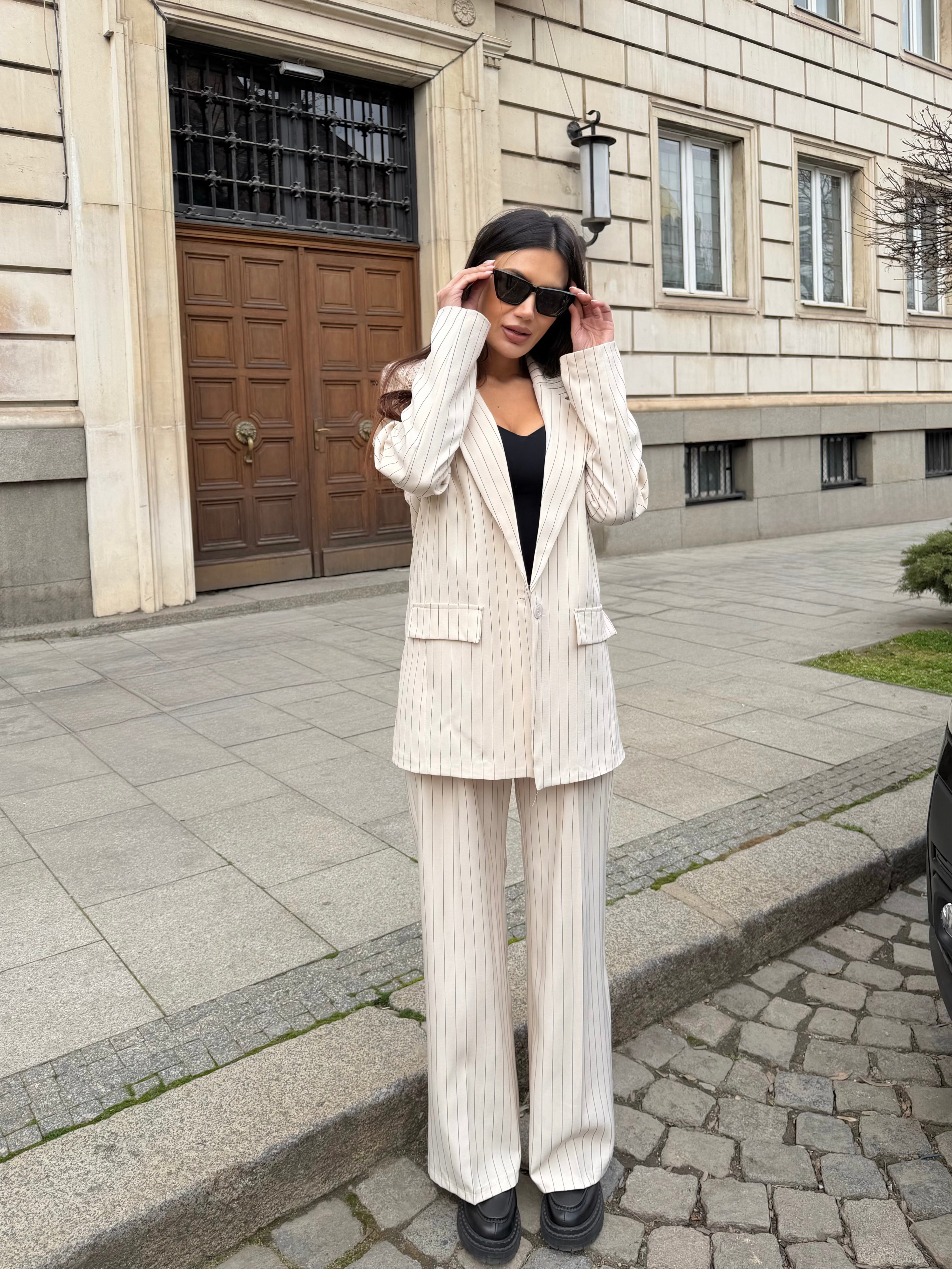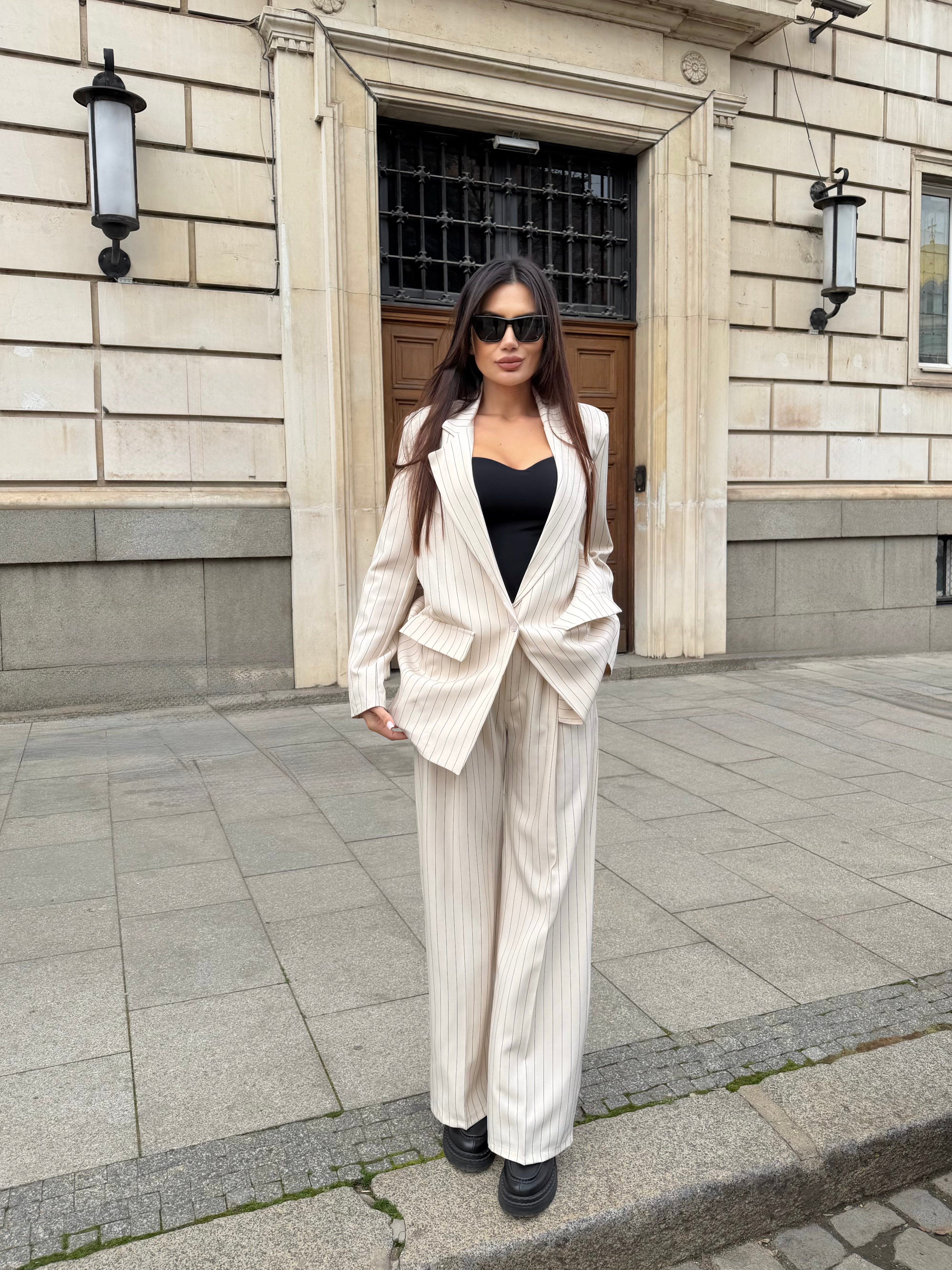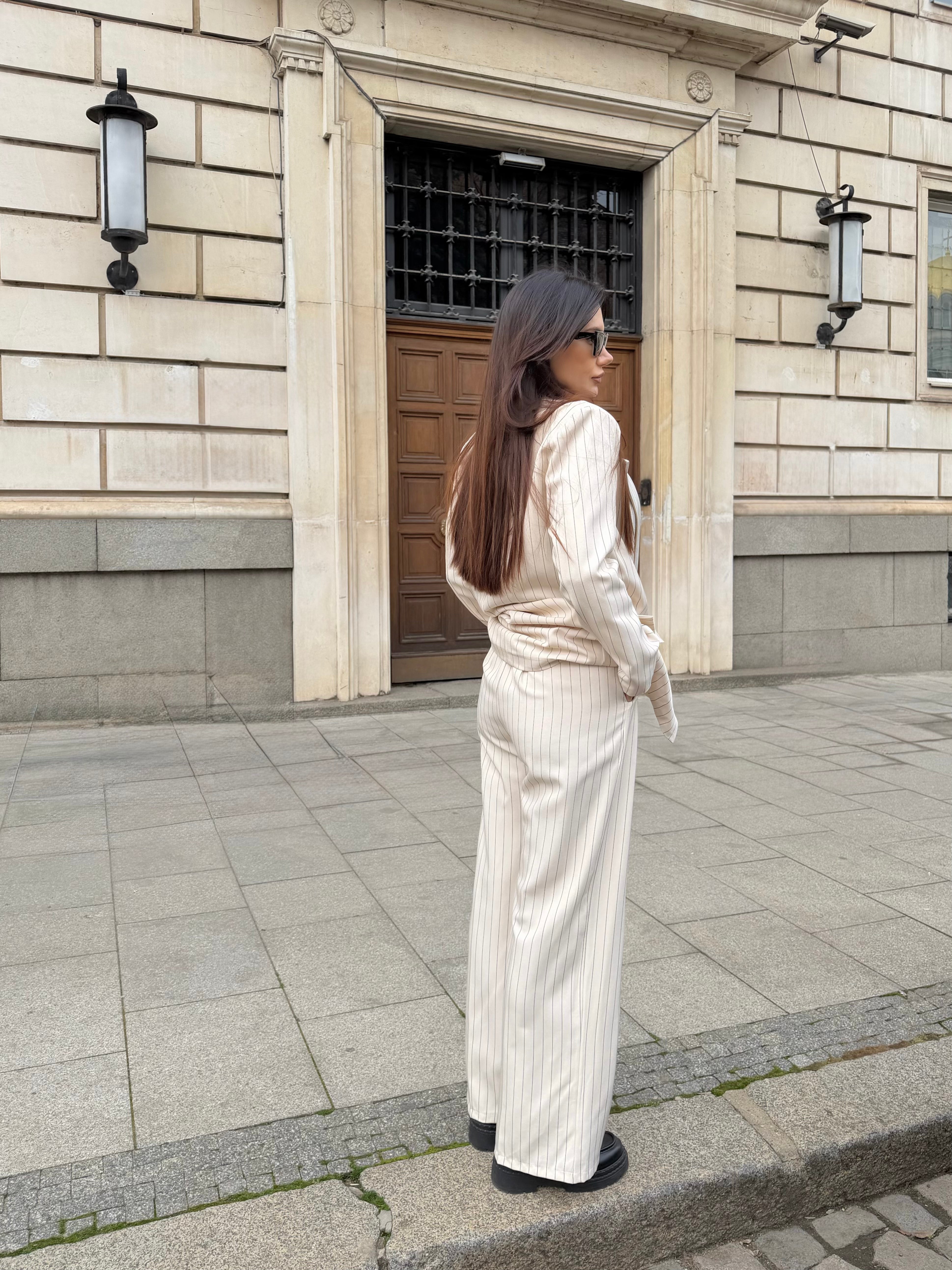 Елегантен дамски костюм от две части, състоящ се от сако и панталон с модерна свободна кройка. Фините вертикални райета придават изтънчен и стилен вид, който издължава силуета.
