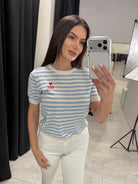 Стилен раиран топ с къс ръкав, изработен от мека и еластична материя, която осигурява комфорт през целия ден. Моделът е с класическо кръгло деколте и фин бродиран детайл „Always Bonita“, който придава женствен и модерен акцент.