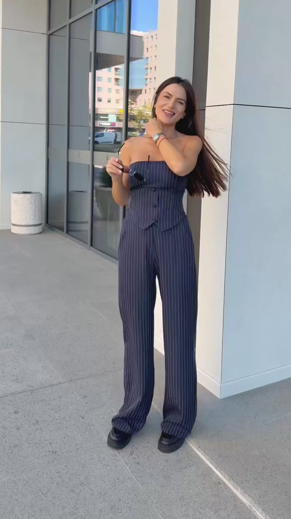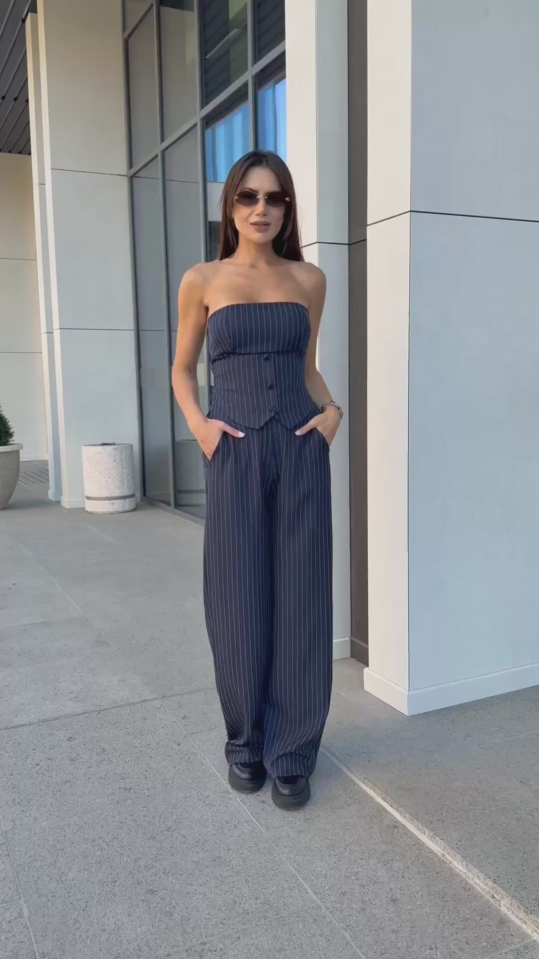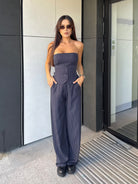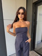 Стилен комплект от бюстие с корсетна линия и панталон с висока талия в класическо райе. Бюстието оформя силуета и подчертава женствеността, като е допълнено с еластична задна част за максимален комфорт и декоративни копчета отпред.