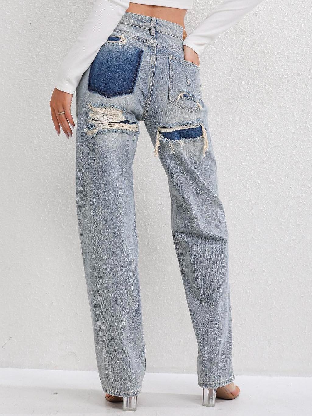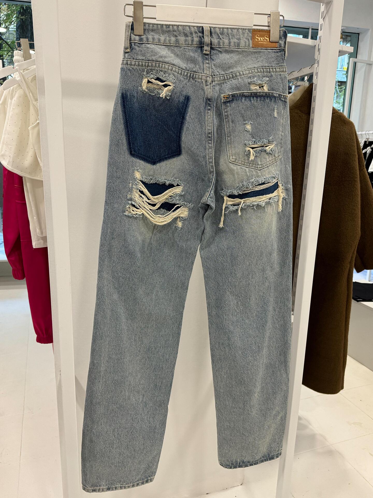Изчистен модел ДЪНКИ с прави крачоли и висока талия. Материята плътен деним без еластан, с ефвктна накъсана задната част.