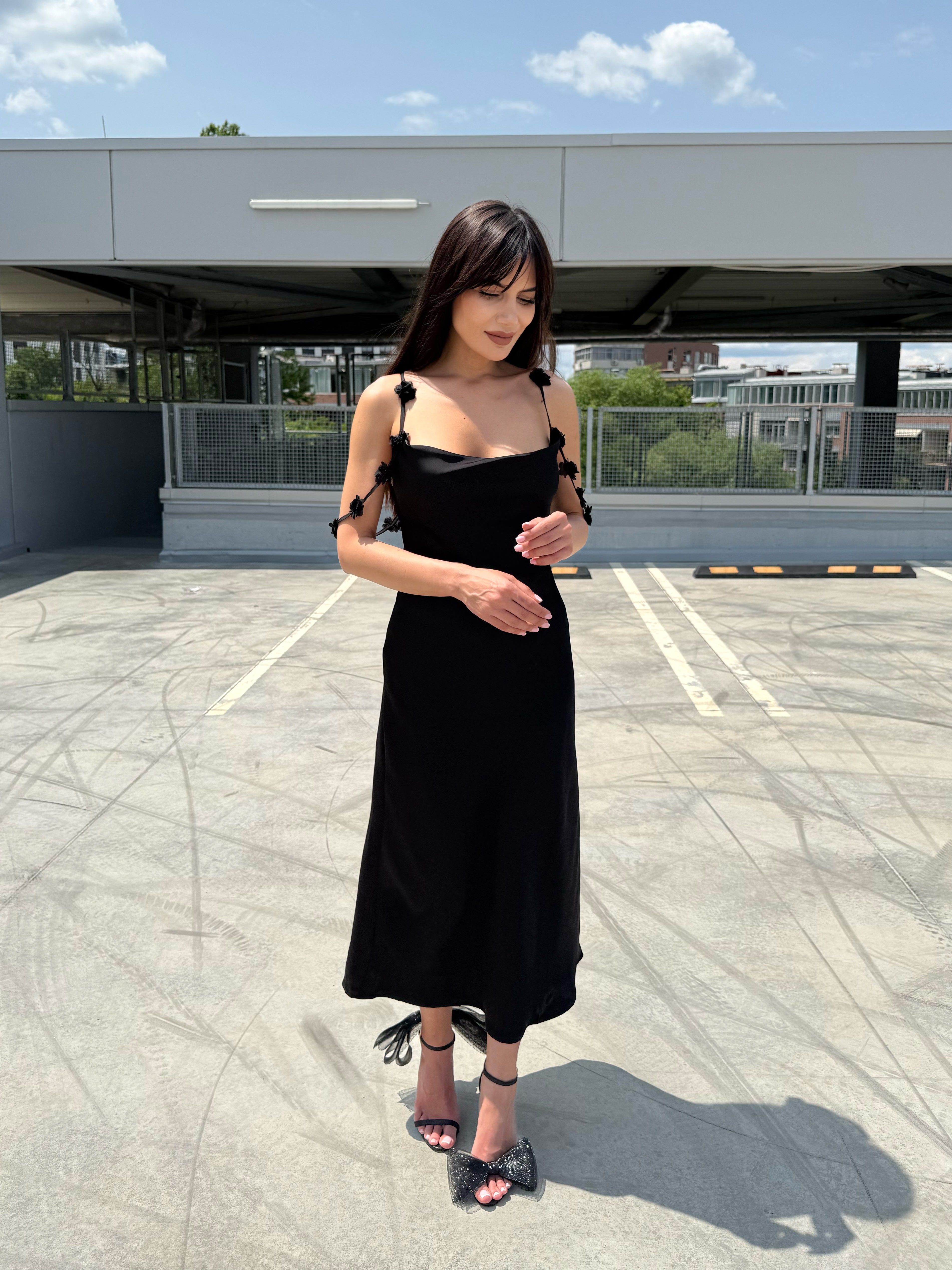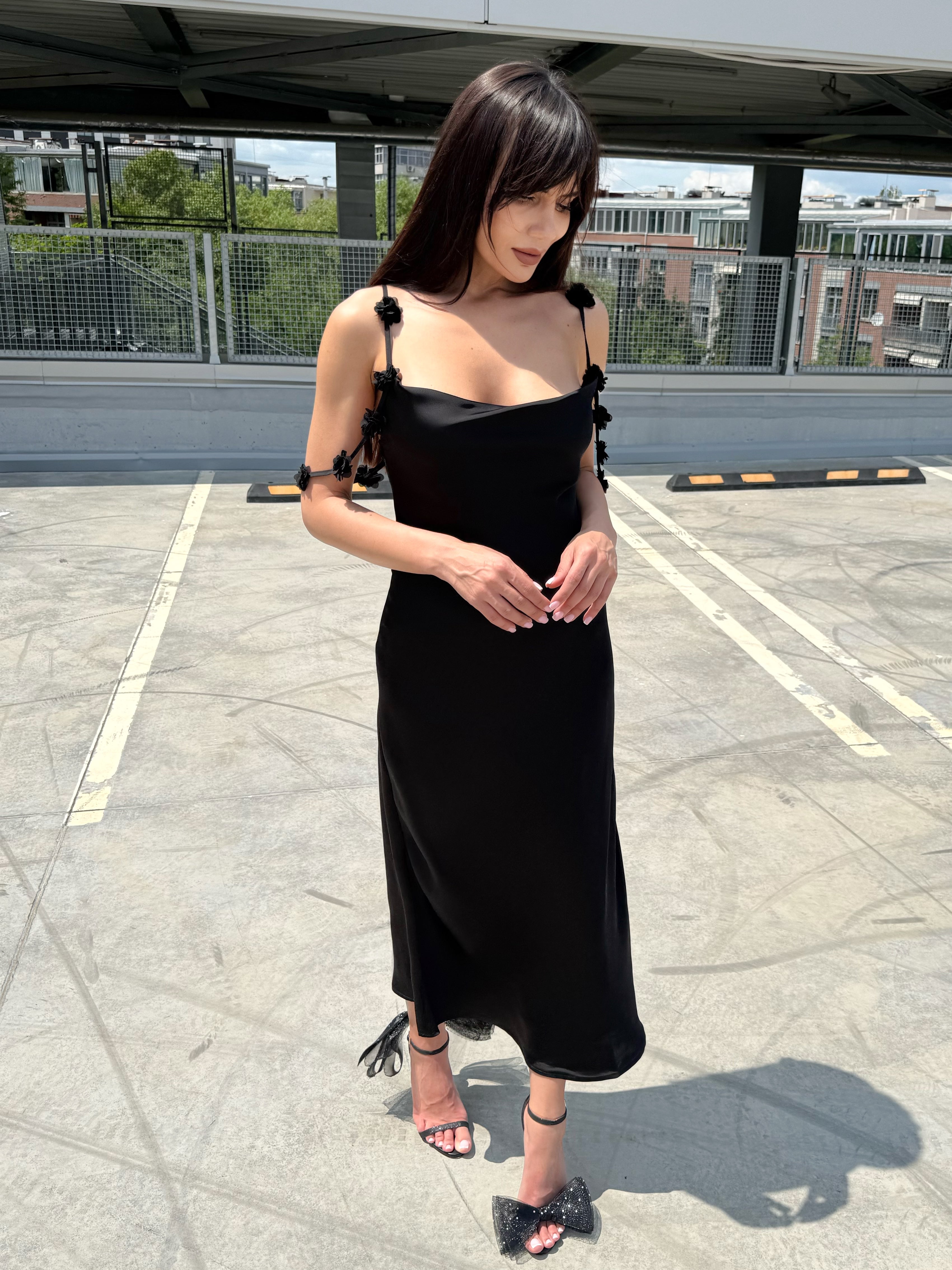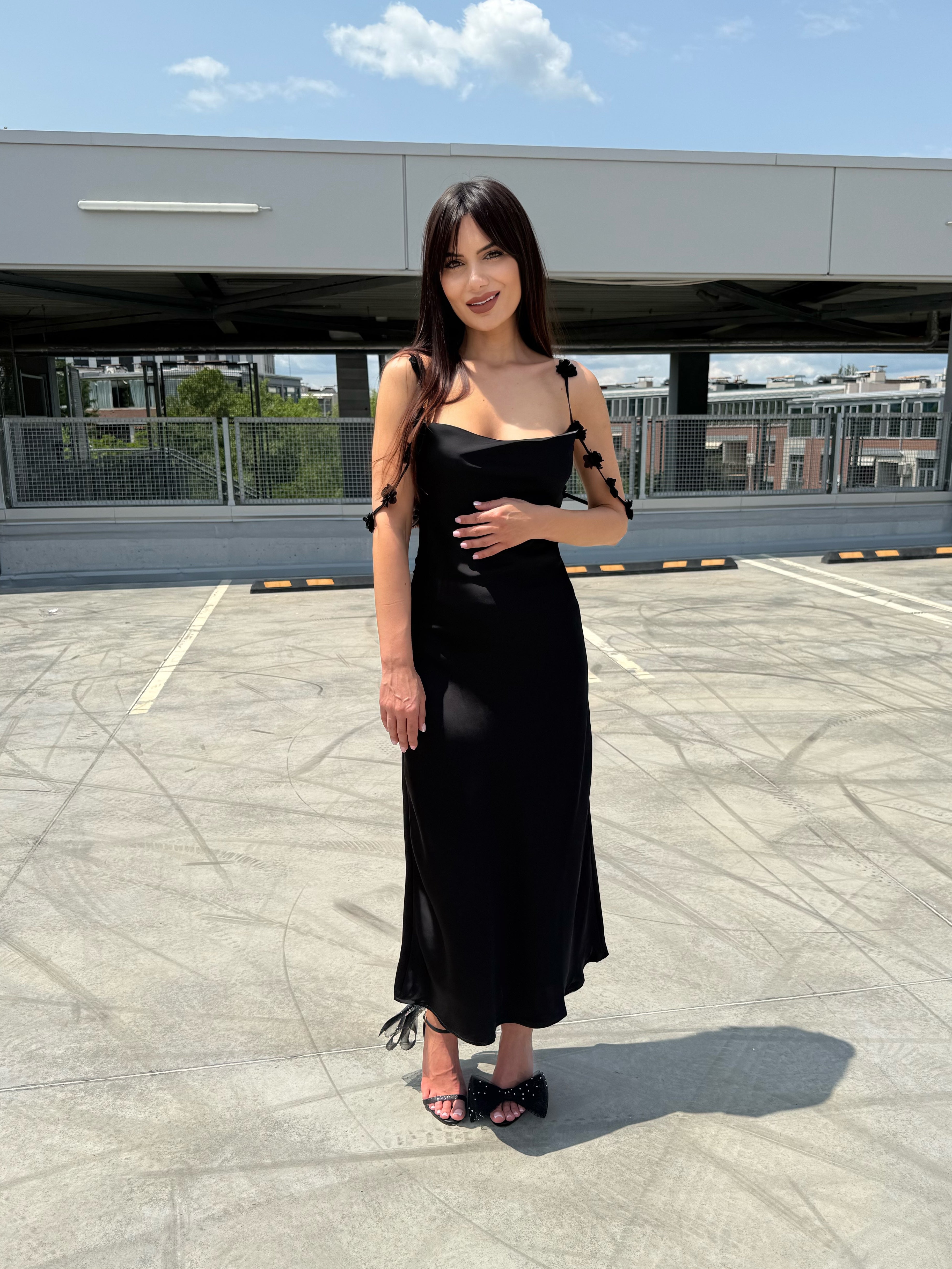 Изчистена визия с романтични детайли – Roché Noir е рокля, която съчетава минимализъм и женственост по изискан начин. Изработена от мека, фино падаща сатенена материя, тя подчертава силуета без усилие. Тънките презрамки с декоративни цветя придават нежен акцент и създават усещане за лекота и елегантност.