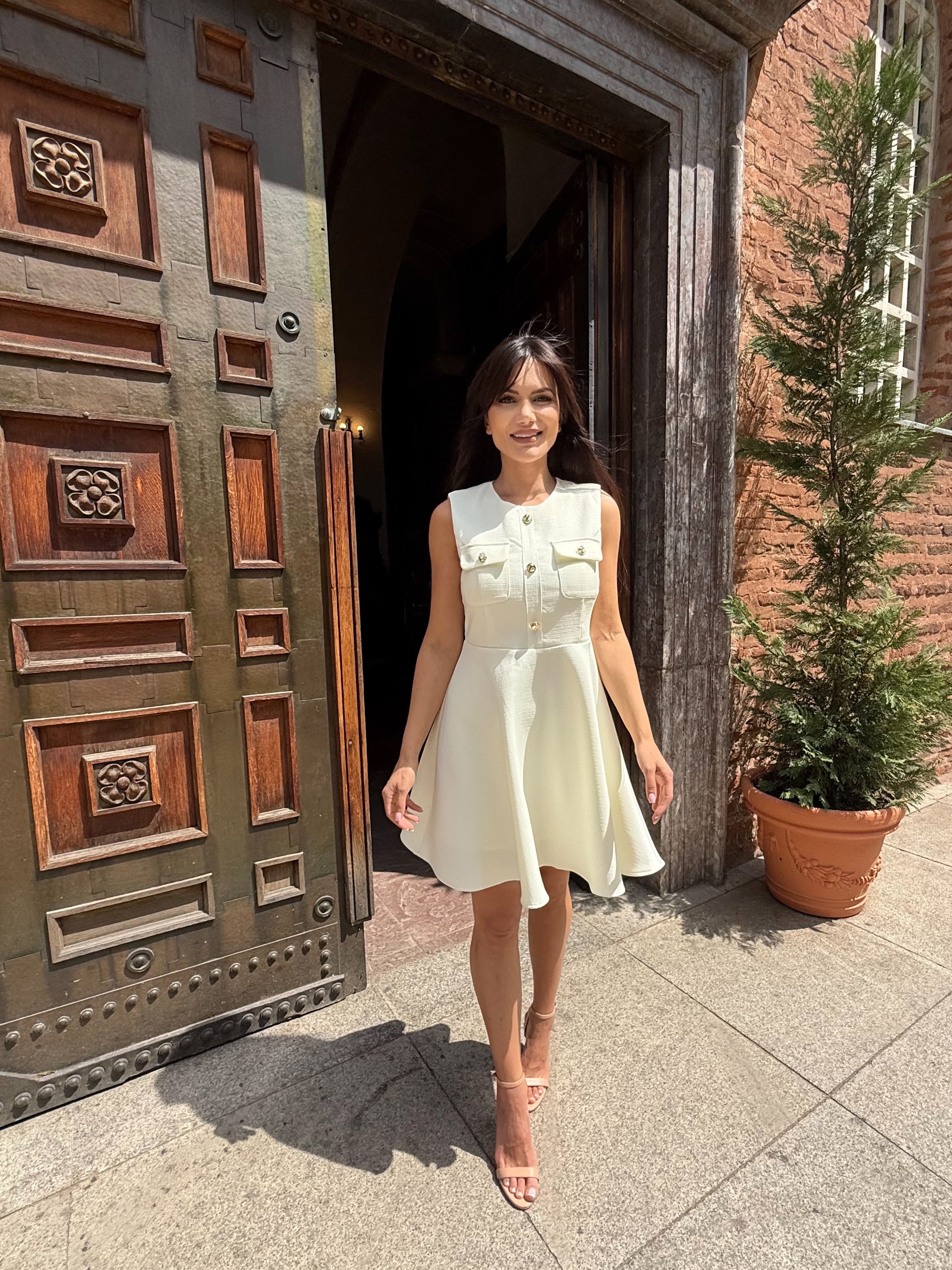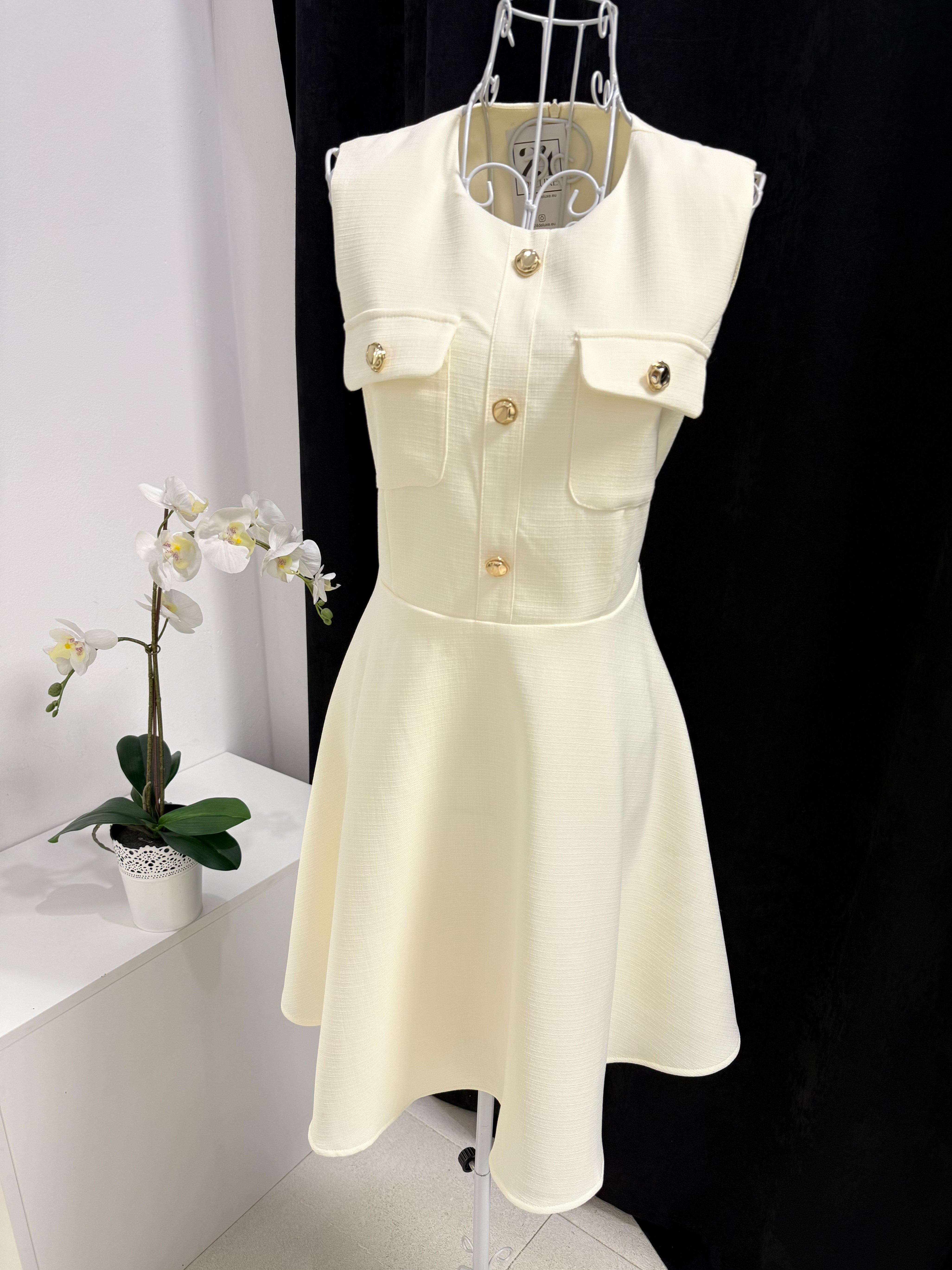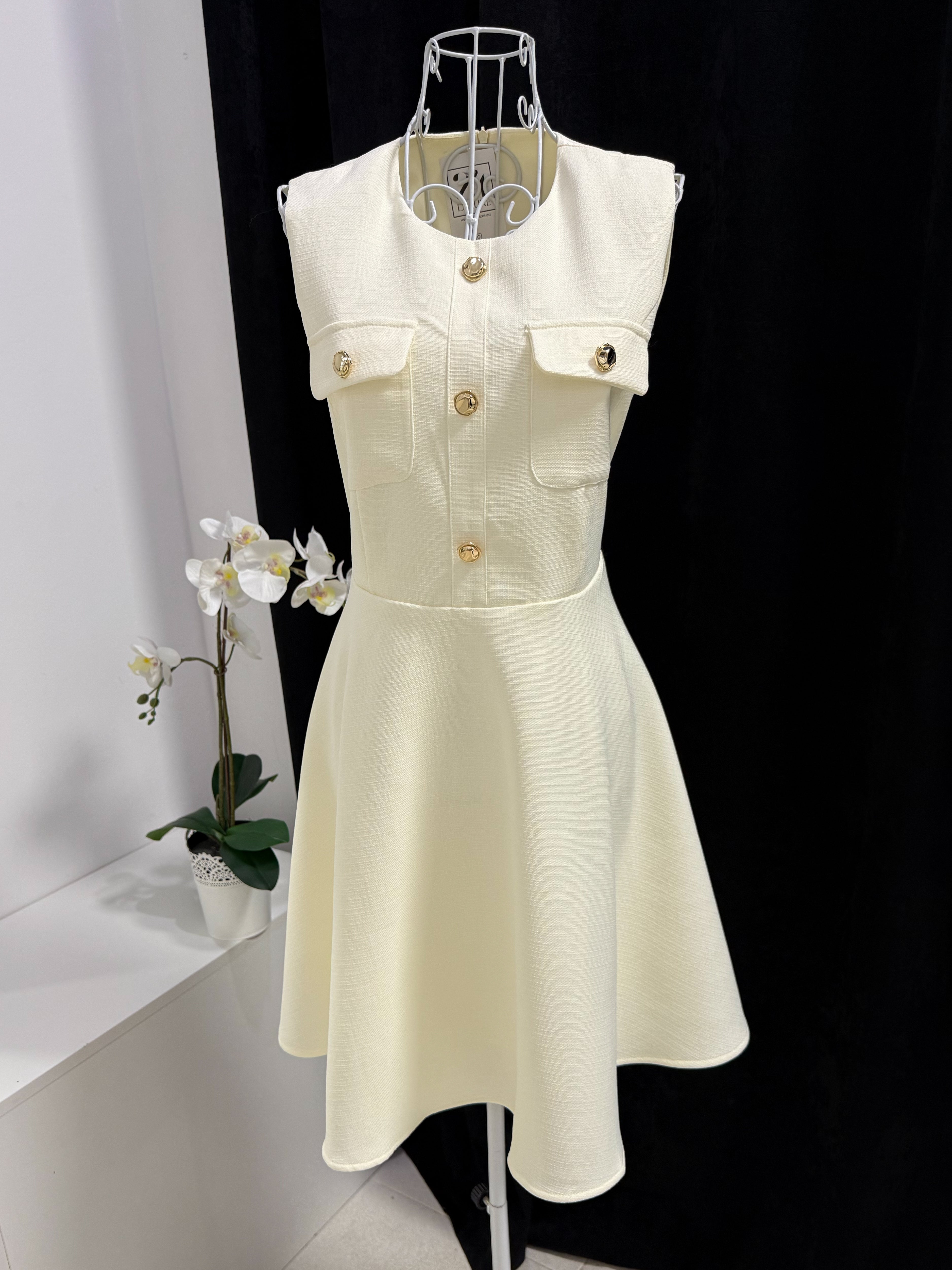 Класиката никога не излиза от мода. Роклята Grace Kelly е въплъщение на женственост, финес и изискан стил. Със структура тип „жилетка“ и декоративни златни копчета в горната част, този модел носи духа на френски шик и холивудска елегантност. Леката А-силуетна форма подчертава талията и издължава фигурата, а скритият цип на гърба осигурява идеално прилягане.