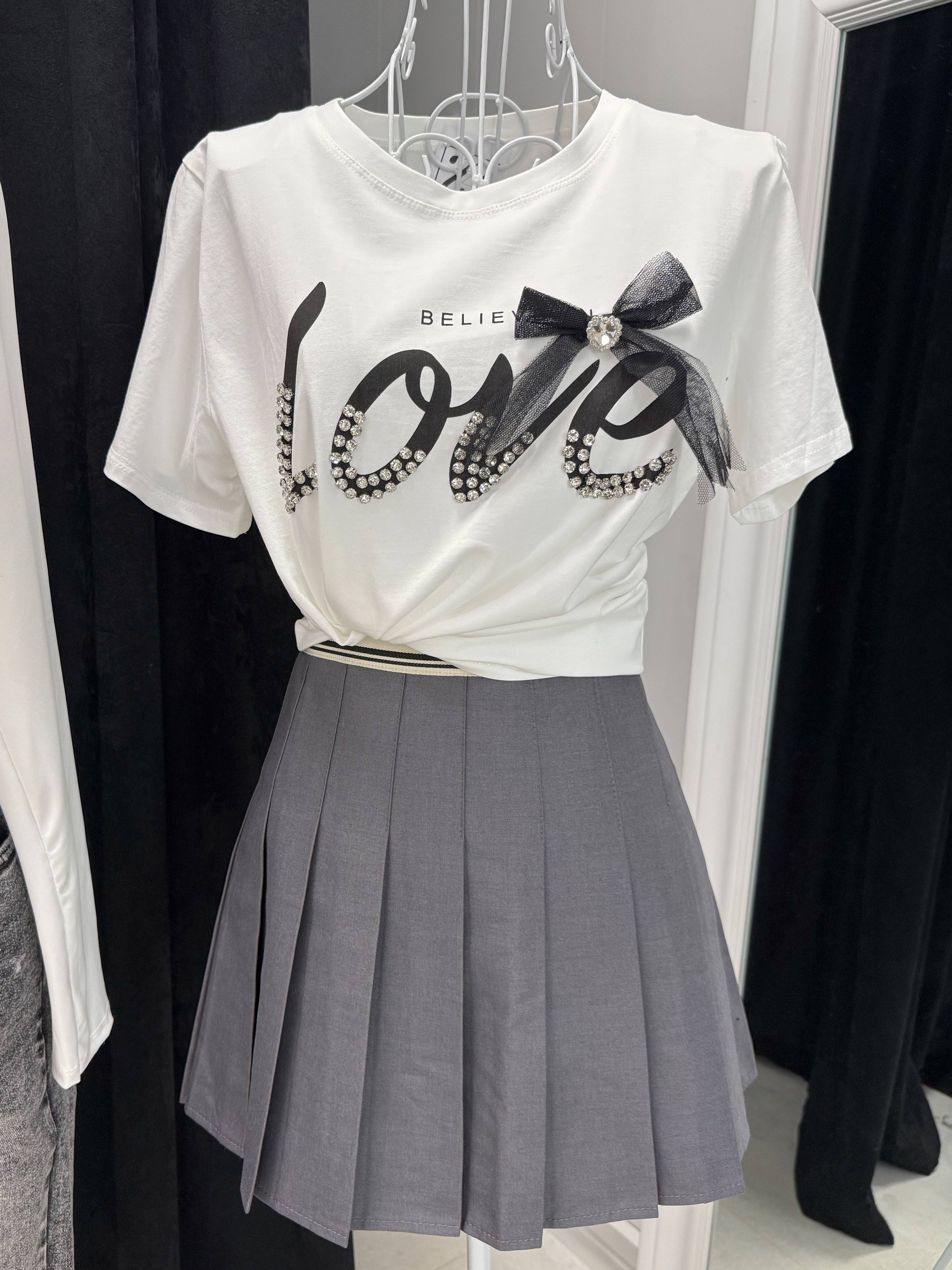 Лимитирана колекция тениска с надпис, панделка и ефектен камъни в предна част.