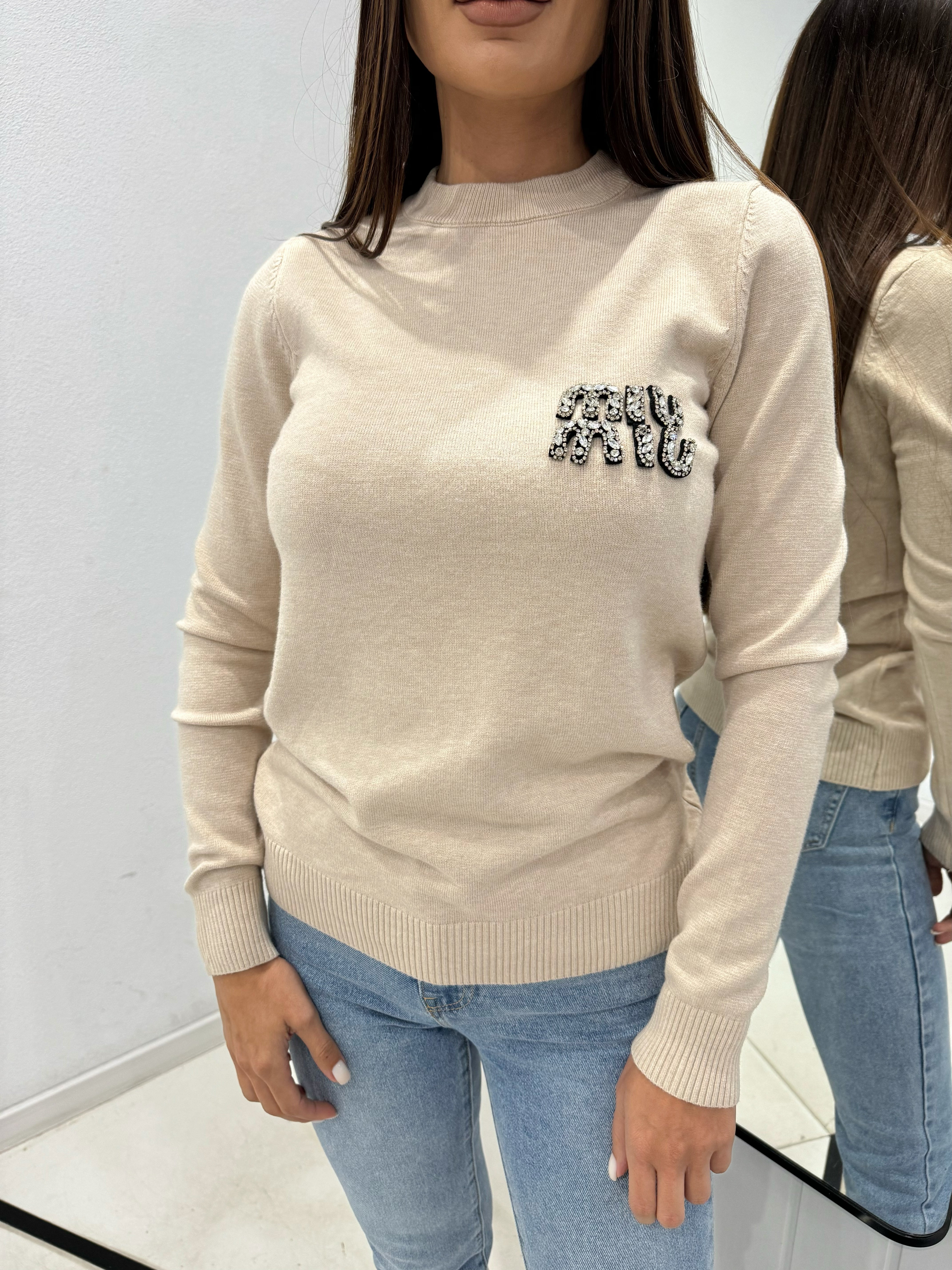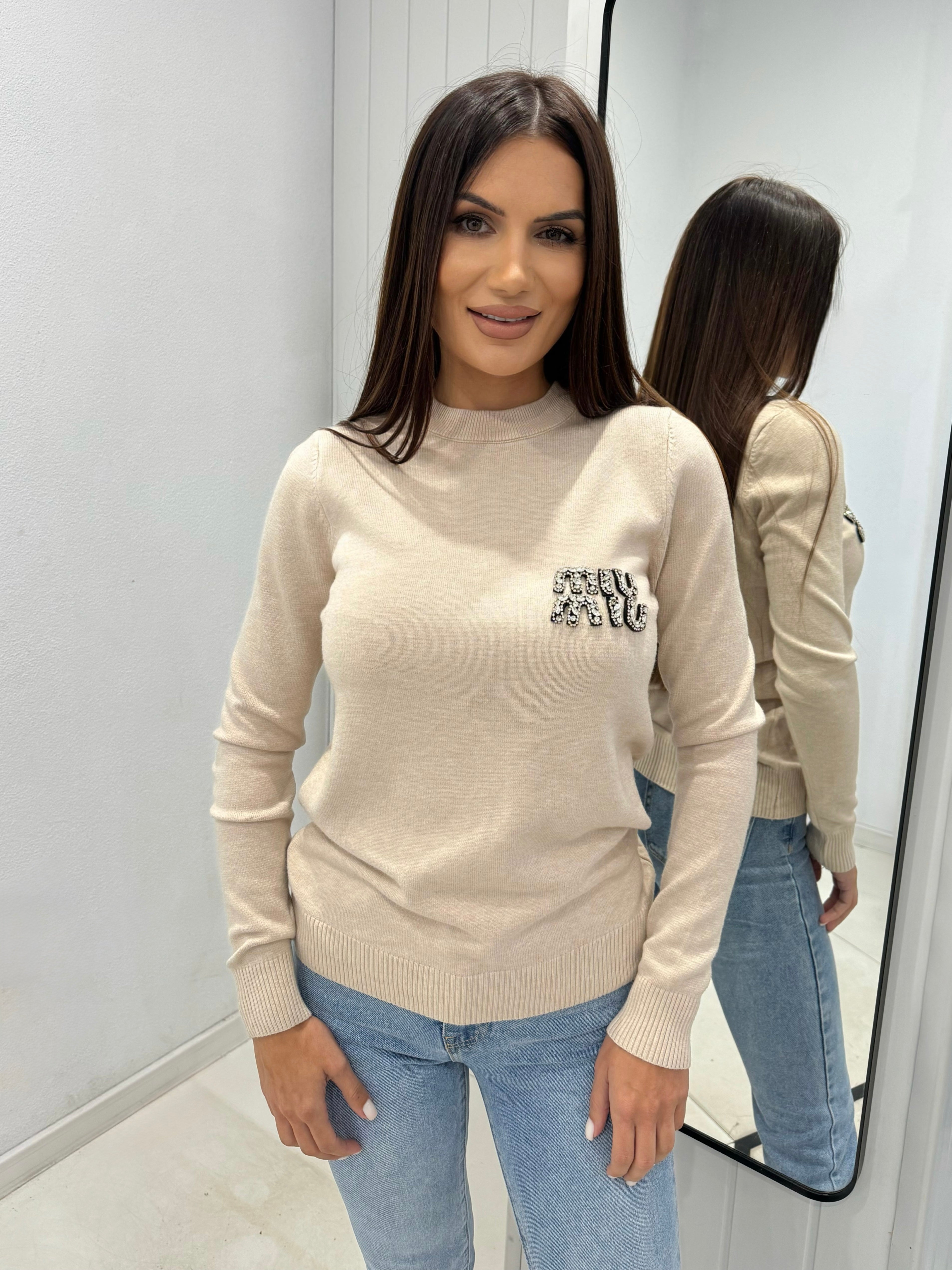 Стилна блуза с дълаг ръкав и акцент отпред – изящно лого, украсено с камъни за бляскав ефект. Моделът е изработен от мека и комфортна материя, която подчертава женствената визия и добавя елегантност към всяка комбинация – от ежедневен аутфит до вечерно излизане. Перфектен избор за модерни жени, които ценят детайла.