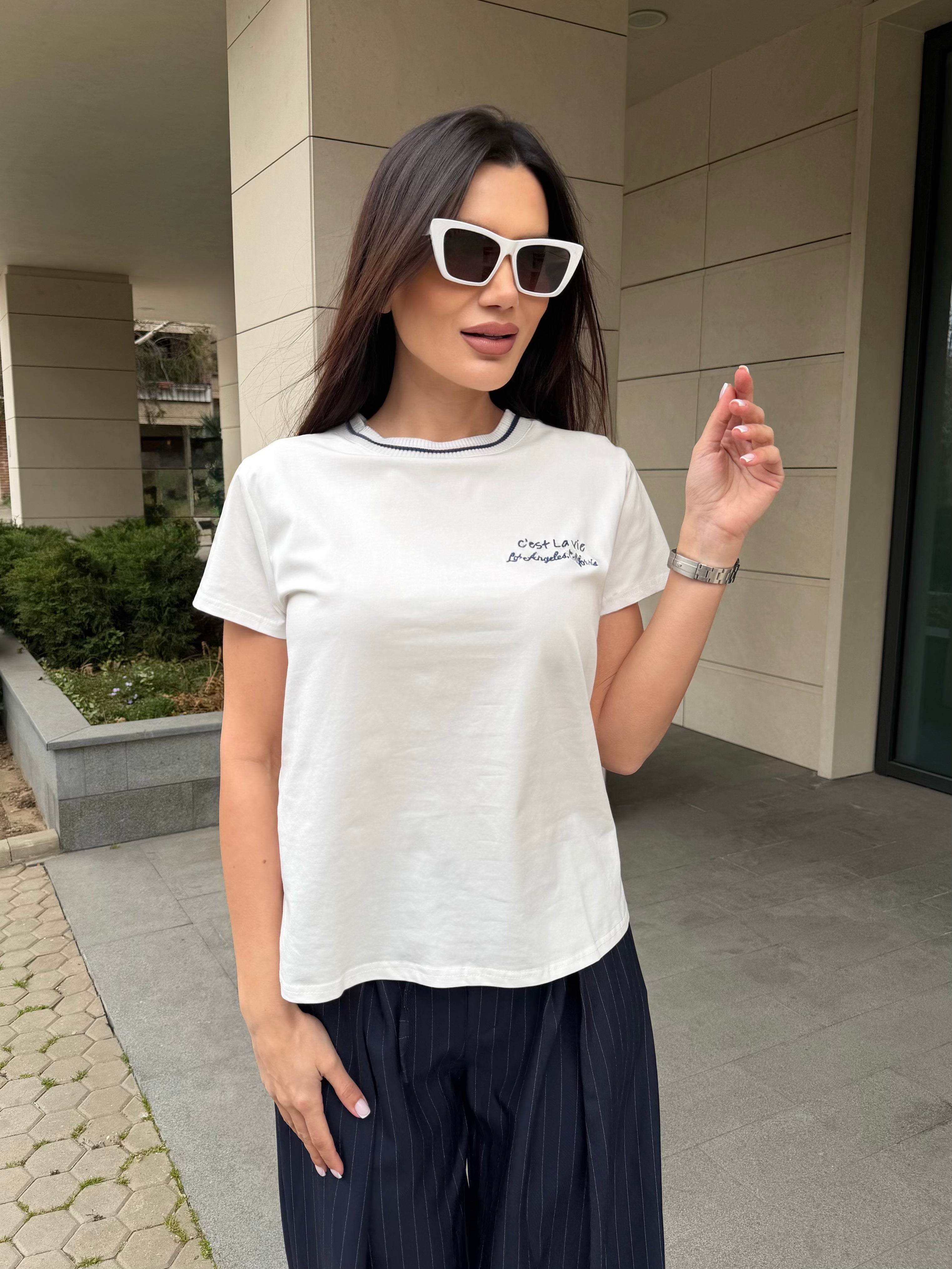 Стилна бяла тениска с деликатен надпис и фин контрастен детайл около деколтето, която придава effortless chic настроение. Изработена от мека и комфортна материя с лек еластан за перфектно прилягане и удобство през целия ден.