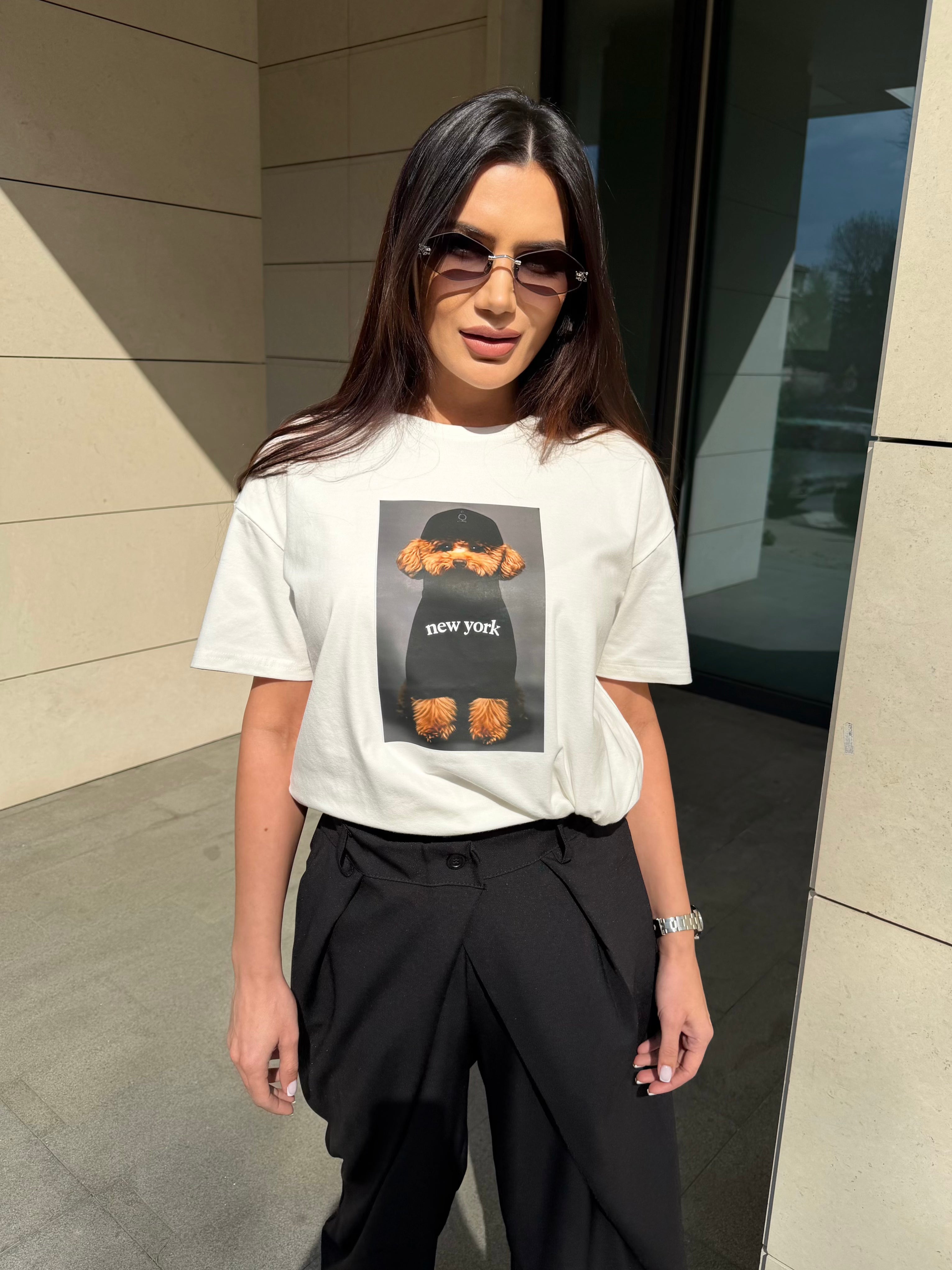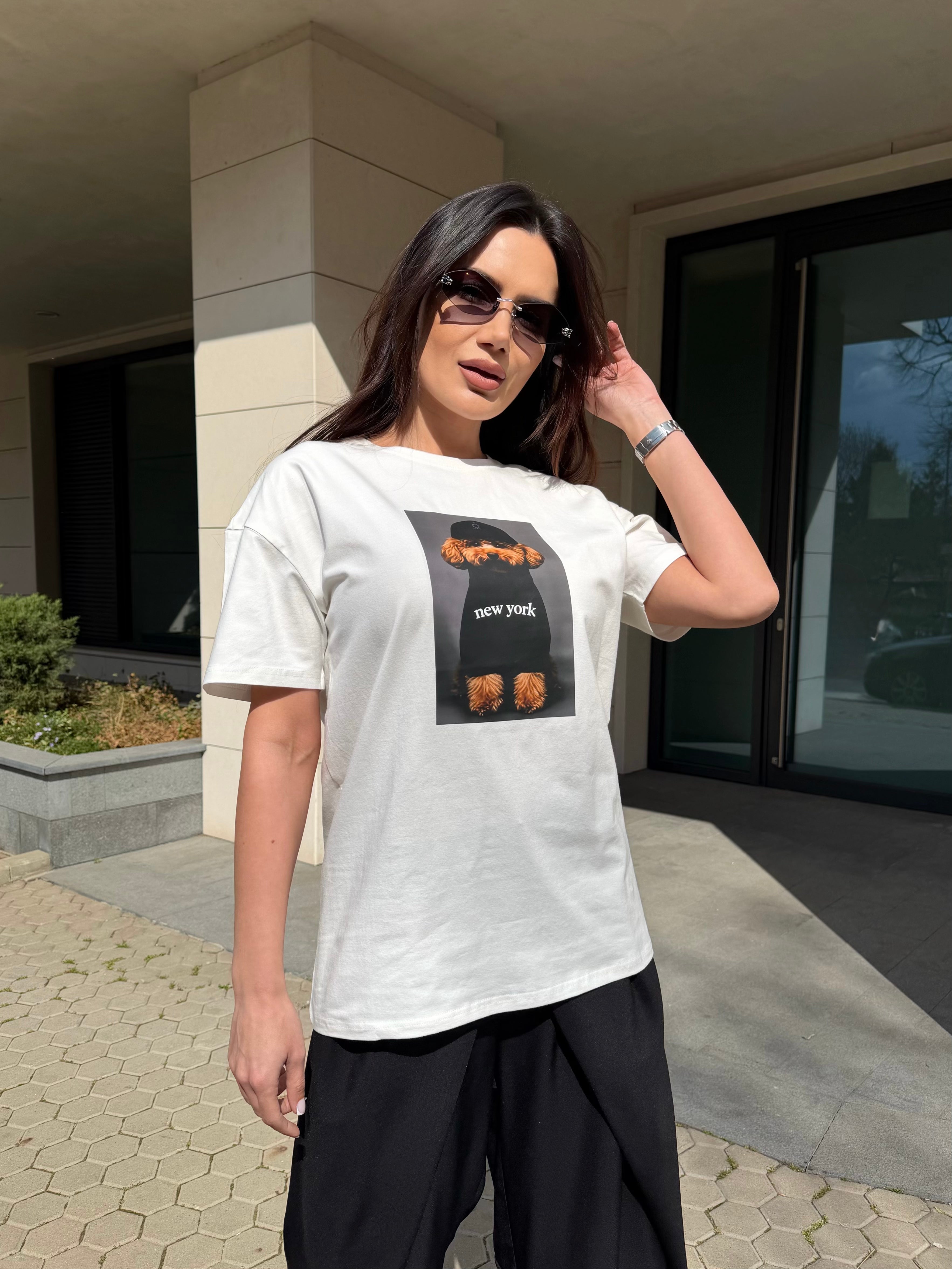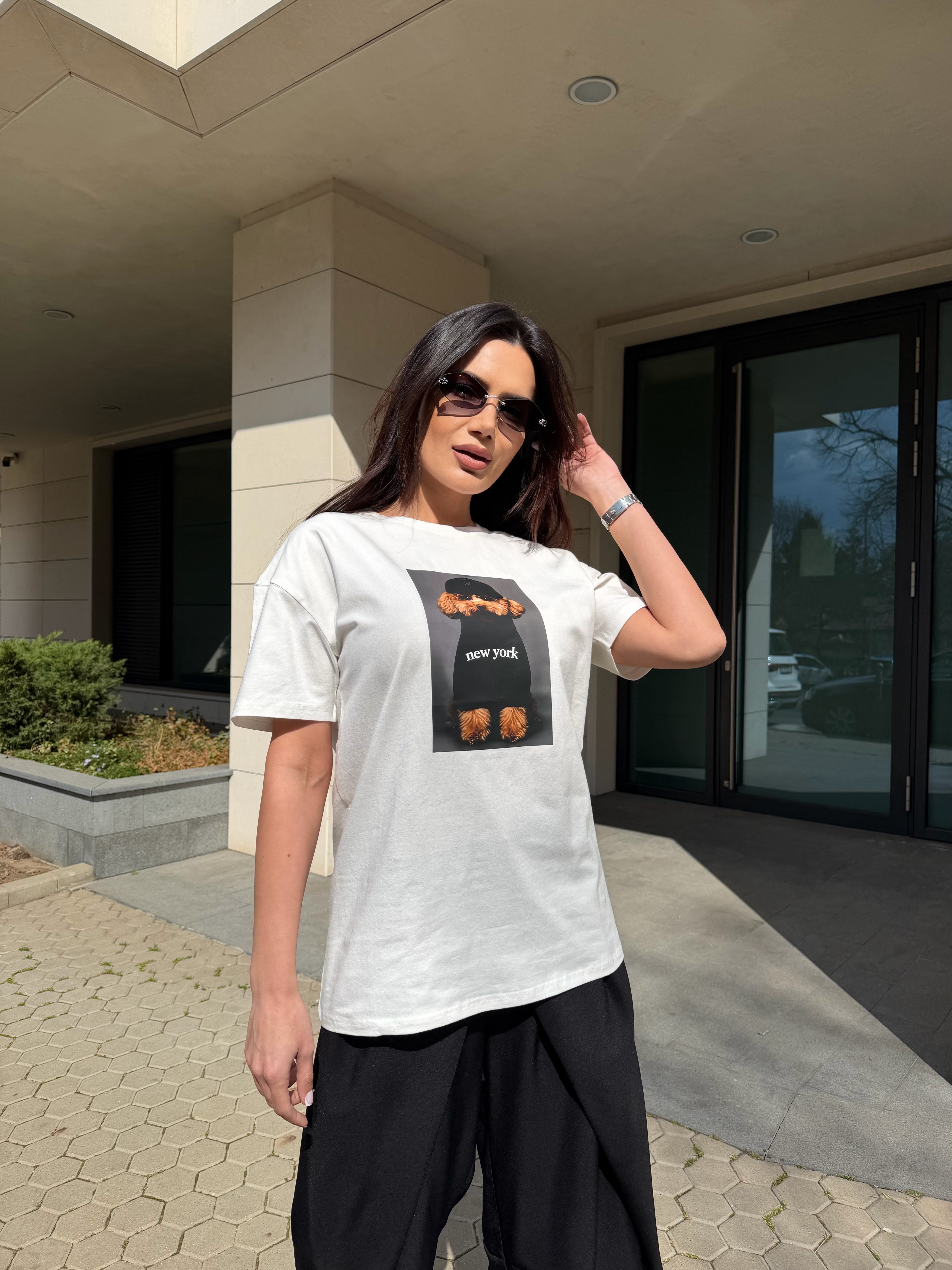 Мека памучна тениска с ефектен пудел принт и urban fashion настроение. Oversize правата линия създава effortless визия и прави модела лесен за комбиниране с деним, широк панталон, сако или casual сетове.