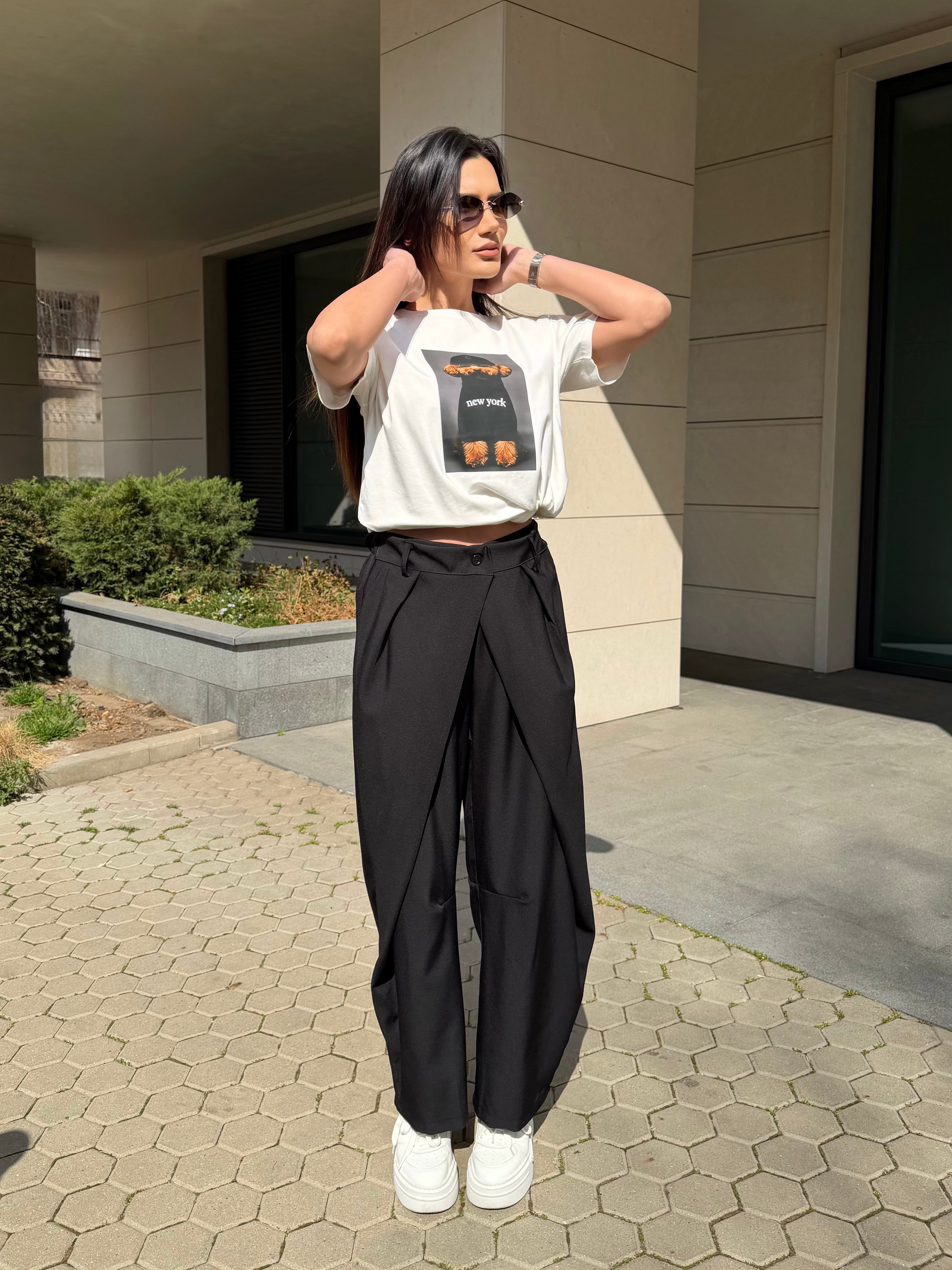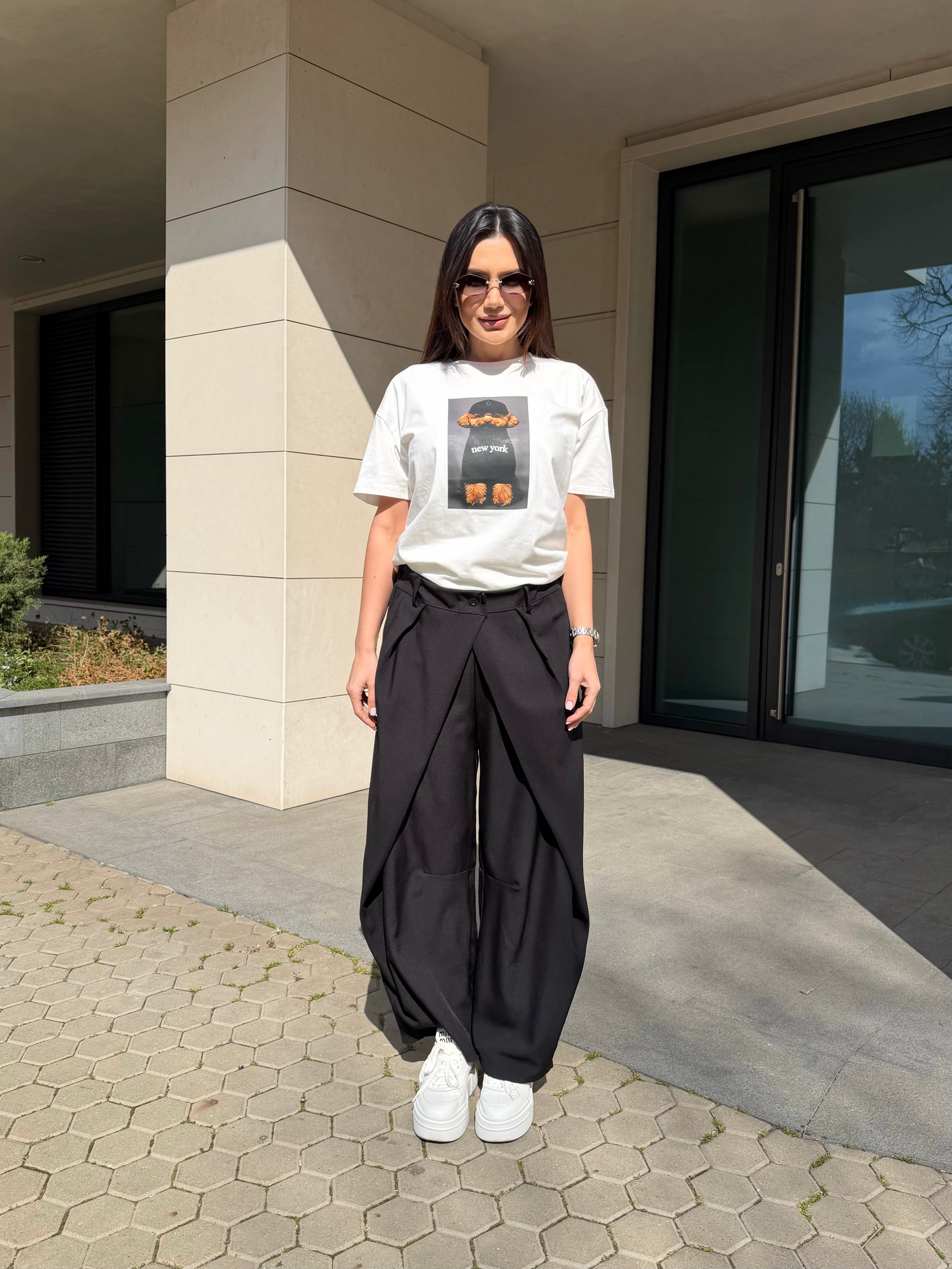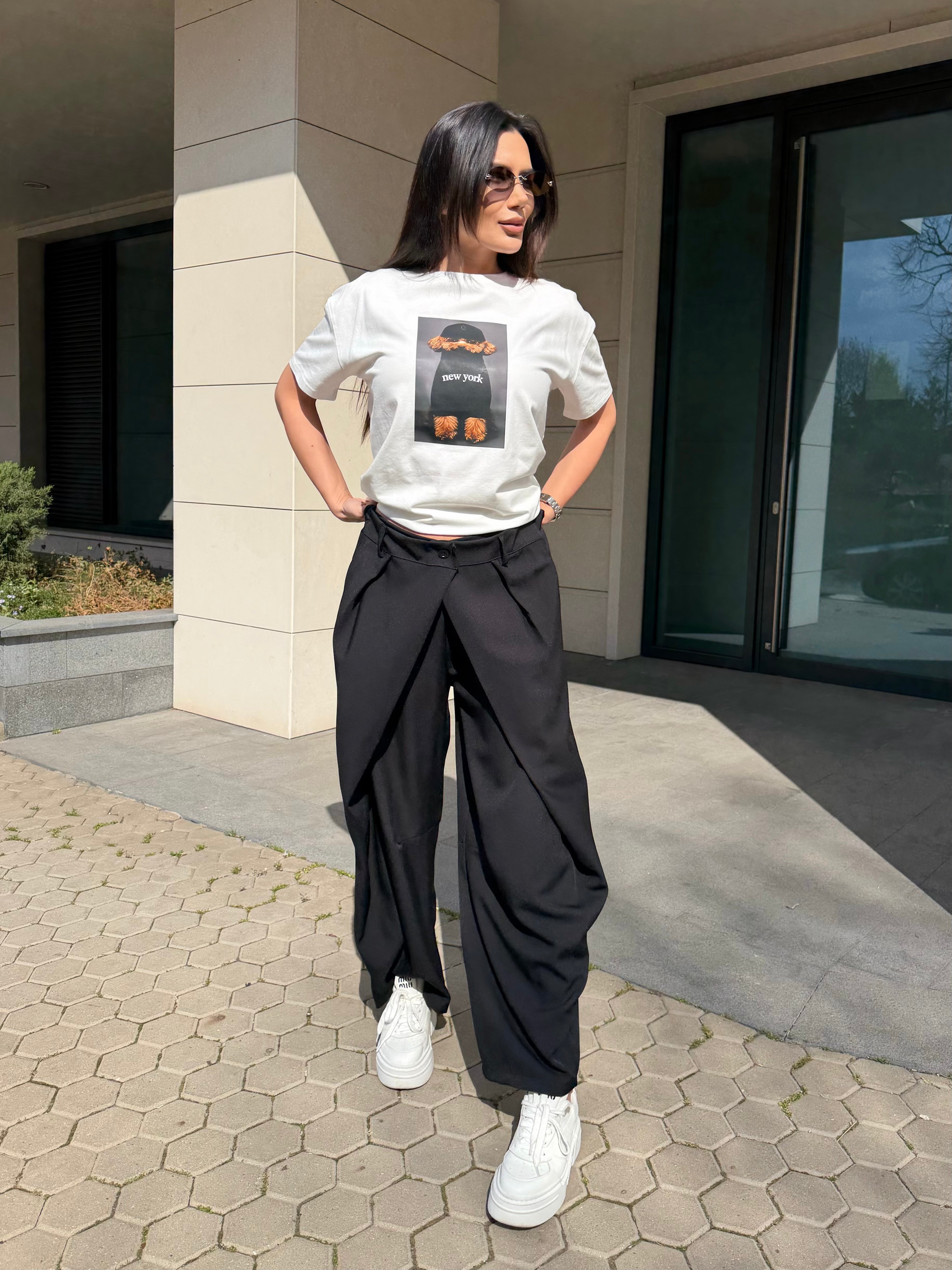 Мека памучна тениска с ефектен пудел принт и urban fashion настроение. Oversize правата линия създава effortless визия и прави модела лесен за комбиниране с деним, широк панталон, сако или casual сетове.