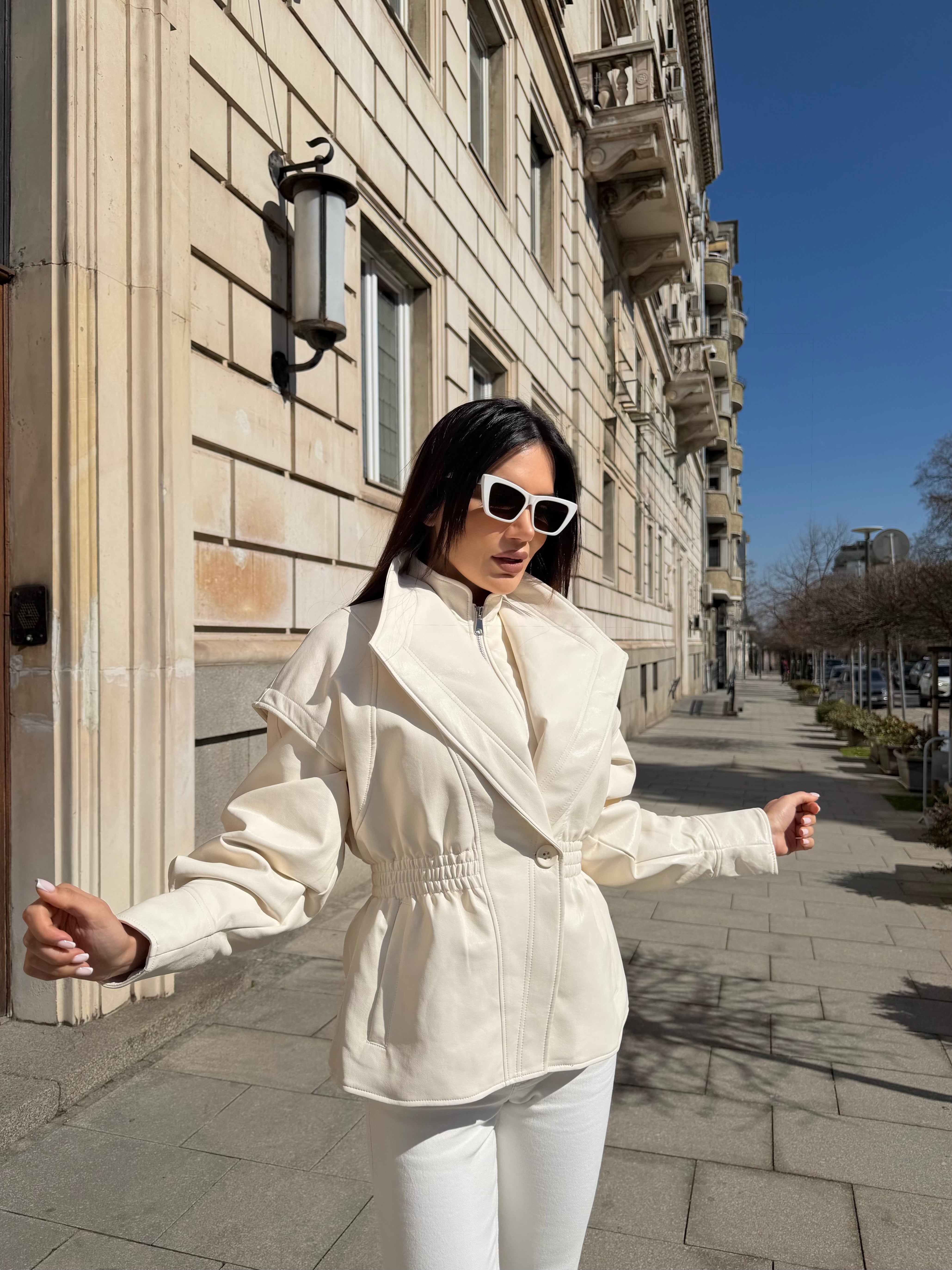 Модерен силует и впечатляващо присъствие. Това яке от еко кожа се отличава с обемни ръкави и пристягане в талията, което красиво подчертава фигурата. Луксозната изработка и елегантната линия го превръщат в must-have модел за сезона.