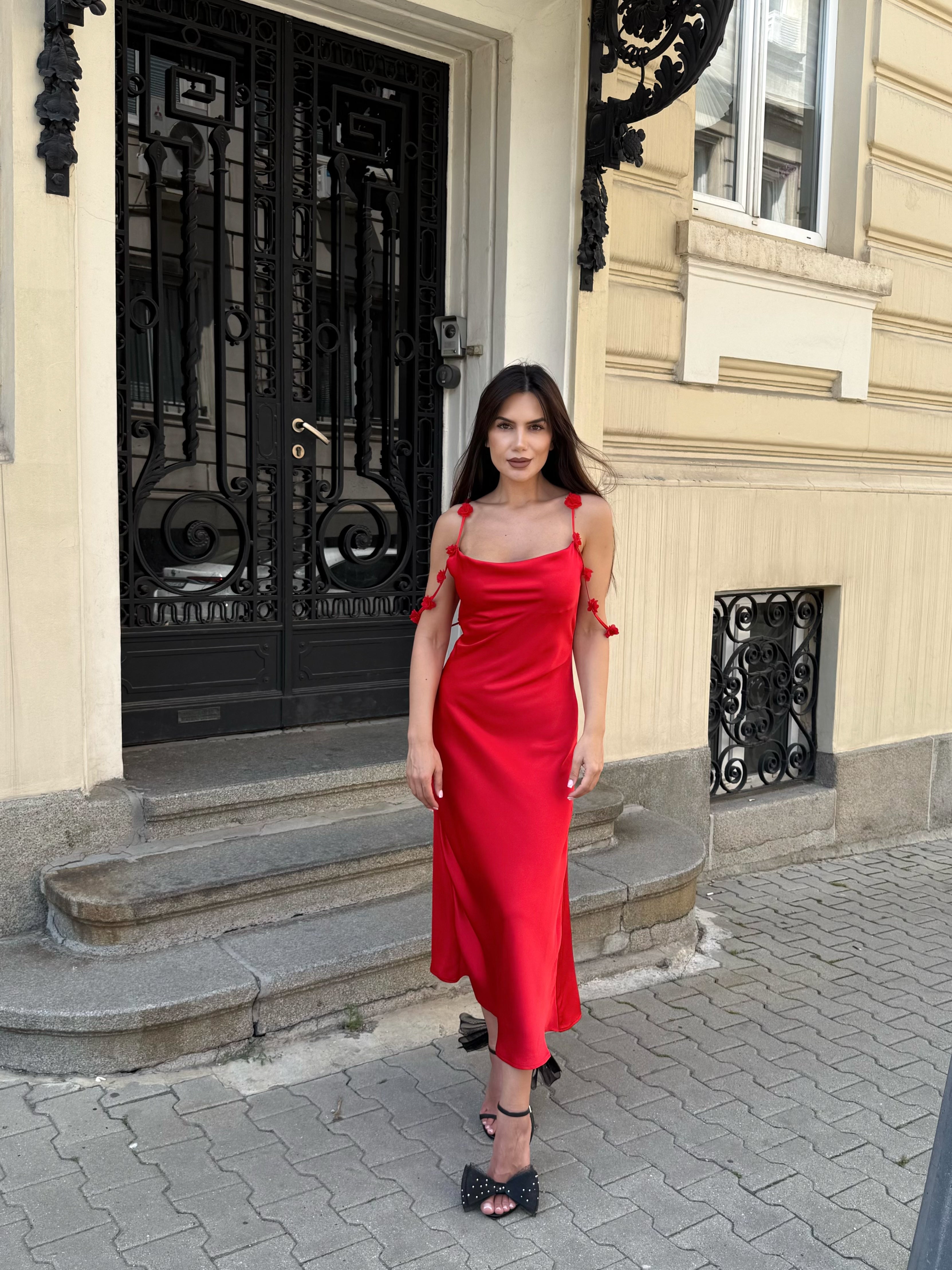 A clean look with romantic details – Roché Red is a dress that combines minimalism and femininity in a refined way. Made of soft, finely flowing satin fabric, it emphasizes the silhouette effortlessly. The thin straps with decorative flowers add a delicate accent and create a feeling of lightness and elegance.
