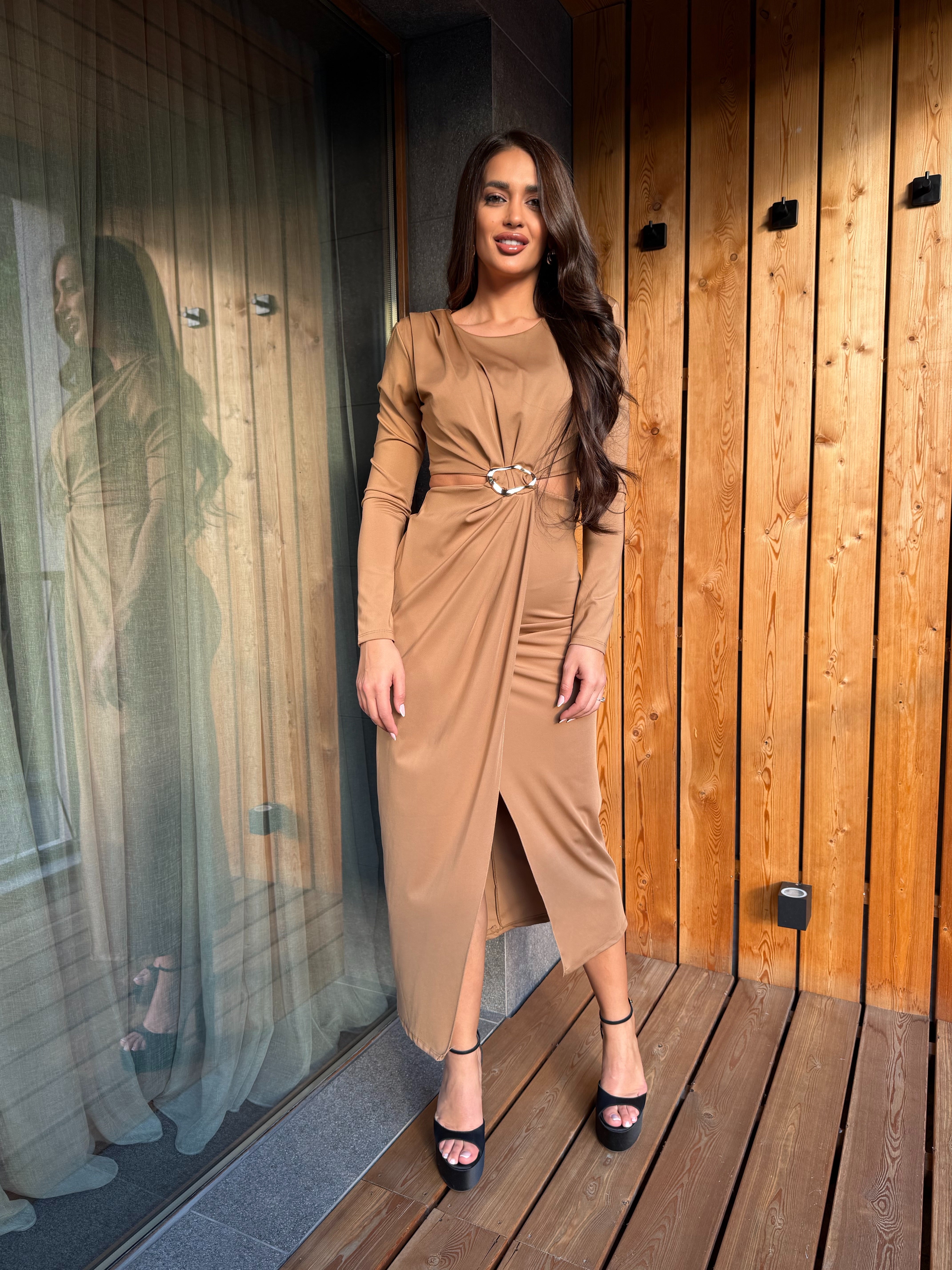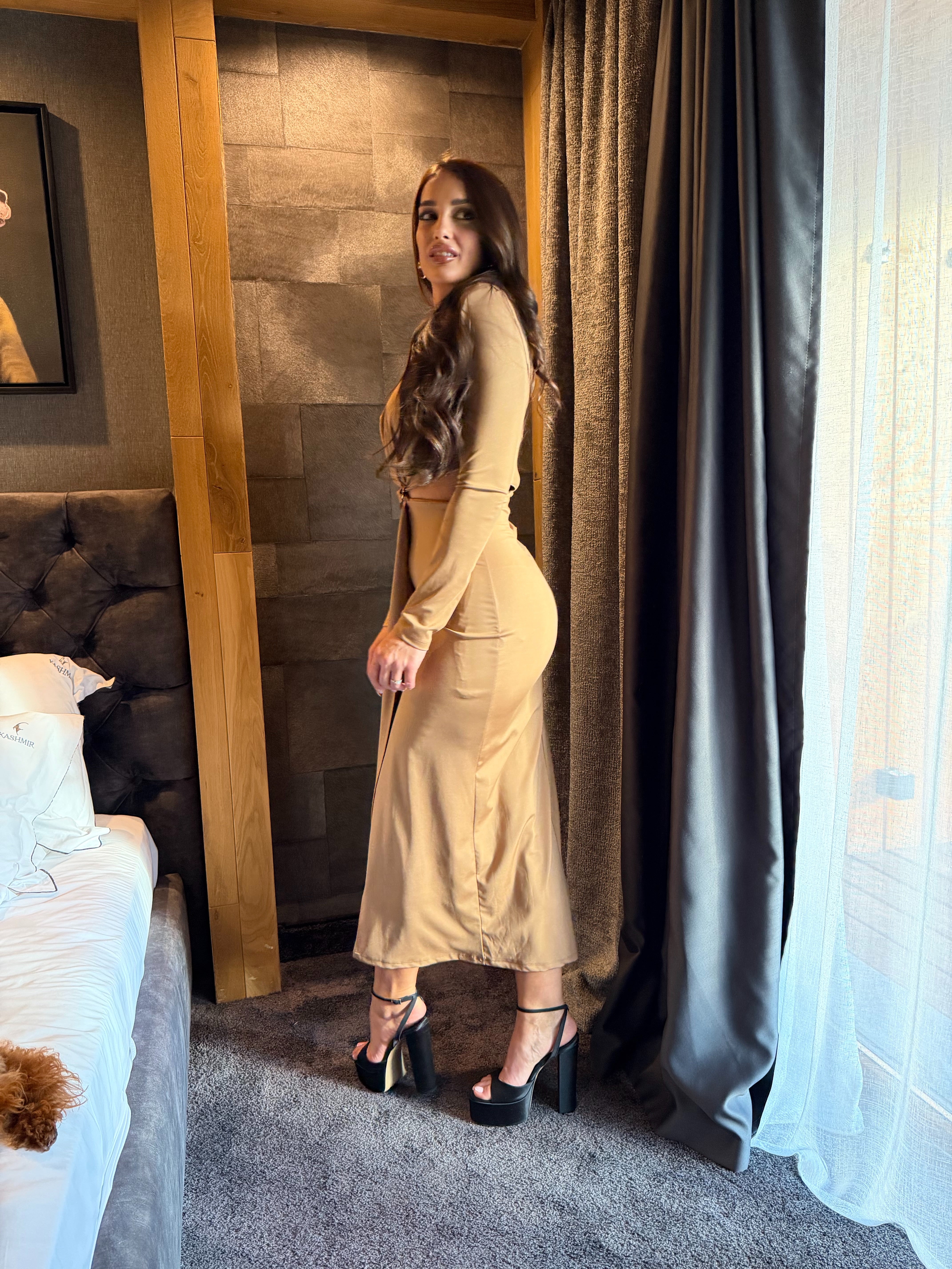 KIM GOLD dress is the perfect combination of elegance and minimalism. Made of fine, elastic fabric that emphasizes femininity and creates a slight draping effect. The gold detail at the waist gives a luxurious look and accentuates the silhouette. An ideal choice for special occasions, evening events or stylish daytime outings.